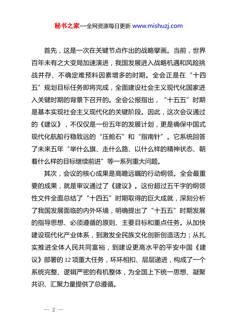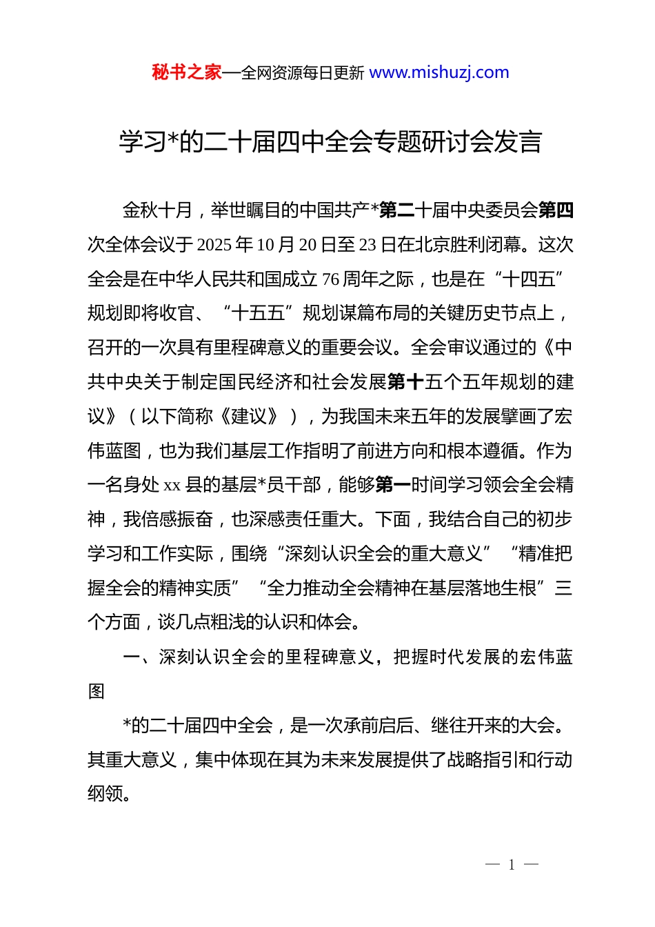 秘书之家—全网资源每日更新 www.mishuzj.com学习*的二十届四中全会专题研讨会发言金秋十月,举世瞩目的中国共产*第二十届中央委员会第四次全体会议于 2025 年 10 月 20 日至 23 日在北京胜利闭幕。这次全会是在中华人民共和国成立 76 周年之际,也是在“十四五”规划即将收官、“十五五”规划谋篇布局的关键历史节点上,召开的一次具有里程碑意义的重要会议。全会审议通过的《中共中央关于制定国民经济和社会发展第十五个五年规划的建议》(以下简称《建议》),为我国未来五年的发展擘画了宏伟蓝图,也为我们基层工作指明了前进方向和根本遵循。作为一名身处 xx 县的基层*员干部,能够第一时间学习领会全会精神,我倍感振奋,也深感责任重大。下面,我结合自己的初步学习和工作实际,围绕“深刻认识全会的重大意义”“精准把握全会的精神实质”“全力推动全会精神在基层落地生根”三个方面,谈几点粗浅的认识和体会。一、深刻认识全会的里程碑意义,把握时代发展的宏伟蓝图*的二十届四中全会,是一次承前启后、继往开来的大会。其重大意义,集中体现在其为未来发展提供了战略指引和行动纲领。— 1 —秘书之家—全网资源每日更新 www.mishuzj.com首先,这是一次在关键节点作出的战略擘画。当前,世界百年未有之大变局加速演进,我国发展进入战略机遇和风险挑战并存、不确定难预料因素增多的时期。全会正是在“十四五”规划目标任务即将完成,全面建设社会主义现代化国家进入关键时期的背景下召开的。全会公报指出,“十五五”时期是基本实现社会主义现代化的关键阶段。因此,这次会议通过的《建议》,不仅仅是一份五年的发展计划,更是确保中国式现代化航船行稳致远的“压舱石”和“指南针”。它系统回答了未来五年“举什么旗、走什么路、以什么样的精神状态、朝着什么样的目标继续前进”等一系列重大问题。其次,会议的核心成果是高瞻远瞩的行动纲领。全会最重要的成果,就是审议通过了《建议》。这份超过五千字的纲领性文件全面总结了“十四五”时期取得的巨大成就,深刻分析了我国发展面临的内外环境,明确提出了“十五五”时期发展的指导思想、必须遵循的原则、主要目标和重点任务。从加快建设现代化产业体系,到激发全民族文化创新创造活力;从扎实推进全体人民共同富裕,到建设更高水平的平安中国《建议》部署的 12 项重大任务,环环相扣、层层递进,构成了一个系统完整、逻辑严密的有机整体,为全国上下统一思想、凝聚共识、汇聚力量提供了总遵循。— 2 —秘书之家—全网资源每日更新 www.mishuzj.com最后,会议的召开本身就是一次信心的巨大提振。面对复杂的国际形势和艰巨的改革发展稳定任务,*中央高瞻远瞩,保持战略定力,科学谋划未来,这本身就向全*全国乃至全世界传递了强大的信心和底气。作为基层干部,学习全会公报,能够深切感受到*中央驾驭复杂局面的卓越智慧和强大能力,从而更加坚定了紧跟核心、砥砺前行的决心和信心。二、精准领会全会的精神实质,汲取砥砺前行的思想伟力学习全会精神,不能停留在表面,必须深入领会其核心要义和精神实质,真正用*的最新理论创新成果武装头脑。第一,要学深悟透“关键阶段”的新论断。全会明确提出,“十五五”时期是“基本实现社会主义现代化的关键阶段”,必须“确保取得决定性进展”。这个“关键阶段”和“决定性进展”的论断,具有极强的现实针对性和历史穿透力。它告诉我们,未来五年不再是寻常的五年,而是冲刺和攻坚的五年。这要求我们在思想上必须摒弃任何“歇歇脚、松口气”的念头,必须以“时时放心不下”的责任感和“时不我待”的紧迫感,投入到工作中去。对于我们 xx 县而言,这意味着必须抓住机遇,在产业转型、城乡融合、生态保护等领域取得突破性进展,才能跟上全国现代化建设的步伐。第二,要学深悟透“新质生产力”的新要求。全会强调,— 3 —秘书之家—全网资源每日更新 www.mishuzj.com要“加快高水平科技自立自强,引领发展新质生产力”。“新质生产力”是本次全会的一个高频词,也是推动高质量发展的核心驱动力。它区别于传统依靠资源消耗的生产力,核心在于科技创新。作...