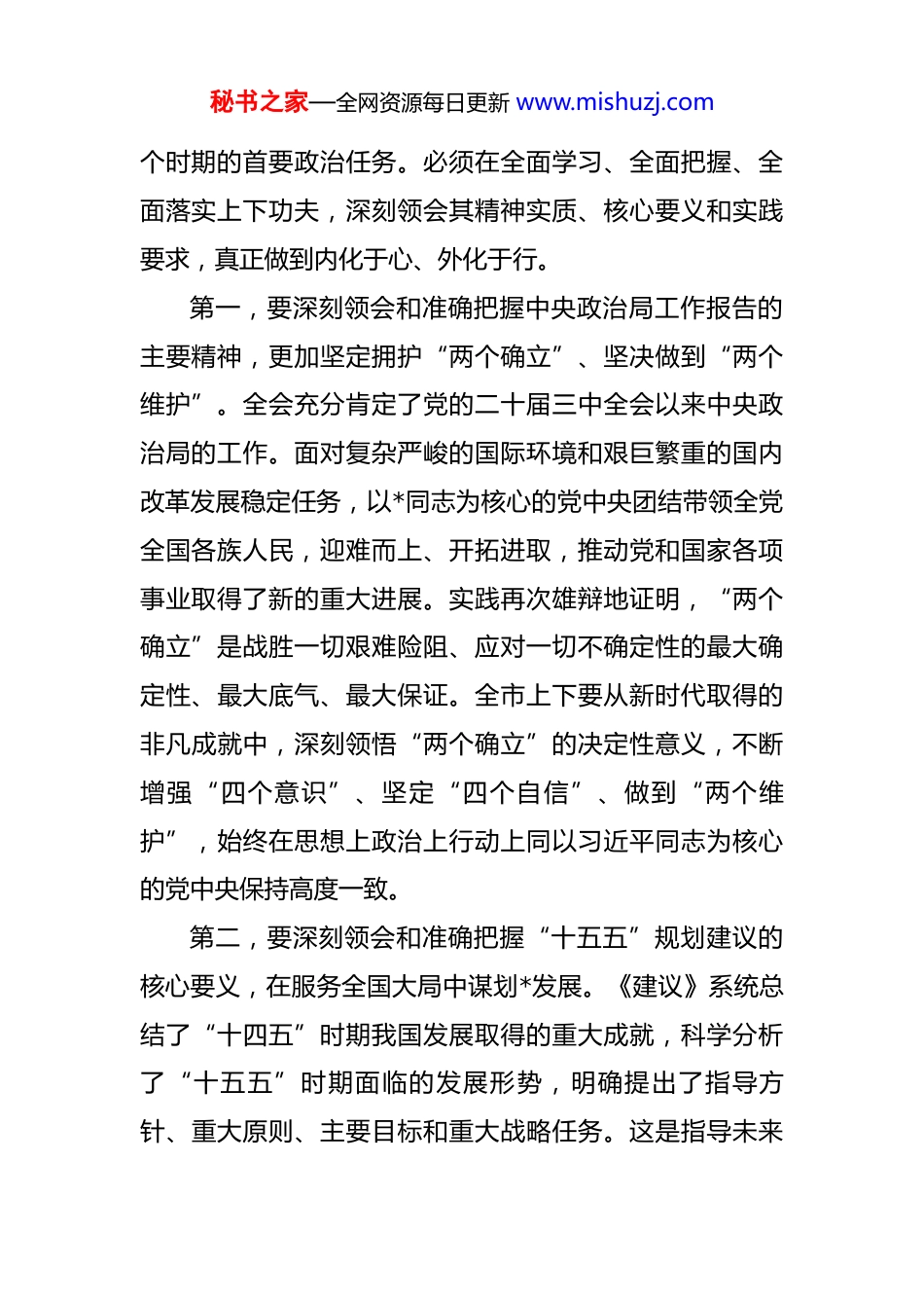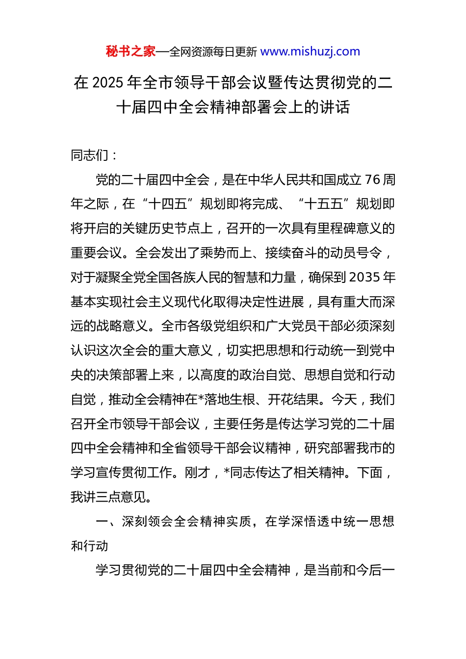 秘书之家—全网资源每日更新 www.mishuzj.com在 2025 年全市领导干部会议暨传达贯彻党的二十届四中全会精神部署会上的讲话 同志们:党的二十届四中全会,是在中华人民共和国成立 76 周年之际,在“十四五”规划即将完成、“十五五”规划即将开启的关键历史节点上,召开的一次具有里程碑意义的重要会议。全会发出了乘势而上、接续奋斗的动员号令,对于凝聚全党全国各族人民的智慧和力量,确保到 2035 年基本实现社会主义现代化取得决定性进展,具有重大而深远的战略意义。全市各级党组织和广大党员干部必须深刻认识这次全会的重大意义,切实把思想和行动统一到党中央的决策部署上来,以高度的政治自觉、思想自觉和行动自觉,推动全会精神在*落地生根、开花结果。今天,我们召开全市领导干部会议,主要任务是传达学习党的二十届四中全会精神和全省领导干部会议精神,研究部署我市的学习宣传贯彻工作。刚才,*同志传达了相关精神。下面,我讲三点意见。一、深刻领会全会精神实质,在学深悟透中统一思想和行动学习贯彻党的二十届四中全会精神,是当前和今后一秘书之家—全网资源每日更新 www.mishuzj.com个时期的首要政治任务。必须在全面学习、全面把握、全面落实上下功夫,深刻领会其精神实质、核心要义和实践要求,真正做到内化于心、外化于行。第一,要深刻领会和准确把握中央政治局工作报告的主要精神,更加坚定拥护“两个确立”、坚决做到“两个维护”。全会充分肯定了党的二十届三中全会以来中央政治局的工作。面对复杂严峻的国际环境和艰巨繁重的国内改革发展稳定任务,以*同志为核心的党中央团结带领全党全国各族人民,迎难而上、开拓进取,推动党和国家各项事业取得了新的重大进展。实践再次雄辩地证明,“两个确立”是战胜一切艰难险阻、应对一切不确定性的最大确定性、最大底气、最大保证。全市上下要从新时代取得的非凡成就中,深刻领悟“两个确立”的决定性意义,不断增强“四个意识”、坚定“四个自信”、做到“两个维护”,始终在思想上政治上行动上同以习近平同志为核心的党中央保持高度一致。第二,要深刻领会和准确把握“十五五”规划建议的核心要义,在服务全国大局中谋划*发展。《建议》系统总结了“十四五”时期我国发展取得的重大成就,科学分析了“十五五”时期面临的发展形势,明确提出了指导方针、重大原则、主要目标和重大战略任务。这是指导未来秘书之家—全网资源每日更新 www.mishuzj.com五年乃至更长时期我国经济社会发展的纲领性文件。在学习领会中,要重点把握几个方面:一是“十四五”的坚实基础,我国经济社会发展在攻坚克难中取得了举世瞩目的成就,为开启新征程奠定了坚实基础。二是“十五五”的关键定位,这是实现 2035 年远景目标的决定性五年,是推进中国式现代化的关键一程。三是面临的机遇与挑战,要坚持用全面、辩证、长远的眼光看待发展形势,既要看到风险挑战,更要看到有利条件和积极因素,坚定发展信心。四是战略任务的系统部署,要紧密结合*实际,将中央提出的重大战略任务细化、具体化,转化为推动高质量发展的实际行动,为实现全国“十五五”宏伟蓝图积极贡献*力量。第三,要深刻领会和准确把握*总书记重要讲话的实践要求,在对标对表中狠抓工作落实。习近平总书记的重要讲话高屋建瓴、思想深邃,具有极强的政治性、思想性、指导性,为我们抓好全会精神贯彻落实、做好当前和今后一个时期的工作提供了根本遵循。要深刻领会总书记关于学习贯彻全会精神的重要指示,以更高站位、更实举措,把学习成果转化为谋划发展的正确思路、促进发展的政策举措、领导发展的实际能力。要深刻领会总书记关于做好“十五五”规划编制工作的要求,坚持问计于民、问需于秘书之家—全网资源每日更新 www.mishuzj.com民,把加强顶层设计和坚持人民至上统一起来。要深刻领会总书记关于抓好年底收官工作的部署,确保党中央决策部署在*不折不扣落实到位。二、聚焦高质量发展首要任务,在担当实干中谱写现代化建设*新篇章学习贯彻全会精神,最终要落脚到推动高质量发展的实际成效上。必须紧密结合*市情,牢牢把握高质量发展这个首要任务,坚持稳中...
