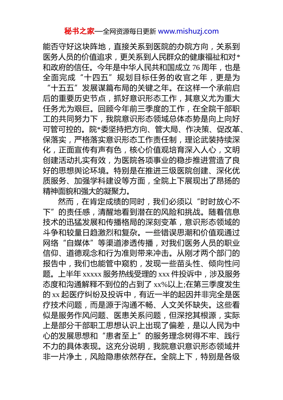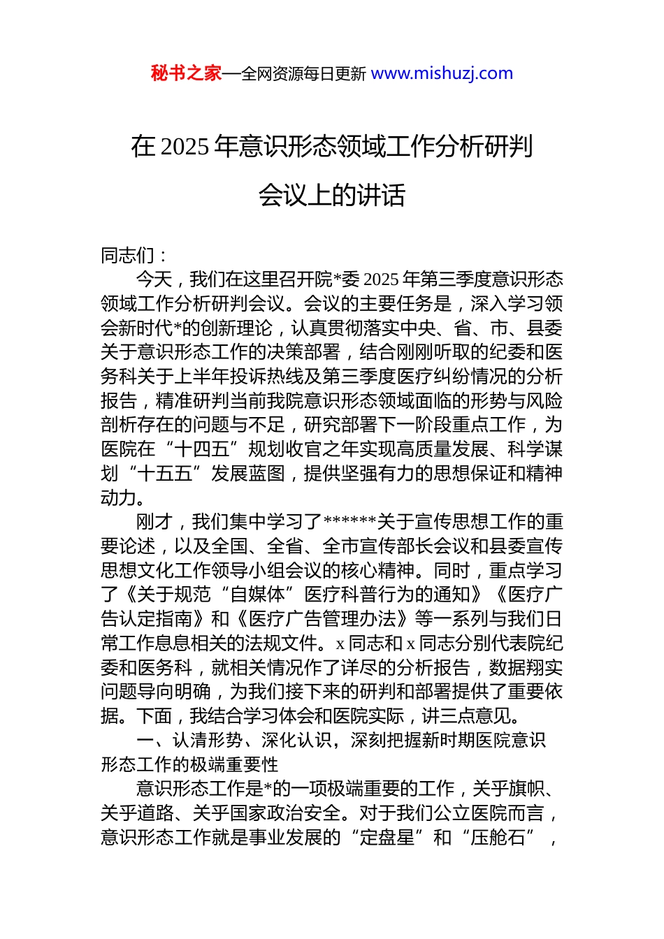 秘书之家—全网资源每日更新 www.mishuzj.com在 2025 年意识形态领域工作分析研判会议上的讲话同志们:今天,我们在这里召开院*委 2025 年第三季度意识形态领域工作分析研判会议。会议的主要任务是,深入学习领会新时代*的创新理论,认真贯彻落实中央、省、市、县委关于意识形态工作的决策部署,结合刚刚听取的纪委和医务科关于上半年投诉热线及第三季度医疗纠纷情况的分析报告,精准研判当前我院意识形态领域面临的形势与风险剖析存在的问题与不足,研究部署下一阶段重点工作,为医院在“十四五”规划收官之年实现高质量发展、科学谋划“十五五”发展蓝图,提供坚强有力的思想保证和精神动力。刚才,我们集中学习了******关于宣传思想工作的重要论述,以及全国、全省、全市宣传部长会议和县委宣传思想文化工作领导小组会议的核心精神。同时,重点学习了《关于规范“自媒体”医疗科普行为的通知》《医疗广告认定指南》和《医疗广告管理办法》等一系列与我们日常工作息息相关的法规文件。x 同志和 x 同志分别代表院纪委和医务科,就相关情况作了详尽的分析报告,数据翔实问题导向明确,为我们接下来的研判和部署提供了重要依据。下面,我结合学习体会和医院实际,讲三点意见。一、认清形势、深化认识,深刻把握新时期医院意识形态工作的极端重要性意识形态工作是*的一项极端重要的工作,关乎旗帜、关乎道路、关乎国家政治安全。对于我们公立医院而言,意识形态工作就是事业发展的“定盘星”和“压舱石”,秘书之家—全网资源每日更新 www.mishuzj.com能否守好这块阵地,直接关系到医院的办院方向,关系到医务人员的价值追求,更关系到人民群众的健康福祉和对*和政府的信任。今年是中华人民共和国成立 76 周年,也是全面完成“十四五”规划目标任务的收官之年,更是为“十五五”发展谋篇布局的关键之年。在这样一个承前启后的重要历史节点,抓好意识形态工作,其意义尤为重大任务尤为艰巨。回顾今年前三季度的工作,在全院干部职工的共同努力下,我院意识形态领域总体态势是向上向好可管可控的。院*委坚持把方向、管大局、作决策、促改革、保落实,严格落实意识形态工作责任制,理论武装持续深化,正面宣传有声有色,核心价值观培育深入人心,文明创建活动扎实有效,为医院各项事业的稳步推进营造了良好的思想舆论环境。特别是在推进三级医院创建、深化优质服务、加强学科建设等方面,全院上下展现出了昂扬的精神面貌和强大的凝聚力。然而,在肯定成绩的同时,我们必须以“时时放心不下”的责任感,清醒地看到潜在的风险和挑战。随着信息技术的迅猛发展和传播格局的深刻变革,意识形态领域的斗争和较量日趋激烈和复杂。一些错误思潮和价值观通过网络“自媒体”等渠道渗透传播,对我们医务人员的职业信仰、道德观念和行为准则带来冲击。从刚才两个部门的报告中,我们也能管中窥豹,发现一些苗头性、倾向性问题。上半年 xxxxx 服务热线受理的 xxx 件投诉中,涉及服务态度和沟通解释不到位的占到了 xx%以上;在第三季度发生的 xx 起医疗纠纷及投诉中,有近一半的起因并非完全是医疗技术问题,而是源于沟通不畅、人文关怀缺失。这些看似是服务作风问题、医患关系问题,但深挖其根源,实际上是部分干部职工思想认识上出现了偏差,是以人民为中心的发展思想和“患者至上”的服务理念树得不牢、践行不力的具体表现。这充分说明,我院意识意识形态领域并非一片净土,风险隐患依然存在。全院上下,特别是各级秘书之家—全网资源每日更新 www.mishuzj.com领导干部和*员同志,必须摒弃麻痹思想和侥幸心理,深刻认识到意识形态工作的长期性、复杂性和艰巨性,切实把思想和行动统一到中央和上级*委的决策部署上来,以最高的标准、最严的要求、最实的举措,牢牢掌握意识形态工作的领导权和主动权。二、直面问题、深挖根源,精准剖析当前意识形态领域存在的突出短板坚持问题导向是做好一切工作的前提。只有敢于正视问题、善于分析问题,才能找准症结、对症下药。结合日常观察、调研情况以及刚才的分析报告,当前我院意识形态领域主要存在以下四个方面的短板和不足,需要我们高度警...