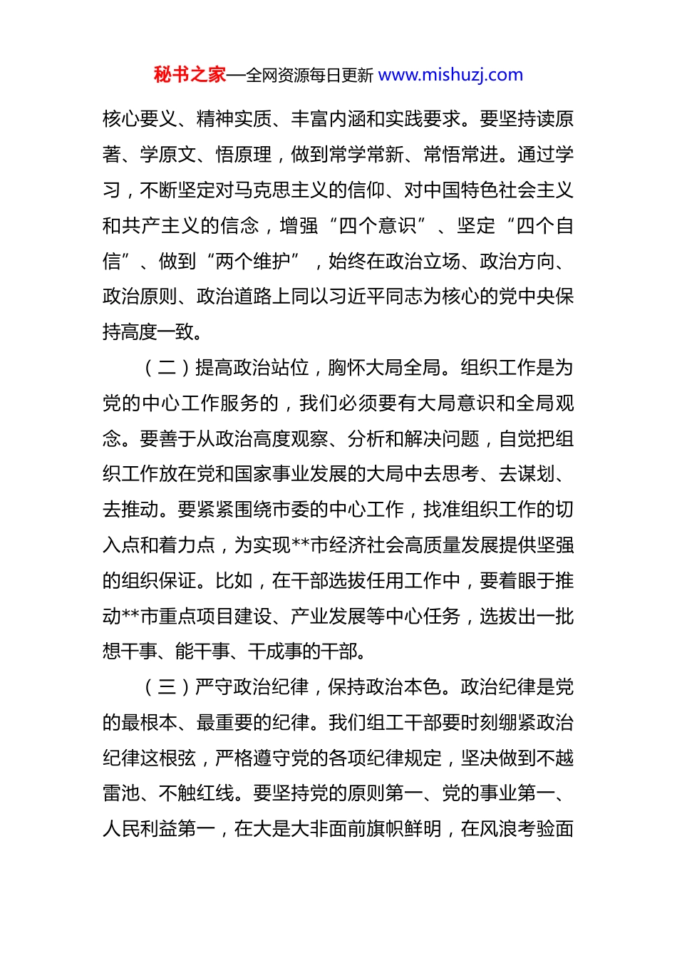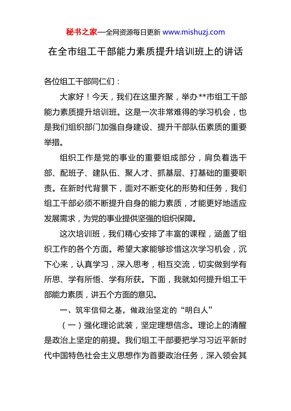 秘书之家—全网资源每日更新 www.mishuzj.com在全市组工干部能力素质提升培训班上的讲话 各位组工干部同仁们:大家好!今天,我们在这里齐聚,举办**市组工干部能力素质提升培训班。这是一次非常难得的学习机会,也是我们组织部门加强自身建设、提升干部队伍素质的重要举措。组织工作是党的事业的重要组成部分,肩负着选干部、配班子、建队伍、聚人才、抓基层、打基础的重要职责。在新时代背景下,面对不断变化的形势和任务,我们组工干部必须不断提升自身的能力素质,才能更好地适应发展需求,为党的事业提供坚强的组织保障。这次培训班,我们精心安排了丰富的课程,涵盖了组织工作的各个方面。希望大家能够珍惜这次学习机会,沉下心来,认真学习,深入思考,相互交流,切实做到学有所思、学有所悟、学有所获。下面,我就如何提升组工干部能力素质,讲五个方面的意见。一、筑牢信仰之基,做政治坚定的“明白人”(一)强化理论武装,坚定理想信念。理论上的清醒是政治上坚定的前提。我们组工干部要把学习习近平新时代中国特色社会主义思想作为首要政治任务,深入领会其秘书之家—全网资源每日更新 www.mishuzj.com核心要义、精神实质、丰富内涵和实践要求。要坚持读原著、学原文、悟原理,做到常学常新、常悟常进。通过学习,不断坚定对马克思主义的信仰、对中国特色社会主义和共产主义的信念,增强“四个意识”、坚定“四个自信”、做到“两个维护”,始终在政治立场、政治方向、政治原则、政治道路上同以习近平同志为核心的党中央保持高度一致。(二)提高政治站位,胸怀大局全局。组织工作是为党的中心工作服务的,我们必须要有大局意识和全局观念。要善于从政治高度观察、分析和解决问题,自觉把组织工作放在党和国家事业发展的大局中去思考、去谋划、去推动。要紧紧围绕市委的中心工作,找准组织工作的切入点和着力点,为实现**市经济社会高质量发展提供坚强的组织保证。比如,在干部选拔任用工作中,要着眼于推动**市重点项目建设、产业发展等中心任务,选拔出一批想干事、能干事、干成事的干部。(三)严守政治纪律,保持政治本色。政治纪律是党的最根本、最重要的纪律。我们组工干部要时刻绷紧政治纪律这根弦,严格遵守党的各项纪律规定,坚决做到不越雷池、不触红线。要坚持党的原则第一、党的事业第一、人民利益第一,在大是大非面前旗帜鲜明,在风浪考验面秘书之家—全网资源每日更新 www.mishuzj.com前无所畏惧,在各种诱惑面前立场坚定。要恪守组工干部“十严禁”要求,不封官许愿、不跑风漏气、不徇私舞弊,做一名一心为公、一身正气、一尘不染的组工干部。二、锤炼业务本领,做精通工作的“行家里手”(一)深钻细研政策法规。组织工作政策性强、程序性严,我们组工干部必须熟练掌握相关的政策法规和业务知识。要认真学习干部选拔任用、公务员管理、基层党建、人才工作等方面的政策文件,做到政策熟透、业务精通。要不断更新知识结构,及时了解和掌握组织工作的新政策、新规定、新要求,不断提高业务水平和工作能力。比如,在干部选拔任用工作中,要严格按照《党政领导干部选拔任用工作条例》等规定,规范选拔任用程序,确保选人用人公正公平。(二)注重实践锻炼。实践是最好的课堂,也是提高能力的根本途径。我们组工干部要主动投身到组织工作的实践中去,在实践中积累经验、增长才干。要敢于承担急难险重任务,在解决复杂问题、应对突发事件中锻炼自己的能力。要深入基层、深入群众,了解基层实际情况,倾听群众意见建议,不断提高做好群众工作的能力。比如,在基层党建工作中,要经常深入到农村、社区、企业等基层党组织,指导帮助他们解决实际问题,推动基层党建工秘书之家—全网资源每日更新 www.mishuzj.com作不断创新发展。(三)加强学习交流。学习是一个不断积累和进步的过程。我们组工干部要树立终身学习的理念,养成良好的学习习惯。要加强与同事之间的学习交流,相互学习、相互借鉴、共同提高。要积极参加各种培训、研讨、交流活动,拓宽视野、开阔思路。要善于学习借鉴其他地区、其他部门的好经验、好做法,结合本地实际,创造性地开展工作。比...