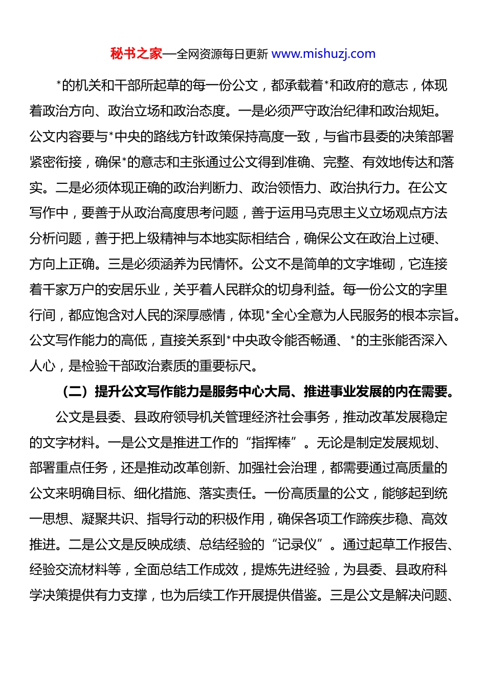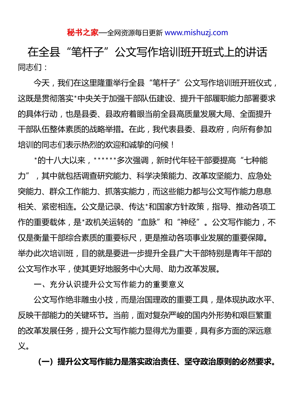 秘书之家—全网资源每日更新 www.mishuzj.com在全县“笔杆子”公文写作培训班开班式上的讲话同志们:今天,我们在这里隆重举行全县“笔杆子”公文写作培训班开班仪式,这既是贯彻落实*中央关于加强干部队伍建设、提升干部履职能力部署要求的具体行动,也是县委、县政府着眼当前全县高质量发展大局、全面提升干部队伍整体素质的战略举措。在此,我代表县委、县政府,向所有参加培训的同志们表示热烈的欢迎和诚挚的问候!*的十八大以来,******多次强调,新时代年轻干部要提高“七种能力”,其中就包括调查研究能力、科学决策能力、改革攻坚能力、应急处突能力、群众工作能力、抓落实能力,而这些能力都与公文写作能力息息相关、紧密相连。公文是记录、传达*和国家方针政策,指导、推动各项工作的重要载体,是*政机关运转的“血脉”和“神经”。公文写作能力,不仅是衡量干部综合素质的重要标尺,更是推动各项事业发展的重要保障。举办此次培训班,目的就是要进一步提升全县广大干部特别是青年干部的公文写作水平,使其更好地服务中心大局、助力改革发展。一、充分认识提升公文写作能力的重要意义公文写作绝非雕虫小技,而是治国理政的重要工具,是体现执政水平、反映干部能力的关键环节。当前,面对复杂严峻的国内外形势和艰巨繁重的改革发展任务,提升公文写作能力显得尤为重要,具有多方面的深远意义。(一)提升公文写作能力是落实政治责任、坚守政治原则的必然要求。秘书之家—全网资源每日更新 www.mishuzj.com*的机关和干部所起草的每一份公文,都承载着*和政府的意志,体现着政治方向、政治立场和政治态度。一是必须严守政治纪律和政治规矩。公文内容要与*中央的路线方针政策保持高度一致,与省市县委的决策部署紧密衔接,确保*的意志和主张通过公文得到准确、完整、有效地传达和落实。二是必须体现正确的政治判断力、政治领悟力、政治执行力。在公文写作中,要善于从政治高度思考问题,善于运用马克思主义立场观点方法分析问题,善于把上级精神与本地实际相结合,确保公文在政治上过硬、方向上正确。三是必须涵养为民情怀。公文不是简单的文字堆砌,它连接着千家万户的安居乐业,关乎着人民群众的切身利益。每一份公文的字里行间,都应饱含对人民的深厚感情,体现*全心全意为人民服务的根本宗旨。公文写作能力的高低,直接关系到*中央政令能否畅通、*的主张能否深入人心,是检验干部政治素质的重要标尺。(二)提升公文写作能力是服务中心大局、推进事业发展的内在需要。公文是县委、县政府领导机关管理经济社会事务,推动改革发展稳定的文字材料。一是公文是推进工作的“指挥棒”。无论是制定发展规划、部署重点任务,还是推动改革创新、加强社会治理,都需要通过高质量的公文来明确目标、细化措施、落实责任。一份高质量的公文,能够起到统一思想、凝聚共识、指导行动的积极作用,确保各项工作蹄疾步稳、高效推进。二是公文是反映成绩、总结经验的“记录仪”。通过起草工作报告、经验交流材料等,全面总结工作成效,提炼先进经验,为县委、县政府科学决策提供有力支撑,也为后续工作开展提供借鉴。三是公文是解决问题、秘书之家—全网资源每日更新 www.mishuzj.com推动落实的“助推器”。在处理复杂问题、协调各方关系、化解矛盾风险时,严谨规范的公文能够明确职责、厘清权限,有效推动问题的解决和工作的落实。公文写作能力的强弱,直接影响到县委、县政府各项决策部署的执行效率和最终效果。(三)提升公文写作能力是展示干部形象、提升机关效能的现实要求。公文是机关工作的直接产物,是展现干部能力水平和机关整体形象的窗口。一是公文是干部能力素质的“晴雨表”。一份逻辑清晰、文风朴实、措辞严谨的公文,能够充分展现干部过硬的专业素养、扎实的文字功底和深入的思考能力。反之,一篇错漏百出、言语空泛的公文,则会大大拉低干部乃至整个机关的形象。二是公文是提升机关效能的“催化剂”。高水平的公文能够有效避免歧义,减少沟通成本,提高办理效率,从而提升机关整体的运行效能。规范的公文能够确保政令畅通,减少因理解偏差而造成的执行走样,保障各项工作...