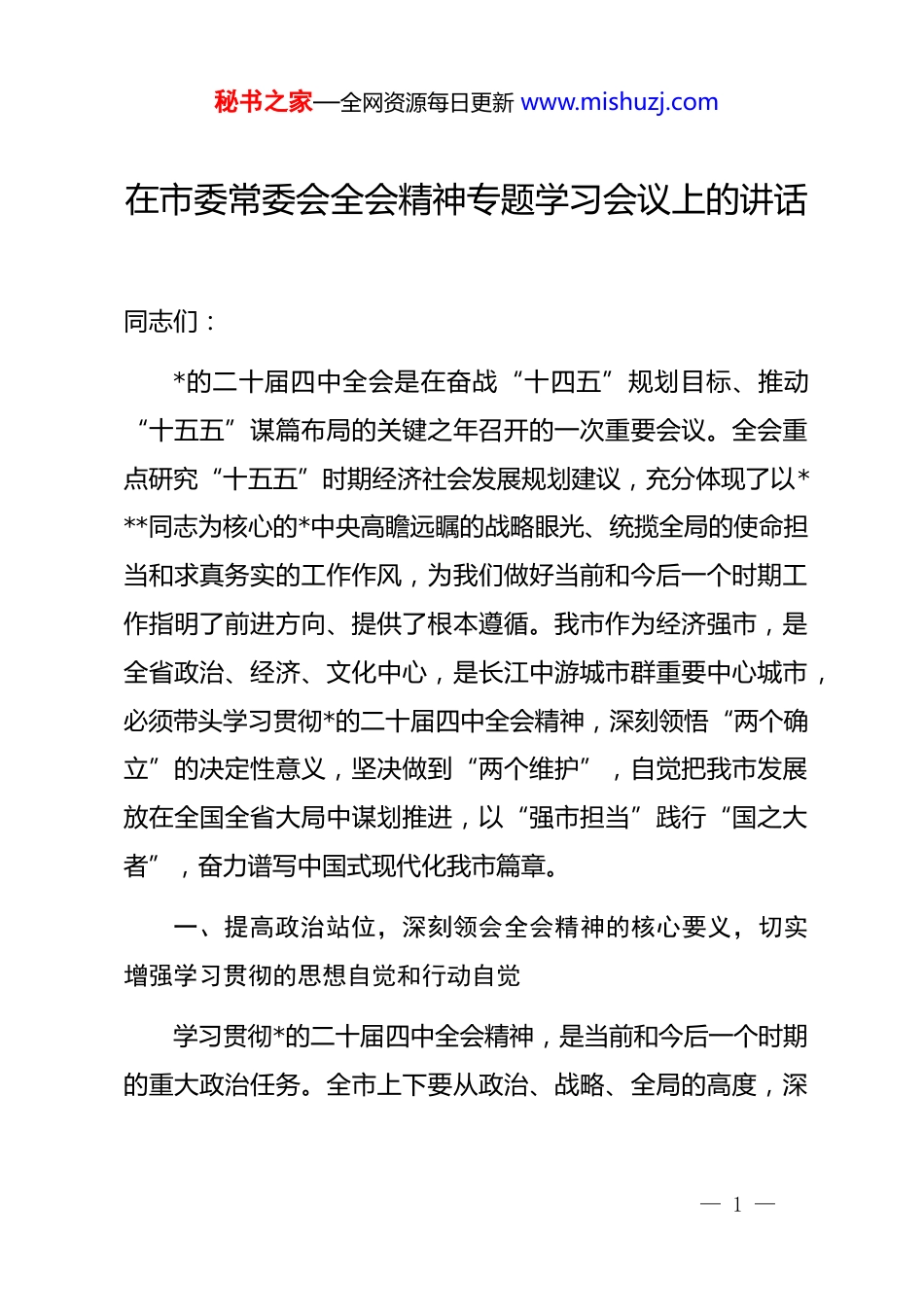 秘书之家—全网资源每日更新 www.mishuzj.com在市委常委会全会精神专题学习会议上的讲话同志们:*的二十届四中全会是在奋战“十四五”规划目标、推动“十五五”谋篇布局的关键之年召开的一次重要会议。全会重点研究“十五五”时期经济社会发展规划建议,充分体现了以***同志为核心的*中央高瞻远瞩的战略眼光、统揽全局的使命担当和求真务实的工作作风,为我们做好当前和今后一个时期工作指明了前进方向、提供了根本遵循。我市作为经济强市,是全省政治、经济、文化中心,是长江中游城市群重要中心城市,必须带头学习贯彻*的二十届四中全会精神,深刻领悟“两个确立”的决定性意义,坚决做到“两个维护”,自觉把我市发展放在全国全省大局中谋划推进,以“强市担当”践行“国之大者”,奋力谱写中国式现代化我市篇章。一、提高政治站位,深刻领会全会精神的核心要义,切实增强学习贯彻的思想自觉和行动自觉学习贯彻*的二十届四中全会精神,是当前和今后一个时期的重大政治任务。全市上下要从政治、战略、全局的高度,深— 1 —秘书之家—全网资源每日更新 www.mishuzj.com刻领会全会精神的丰富内涵和实践要求,切实把思想和行动统一到*中央决策部署上来。(一)深刻领会全会的重大政治意义、历史意义、实践意义。全会审议通过的《中共中央关于制定国民经济和社会发展第十五个五年规划和二〇三五年远景目标的建议》,是指导未来 5 年乃至更长时期我国经济社会发展的纲领性文件。******在全会上的重要讲话,科学回答了关系*和国家事业发展的一系列重大理论和实践问题,为我们指明了前进方向、提供了根本遵循。我们要深刻认识到,全会的召开对于动员全*全国各族人民坚定信心、同心同德,踔厉奋发、勇毅前行,为全面建设社会主义现代化国家、全面推进中华民族伟大复兴而团结奋斗,具有重大而深远的意义。(二)深刻领会“十四五”时期我国发展取得的历史性成就。全会系统总结了“十四五”时期我国经济社会发展的重大成就,这些成就的取得,根本在于有******作为*中央的核心、全*的核心掌舵领航,在于有**************思想科学指引。我市作为革命老区经济强市,“十四五”时期经济社会发展也取得了显著成效,地区生产总值突破 7000 亿元大关,人均 gdp 超过 1.2 万美元,高新技术企业数量翻番,城市功能品质持续提— 2 —秘书之家—全网资源每日更新 www.mishuzj.com升,民生福祉不断增进。这些成绩的取得,是**************思想在我市落地生根的生动实践,是全市上下团结奋斗的结果。(三)深刻领会“十五五”时期的战略定位和目标任务。全会明确了“十五五”时期经济社会发展的指导方针、主要目标、战略任务和重大举措,强调要以高质量发展为主题,以改革创新为根本动力,以满足人民日益增长的美好生活需要为根本目的,加快构建新发展格局,着力推动高质量发展。我们要深刻把握“十五五”时期“承前启后、继往开来”的历史定位,准确理解经济发展取得新突破、改革开放迈出新步伐、社会文明程度得到新提高、生态文明建设实现新进步、民生福祉达到新水平、安全发展实现新提升等“六个新”的主要目标,对标对表全会提出的“九个方面”战略任务,结合我市实际找准切入点和着力点,确保*中央决策部署在我市落地生根、开花结果。(四)深刻领会******对工作的重要要求。******两次亲临考察,提出“作示范、勇争先”的目标要求和“五个推进”的****,为发展擘画了宏伟蓝图。我市作为经济强市,必须带头贯彻落实**********精神,牢记“国之大者”,聚焦“走在前、勇争先、善作为”的目标要求,在推动高质量发展、深化改革开放、促进共同富裕、加强生态文明建设、传承红色基因— 3 —秘书之家—全网资源每日更新 www.mishuzj.com等方面展现强市担当,努力在中部地区崛起中走在前列。二、锚定目标任务,结合我市实际谋深谋实“十五五”时期发展蓝图谋深谋实我市“十五五”时期经济社会发展,必须以*的二十届四中全会精神为指引,全面对标对表*中央决策部署,紧密结合我市发展实际,坚持问题导向、目标导向、结果导向,科学确定发展目标,明确重点任务,强化工作举措,奋力开创...