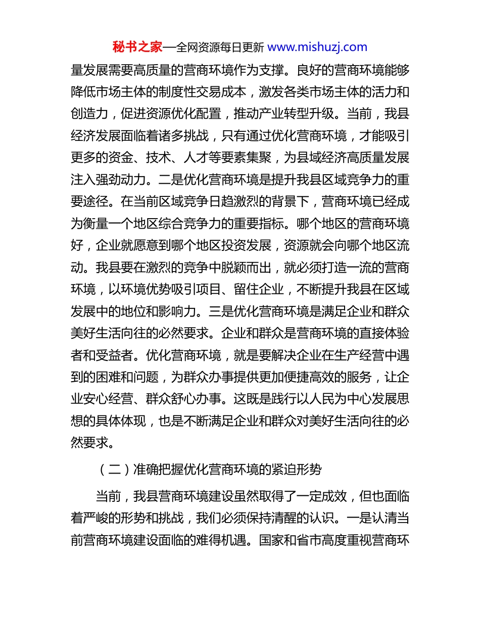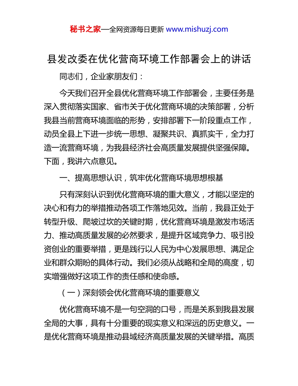 秘书之家—全网资源每日更新 www.mishuzj.com县发改委在优化营商环境工作部署会上的讲话同志们,企业家朋友们:今天我们召开全县优化营商环境工作部署会,主要任务是深入贯彻落实国家、省市关于优化营商环境的决策部署,分析我县当前营商环境面临的形势,安排部署下一阶段重点工作,动员全县上下进一步统一思想、凝聚共识、真抓实干,全力打造一流营商环境,为我县经济社会高质量发展提供坚强保障。下面,我讲六点意见。一、提高思想认识,筑牢优化营商环境思想根基只有深刻认识到优化营商环境的重大意义,才能以坚定的决心和有力的举措推动各项工作落地见效。当前,我县正处于转型升级、爬坡过坎的关键时期,优化营商环境是激发市场活力、推动高质量发展的必然要求,是提升区域竞争力、吸引投资创业的重要举措,更是践行以人民为中心发展思想、满足企业和群众期盼的具体行动。我们必须从战略和全局的高度,切实增强做好这项工作的责任感和使命感。(一)深刻领会优化营商环境的重要意义优化营商环境不是一句空洞的口号,而是关系到我县发展全局的大事,具有十分重要的现实意义和深远的历史意义。一是优化营商环境是推动县域经济高质量发展的关键举措。高质秘书之家—全网资源每日更新 www.mishuzj.com量发展需要高质量的营商环境作为支撑。良好的营商环境能够降低市场主体的制度性交易成本,激发各类市场主体的活力和创造力,促进资源优化配置,推动产业转型升级。当前,我县经济发展面临着诸多挑战,只有通过优化营商环境,才能吸引更多的资金、技术、人才等要素集聚,为县域经济高质量发展注入强劲动力。二是优化营商环境是提升我县区域竞争力的重要途径。在当前区域竞争日趋激烈的背景下,营商环境已经成为衡量一个地区综合竞争力的重要指标。哪个地区的营商环境好,企业就愿意到哪个地区投资发展,资源就会向哪个地区流动。我县要在激烈的竞争中脱颖而出,就必须打造一流的营商环境,以环境优势吸引项目、留住企业,不断提升我县在区域发展中的地位和影响力。三是优化营商环境是满足企业和群众美好生活向往的必然要求。企业和群众是营商环境的直接体验者和受益者。优化营商环境,就是要解决企业在生产经营中遇到的困难和问题,为群众办事提供更加便捷高效的服务,让企业安心经营、群众舒心办事。这既是践行以人民为中心发展思想的具体体现,也是不断满足企业和群众对美好生活向往的必然要求。(二)准确把握优化营商环境的紧迫形势当前,我县营商环境建设虽然取得了一定成效,但也面临着严峻的形势和挑战,我们必须保持清醒的认识。一是认清当前营商环境建设面临的难得机遇。国家和省市高度重视营商环秘书之家—全网资源每日更新 www.mishuzj.com境建设,出台了一系列政策措施,为我们优化营商环境提供了有力的政策支持。同时,随着我县基础设施不断完善,产业布局逐步优化,发展潜力日益凸显,为营商环境的改善创造了良好的条件。我们要抓住这些难得的机遇,乘势而上,推动我县营商环境再上新台阶。二是正视营商环境存在的突出问题与挑战。我们也要清醒地看到,我县营商环境还存在一些突出问题,比如部分部门服务意识不强、办事效率不高、政策落实不到位等。这些问题不仅影响了企业的发展,也损害了我县的形象。此外,周边地区都在加大营商环境建设力度,竞争压力不断加大,如果我们不加快改进,就会在竞争中处于劣势。三是看到与先进地区的差距和不足。与一些先进地区相比,我县在营商环境的市场化、法治化、国际化水平等方面还存在较大差距。在审批流程、监管方式、服务质量等方面还有很多需要改进的地方。我们要以先进地区为标杆,认真查找自身不足,积极学习借鉴先进经验,采取有效措施加以改进。(三)切实增强优化营商环境的责任担当优化营商环境是一项系统工程,需要各级各部门和全社会共同努力,我们必须增强责任担当,主动作为。一是明确自身在优化营商环境中的职责定位。各级各部门要按照职责分工,切实履行好优化营商环境的责任。县发改委要发挥好牵头抓总的作用,加强统筹协调和督促检查;各乡镇(街道)要落实好属地责任,积极为辖区内企业提供服务;县直各...