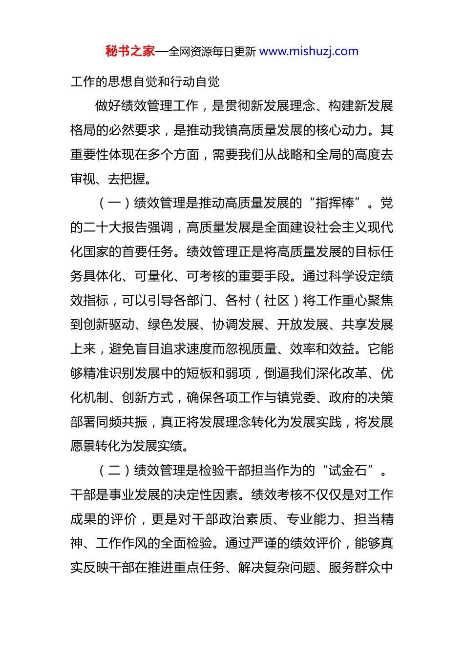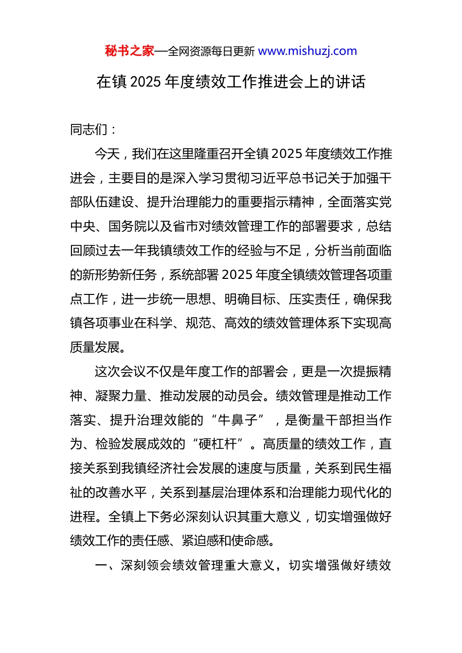 秘书之家—全网资源每日更新 www.mishuzj.com在镇 2025 年度绩效工作推进会上的讲话 同志们:今天,我们在这里隆重召开全镇 2025 年度绩效工作推进会,主要目的是深入学习贯彻习近平总书记关于加强干部队伍建设、提升治理能力的重要指示精神,全面落实党中央、国务院以及省市对绩效管理工作的部署要求,总结回顾过去一年我镇绩效工作的经验与不足,分析当前面临的新形势新任务,系统部署 2025 年度全镇绩效管理各项重点工作,进一步统一思想、明确目标、压实责任,确保我镇各项事业在科学、规范、高效的绩效管理体系下实现高质量发展。这次会议不仅是年度工作的部署会,更是一次提振精神、凝聚力量、推动发展的动员会。绩效管理是推动工作落实、提升治理效能的“牛鼻子”,是衡量干部担当作为、检验发展成效的“硬杠杆”。高质量的绩效工作,直接关系到我镇经济社会发展的速度与质量,关系到民生福祉的改善水平,关系到基层治理体系和治理能力现代化的进程。全镇上下务必深刻认识其重大意义,切实增强做好绩效工作的责任感、紧迫感和使命感。一、深刻领会绩效管理重大意义,切实增强做好绩效秘书之家—全网资源每日更新 www.mishuzj.com工作的思想自觉和行动自觉做好绩效管理工作,是贯彻新发展理念、构建新发展格局的必然要求,是推动我镇高质量发展的核心动力。其重要性体现在多个方面,需要我们从战略和全局的高度去审视、去把握。(一)绩效管理是推动高质量发展的“指挥棒”。党的二十大报告强调,高质量发展是全面建设社会主义现代化国家的首要任务。绩效管理正是将高质量发展的目标任务具体化、可量化、可考核的重要手段。通过科学设定绩效指标,可以引导各部门、各村(社区)将工作重心聚焦到创新驱动、绿色发展、协调发展、开放发展、共享发展上来,避免盲目追求速度而忽视质量、效率和效益。它能够精准识别发展中的短板和弱项,倒逼我们深化改革、优化机制、创新方式,确保各项工作与镇党委、政府的决策部署同频共振,真正将发展理念转化为发展实践,将发展愿景转化为发展实绩。(二)绩效管理是检验干部担当作为的“试金石”。干部是事业发展的决定性因素。绩效考核不仅仅是对工作成果的评价,更是对干部政治素质、专业能力、担当精神、工作作风的全面检验。通过严谨的绩效评价,能够真实反映干部在推进重点任务、解决复杂问题、服务群众中秘书之家—全网资源每日更新 www.mishuzj.com的表现,识别出那些勇于创新、敢于碰硬、善作善成的“实干家”,激励他们更好地发挥先锋模范作用。同时,也能发现工作不力、责任缺失的“掉队者”,及时进行提醒、调整和问责,从而树立鲜明的用人导向,营造崇尚实干、注重实绩的良好政治生态,让担当者有舞台、实干者得褒奖。(三)绩效管理是提升治理效能的“助推器”。当前,基层治理面临诸多挑战,要求我们必须不断提升治理的科学化、精细化、智能化水平。绩效管理通过明确责任主体、细化工作流程、量化工作标准,有助于构建权责清晰、运行高效的治理格局。它能够促使各部门之间、上下级之间加强沟通协作,打破部门壁垒,形成工作合力。通过对共性问题、突出问题的常态化监测和预警,可以及时发现治理中的薄弱环节和风险隐患,推动我们采取预防性措施,实现从“被动应对”到“主动治理”的转变,进而全面提升基层治理的系统性、整体性和协同性。(四)绩效管理是回应人民群众关切的“晴雨表”。我们的一切工作,最终都要体现在增进民生福祉上。绩效管理的最终落脚点,是提升人民群众的获得感、幸福感和安全感。通过将群众满意度、公共服务质量、生态环境改善等指标纳入绩效考核体系,可以引导各级干部更加关注秘书之家—全网资源每日更新 www.mishuzj.com群众的急难愁盼问题,更加注重解决群众身边的操心事、烦心事、揪心事。这不仅是对我们以人民为中心的发展思想的生动实践,更是检验我们党执政为民成效的直接体现。只有坚持群众导向,让绩效考评的结果与群众的切身感受相一致,才能真正赢得民心、凝聚民力,为我镇各项事业发展筑牢坚实的群众基础。二、聚焦目标导向和问题导向,扎实推进 2025 年度绩效工作走深走实...
