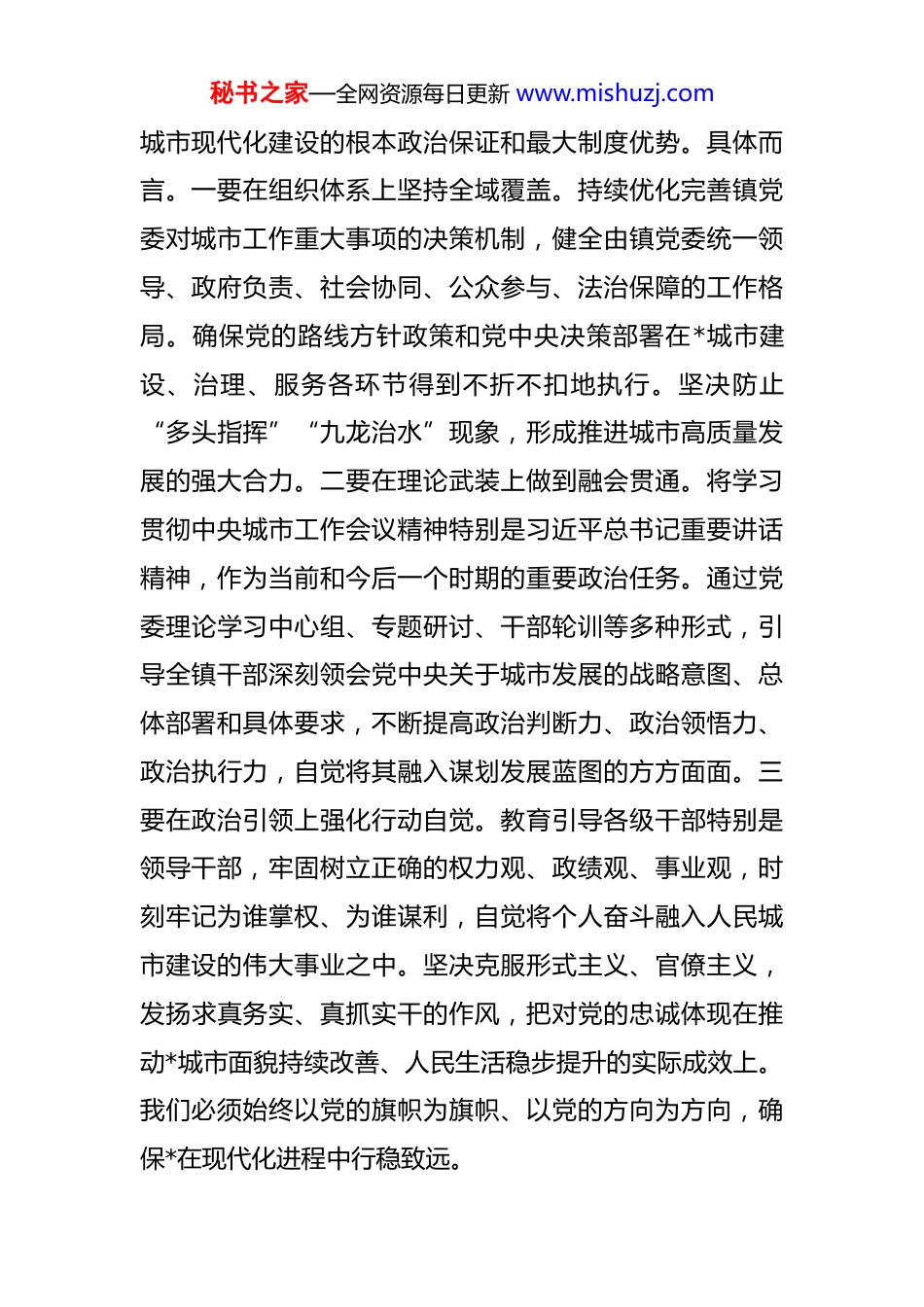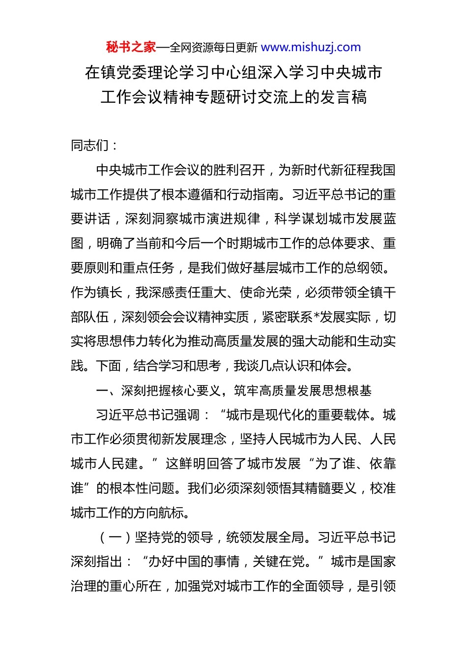 秘书之家—全网资源每日更新 www.mishuzj.com在镇党委理论学习中心组深入学习中央城市工作会议精神专题研讨交流上的发言稿 同志们:中央城市工作会议的胜利召开,为新时代新征程我国城市工作提供了根本遵循和行动指南。习近平总书记的重要讲话,深刻洞察城市演进规律,科学谋划城市发展蓝图,明确了当前和今后一个时期城市工作的总体要求、重要原则和重点任务,是我们做好基层城市工作的总纲领。作为镇长,我深感责任重大、使命光荣,必须带领全镇干部队伍,深刻领会会议精神实质,紧密联系*发展实际,切实将思想伟力转化为推动高质量发展的强大动能和生动实践。下面,结合学习和思考,我谈几点认识和体会。一、深刻把握核心要义,筑牢高质量发展思想根基习近平总书记强调:“城市是现代化的重要载体。城市工作必须贯彻新发展理念,坚持人民城市为人民、人民城市人民建。”这鲜明回答了城市发展“为了谁、依靠谁”的根本性问题。我们必须深刻领悟其精髓要义,校准城市工作的方向航标。(一)坚持党的领导,统领发展全局。习近平总书记深刻指出:“办好中国的事情,关键在党。”城市是国家治理的重心所在,加强党对城市工作的全面领导,是引领秘书之家—全网资源每日更新 www.mishuzj.com城市现代化建设的根本政治保证和最大制度优势。具体而言。一要在组织体系上坚持全域覆盖。持续优化完善镇党委对城市工作重大事项的决策机制,健全由镇党委统一领导、政府负责、社会协同、公众参与、法治保障的工作格局。确保党的路线方针政策和党中央决策部署在*城市建设、治理、服务各环节得到不折不扣地执行。坚决防止“多头指挥”“九龙治水”现象,形成推进城市高质量发展的强大合力。二要在理论武装上做到融会贯通。将学习贯彻中央城市工作会议精神特别是习近平总书记重要讲话精神,作为当前和今后一个时期的重要政治任务。通过党委理论学习中心组、专题研讨、干部轮训等多种形式,引导全镇干部深刻领会党中央关于城市发展的战略意图、总体部署和具体要求,不断提高政治判断力、政治领悟力、政治执行力,自觉将其融入谋划发展蓝图的方方面面。三要在政治引领上强化行动自觉。教育引导各级干部特别是领导干部,牢固树立正确的权力观、政绩观、事业观,时刻牢记为谁掌权、为谁谋利,自觉将个人奋斗融入人民城市建设的伟大事业之中。坚决克服形式主义、官僚主义,发扬求真务实、真抓实干的作风,把对党的忠诚体现在推动*城市面貌持续改善、人民生活稳步提升的实际成效上。我们必须始终以党的旗帜为旗帜、以党的方向为方向,确保*在现代化进程中行稳致远。秘书之家—全网资源每日更新 www.mishuzj.com(二)恪守人民立场,践行为民宗旨。“人民城市人民建,人民城市为人民”是贯穿习近平总书记重要讲话的灵魂和主线。它要求我们必须将一切城市工作的出发点和落脚点都聚焦于满足人民群众对美好生活的向往。重点要在三个方面深化认识与实践。一需强化群众观念核心地位。在规划编制、项目实施、政策制定中,必须坚持问需于民、问计于民、问需于民。畅通“线上+线下”相结合的意见表达渠道,健全公众参与城市治理的有效机制,使城市发展更充分体现民意、更广泛汇聚民智、更切实保障民生。每一项决策都应考虑其能否给群众带来实实在在的获得感、幸福感、安全感。二要聚焦民生需求精准施策。围绕*镇域范围内存在的实际短板,特别是教育、医疗、养老、托育等基本公共服务供给不均衡、质量有待提升的问题,以及交通出行、环境整治、休闲空间等与市民生活息息相关的痛点难点,列出清单、明确时限、压实责任,持续用力、久久为功。城市工作的成效,最终要体现在千家万户的笑脸上、柴米油盐的变化里。三要构建共建共治共享格局。充分激发市民群众的主人翁精神,拓宽社会力量参与城市建设和治理的制度化渠道。支持社区自治组织规范运行,培育发展社区社会组织,壮大志愿服务队伍,鼓励市场主体履行社会责任。通过机制创新,将自上而下的政策引导与自下而上的积极参与紧密结合,形成“人人参秘书之家—全网资源每日更新 www.mishuzj.com与、人人尽力、人人享有”的城市治理共同体。人民是城市的主人,是...