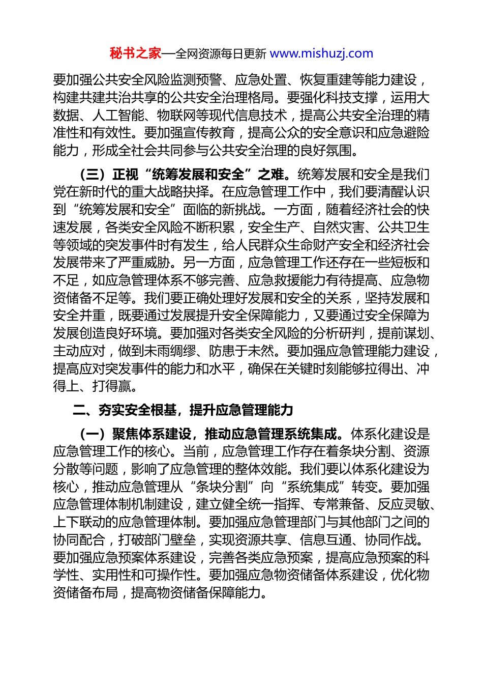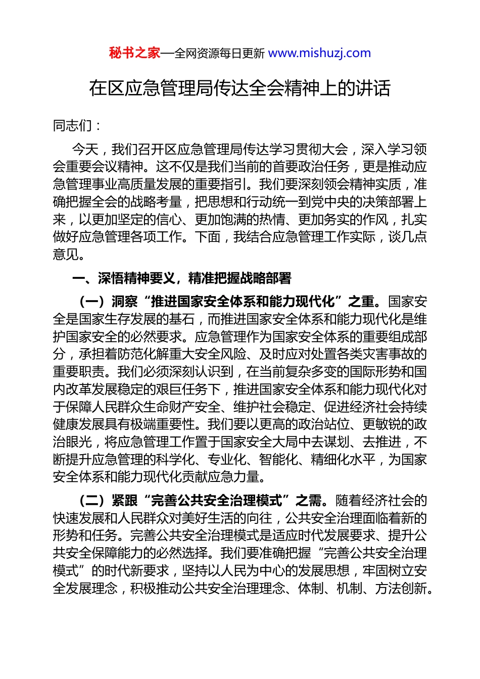 秘书之家—全网资源每日更新 www.mishuzj.com在区应急管理局传达全会精神上的讲话同志们:今天,我们召开区应急管理局传达学习贯彻大会,深入学习领会重要会议精神。这不仅是我们当前的首要政治任务,更是推动应急管理事业高质量发展的重要指引。我们要深刻领会精神实质,准确把握全会的战略考量,把思想和行动统一到党中央的决策部署上来,以更加坚定的信心、更加饱满的热情、更加务实的作风,扎实做好应急管理各项工作。下面,我结合应急管理工作实际,谈几点意见。一、深悟精神要义,精准把握战略部署(一)洞察“推进国家安全体系和能力现代化”之重。国家安全是国家生存发展的基石,而推进国家安全体系和能力现代化是维护国家安全的必然要求。应急管理作为国家安全体系的重要组成部分,承担着防范化解重大安全风险、及时应对处置各类灾害事故的重要职责。我们必须深刻认识到,在当前复杂多变的国际形势和国内改革发展稳定的艰巨任务下,推进国家安全体系和能力现代化对于保障人民群众生命财产安全、维护社会稳定、促进经济社会持续健康发展具有极端重要性。我们要以更高的政治站位、更敏锐的政治眼光,将应急管理工作置于国家安全大局中去谋划、去推进,不断提升应急管理的科学化、专业化、智能化、精细化水平,为国家安全体系和能力现代化贡献应急力量。(二)紧跟“完善公共安全治理模式”之需。随着经济社会的快速发展和人民群众对美好生活的向往,公共安全治理面临着新的形势和任务。完善公共安全治理模式是适应时代发展要求、提升公共安全保障能力的必然选择。我们要准确把握“完善公共安全治理模式”的时代新要求,坚持以人民为中心的发展思想,牢固树立安全发展理念,积极推动公共安全治理理念、体制、机制、方法创新。秘书之家—全网资源每日更新 www.mishuzj.com要加强公共安全风险监测预警、应急处置、恢复重建等能力建设,构建共建共治共享的公共安全治理格局。要强化科技支撑,运用大数据、人工智能、物联网等现代信息技术,提高公共安全治理的精准性和有效性。要加强宣传教育,提高公众的安全意识和应急避险能力,形成全社会共同参与公共安全治理的良好氛围。(三)正视“统筹发展和安全”之难。统筹发展和安全是我们党在新时代的重大战略抉择。在应急管理工作中,我们要清醒认识到“统筹发展和安全”面临的新挑战。一方面,随着经济社会的快速发展,各类安全风险不断积累,安全生产、自然灾害、公共卫生等领域的突发事件时有发生,给人民群众生命财产安全和经济社会发展带来了严重威胁。另一方面,应急管理工作还存在一些短板和不足,如应急管理体系不够完善、应急救援能力有待提高、应急物资储备不足等。我们要正确处理好发展和安全的关系,坚持发展和安全并重,既要通过发展提升安全保障能力,又要通过安全保障为发展创造良好环境。要加强对各类安全风险的分析研判,提前谋划、主动应对,做到未雨绸缪、防患于未然。要加强应急管理能力建设,提高应对突发事件的能力和水平,确保在关键时刻能够拉得出、冲得上、打得赢。二、夯实安全根基,提升应急管理能力(一)聚焦体系建设,推动应急管理系统集成。体系化建设是应急管理工作的核心。当前,应急管理工作存在着条块分割、资源分散等问题,影响了应急管理的整体效能。我们要以体系化建设为核心,推动应急管理从“条块分割”向“系统集成”转变。要加强应急管理体制机制建设,建立健全统一指挥、专常兼备、反应灵敏、上下联动的应急管理体制。要加强应急管理部门与其他部门之间的协同配合,打破部门壁垒,实现资源共享、信息互通、协同作战。要加强应急预案体系建设,完善各类应急预案,提高应急预案的科学性、实用性和可操作性。要加强应急物资储备体系建设,优化物资储备布局,提高物资储备保障能力。秘书之家—全网资源每日更新 www.mishuzj.com(二)强化科技赋能,驱动应急管理智慧升级。科技是第一生产力,也是应急管理工作的重要支撑。我们要以科技化赋能为引擎,推动应急管理从“经验主导”向“智慧驱动”转变。要加大科技投入,加强应急管理科技创新平台建设,引进和应用先进的应急管理技术和装备...