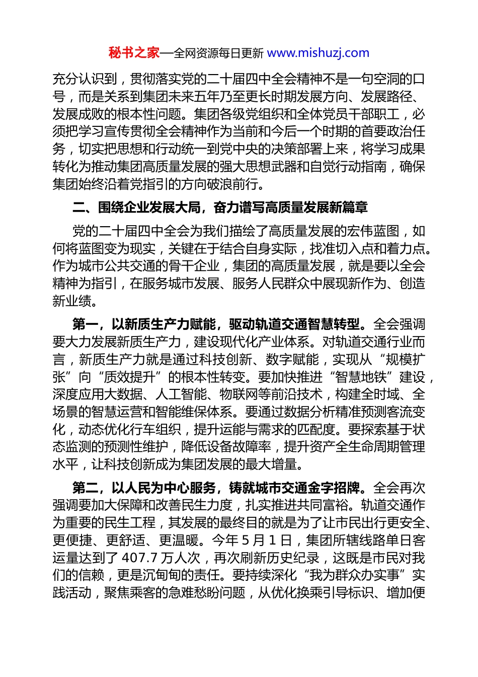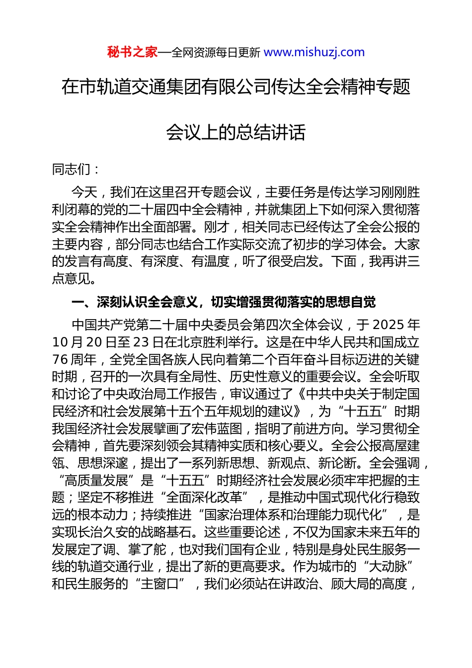 秘书之家—全网资源每日更新 www.mishuzj.com在市轨道交通集团有限公司传达全会精神专题会议上的总结讲话同志们:今天,我们在这里召开专题会议,主要任务是传达学习刚刚胜利闭幕的党的二十届四中全会精神,并就集团上下如何深入贯彻落实全会精神作出全面部署。刚才,相关同志已经传达了全会公报的主要内容,部分同志也结合工作实际交流了初步的学习体会。大家的发言有高度、有深度、有温度,听了很受启发。下面,我再讲三点意见。一、深刻认识全会意义,切实增强贯彻落实的思想自觉中国共产党第二十届中央委员会第四次全体会议,于 2025 年10 月 20 日至 23 日在北京胜利举行。这是在中华人民共和国成立76 周年,全党全国各族人民向着第二个百年奋斗目标迈进的关键时期,召开的一次具有全局性、历史性意义的重要会议。全会听取和讨论了中央政治局工作报告,审议通过了《中共中央关于制定国民经济和社会发展第十五个五年规划的建议》,为“十五五”时期我国经济社会发展擘画了宏伟蓝图,指明了前进方向。学习贯彻全会精神,首先要深刻领会其精神实质和核心要义。全会公报高屋建瓴、思想深邃,提出了一系列新思想、新观点、新论断。全会强调,“高质量发展”是“十五五”时期经济社会发展必须牢牢把握的主题;坚定不移推进“全面深化改革”,是推动中国式现代化行稳致远的根本动力;持续推进“国家治理体系和治理能力现代化”,是实现长治久安的战略基石。这些重要论述,不仅为国家未来五年的发展定了调、掌了舵,也对我们国有企业,特别是身处民生服务一线的轨道交通行业,提出了新的更高要求。作为城市的“大动脉”和民生服务的“主窗口”,我们必须站在讲政治、顾大局的高度,秘书之家—全网资源每日更新 www.mishuzj.com充分认识到,贯彻落实党的二十届四中全会精神不是一句空洞的口号,而是关系到集团未来五年乃至更长时期发展方向、发展路径、发展成败的根本性问题。集团各级党组织和全体党员干部职工,必须把学习宣传贯彻全会精神作为当前和今后一个时期的首要政治任务,切实把思想和行动统一到党中央的决策部署上来,将学习成果转化为推动集团高质量发展的强大思想武器和自觉行动指南,确保集团始终沿着党指引的方向破浪前行。二、围绕企业发展大局,奋力谱写高质量发展新篇章党的二十届四中全会为我们描绘了高质量发展的宏伟蓝图,如何将蓝图变为现实,关键在于结合自身实际,找准切入点和着力点。作为城市公共交通的骨干企业,集团的高质量发展,就是要以全会精神为指引,在服务城市发展、服务人民群众中展现新作为、创造新业绩。第一,以新质生产力赋能,驱动轨道交通智慧转型。全会强调要大力发展新质生产力,建设现代化产业体系。对轨道交通行业而言,新质生产力就是通过科技创新、数字赋能,实现从“规模扩张”向“质效提升”的根本性转变。要加快推进“智慧地铁”建设,深度应用大数据、人工智能、物联网等前沿技术,构建全时域、全场景的智慧运营和智能维保体系。要通过数据分析精准预测客流变化,动态优化行车组织,提升运能与需求的匹配度。要探索基于状态监测的预测性维护,降低设备故障率,提升资产全生命周期管理水平,让科技创新成为集团发展的最大增量。第二,以人民为中心服务,铸就城市交通金字招牌。全会再次强调要加大保障和改善民生力度,扎实推进共同富裕。轨道交通作为重要的民生工程,其发展的最终目的就是为了让市民出行更安全、更便捷、更舒适、更温暖。今年 5 月 1 日,集团所辖线路单日客运量达到了 407.7 万人次,再次刷新历史纪录,这既是市民对我们的信赖,更是沉甸甸的责任。要持续深化“我为群众办实事”实践活动,聚焦乘客的急难愁盼问题,从优化换乘引导标识、增加便秘书之家—全网资源每日更新 www.mishuzj.com民服务设施、提升车站环境品质等细微之处着手,不断提升服务质量。要始终把安全运营放在首位,以“时时放心不下”的责任感,抓好安全生产的每一个环节,坚决守住不发生重特大安全事故的底线,用我们的辛苦指数换取市民的幸福指数。第三,以重大项目建设,筑牢城市发展战略支撑。全会提出要促进区域协调发展和...