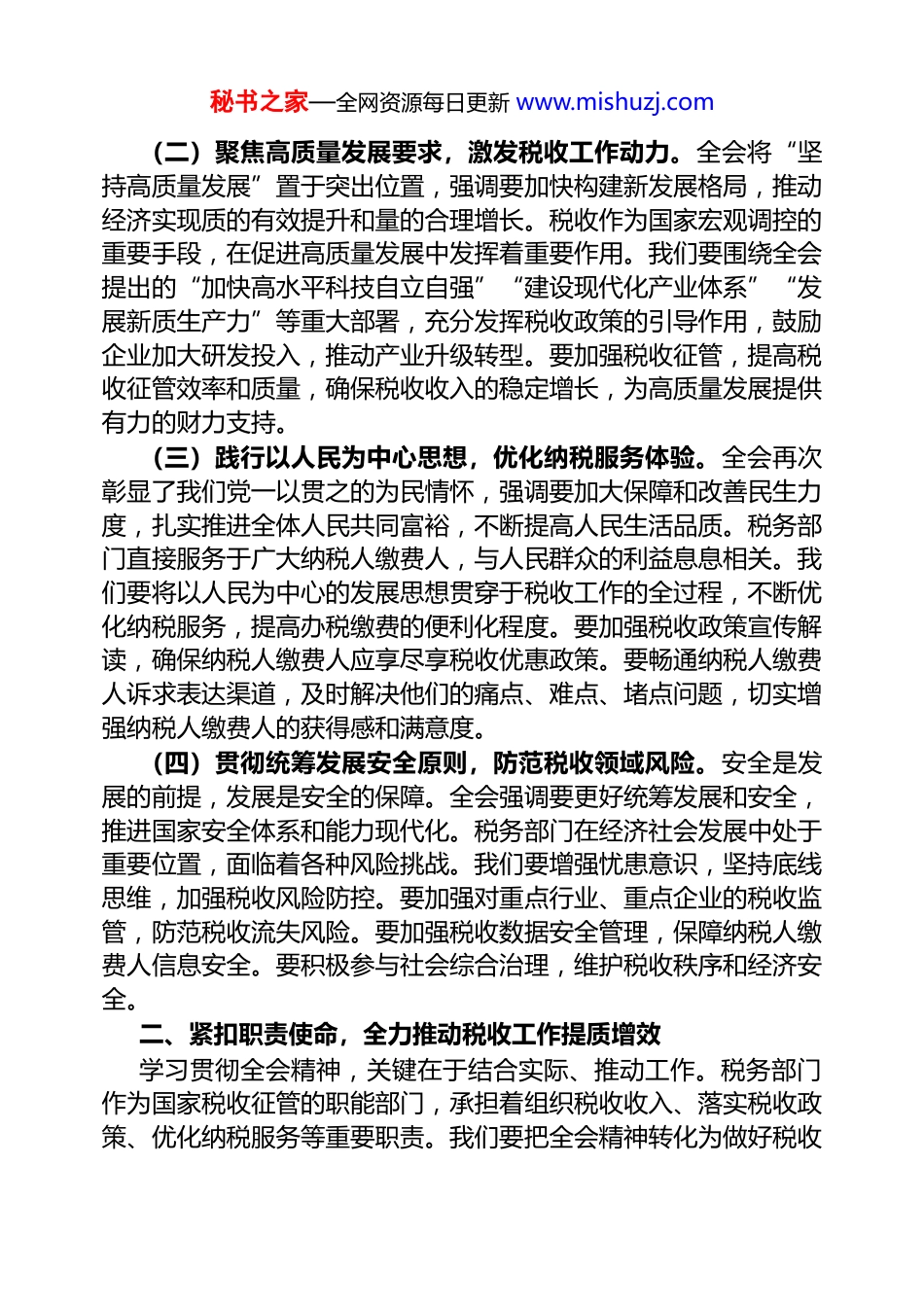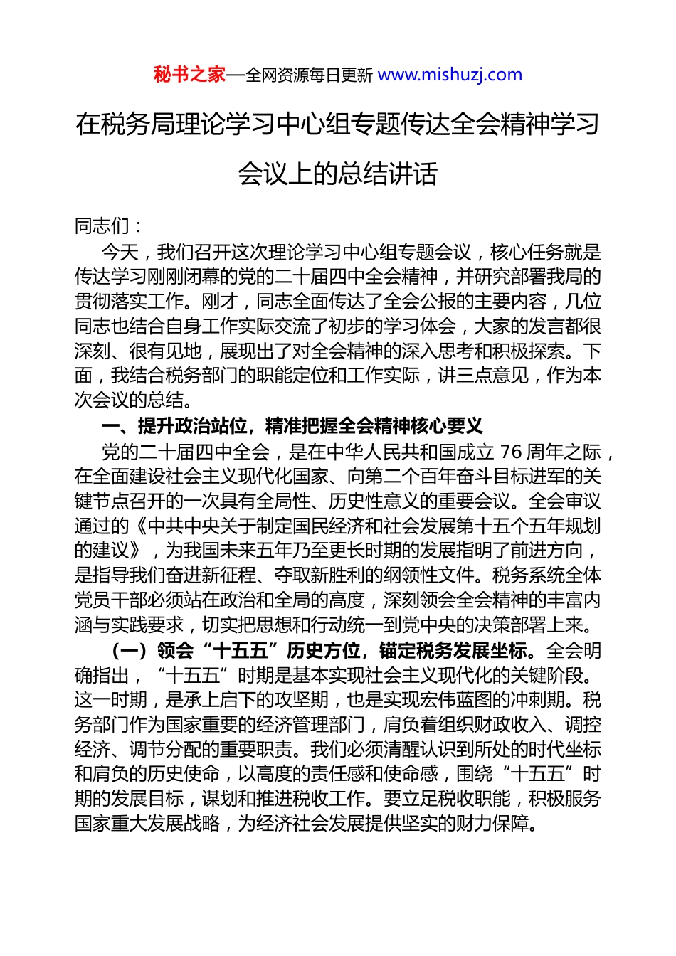 秘书之家—全网资源每日更新 www.mishuzj.com在税务局理论学习中心组专题传达全会精神学习会议上的总结讲话同志们:今天,我们召开这次理论学习中心组专题会议,核心任务就是传达学习刚刚闭幕的党的二十届四中全会精神,并研究部署我局的贯彻落实工作。刚才,同志全面传达了全会公报的主要内容,几位同志也结合自身工作实际交流了初步的学习体会,大家的发言都很深刻、很有见地,展现出了对全会精神的深入思考和积极探索。下面,我结合税务部门的职能定位和工作实际,讲三点意见,作为本次会议的总结。一、提升政治站位,精准把握全会精神核心要义党的二十届四中全会,是在中华人民共和国成立 76 周年之际,在全面建设社会主义现代化国家、向第二个百年奋斗目标进军的关键节点召开的一次具有全局性、历史性意义的重要会议。全会审议通过的《中共中央关于制定国民经济和社会发展第十五个五年规划的建议》,为我国未来五年乃至更长时期的发展指明了前进方向,是指导我们奋进新征程、夺取新胜利的纲领性文件。税务系统全体党员干部必须站在政治和全局的高度,深刻领会全会精神的丰富内涵与实践要求,切实把思想和行动统一到党中央的决策部署上来。(一)领会“十五五”历史方位,锚定税务发展坐标。全会明确指出,“十五五”时期是基本实现社会主义现代化的关键阶段。这一时期,是承上启下的攻坚期,也是实现宏伟蓝图的冲刺期。税务部门作为国家重要的经济管理部门,肩负着组织财政收入、调控经济、调节分配的重要职责。我们必须清醒认识到所处的时代坐标和肩负的历史使命,以高度的责任感和使命感,围绕“十五五”时期的发展目标,谋划和推进税收工作。要立足税收职能,积极服务国家重大发展战略,为经济社会发展提供坚实的财力保障。秘书之家—全网资源每日更新 www.mishuzj.com(二)聚焦高质量发展要求,激发税收工作动力。全会将“坚持高质量发展”置于突出位置,强调要加快构建新发展格局,推动经济实现质的有效提升和量的合理增长。税收作为国家宏观调控的重要手段,在促进高质量发展中发挥着重要作用。我们要围绕全会提出的“加快高水平科技自立自强”“建设现代化产业体系”“发展新质生产力”等重大部署,充分发挥税收政策的引导作用,鼓励企业加大研发投入,推动产业升级转型。要加强税收征管,提高税收征管效率和质量,确保税收收入的稳定增长,为高质量发展提供有力的财力支持。(三)践行以人民为中心思想,优化纳税服务体验。全会再次彰显了我们党一以贯之的为民情怀,强调要加大保障和改善民生力度,扎实推进全体人民共同富裕,不断提高人民生活品质。税务部门直接服务于广大纳税人缴费人,与人民群众的利益息息相关。我们要将以人民为中心的发展思想贯穿于税收工作的全过程,不断优化纳税服务,提高办税缴费的便利化程度。要加强税收政策宣传解读,确保纳税人缴费人应享尽享税收优惠政策。要畅通纳税人缴费人诉求表达渠道,及时解决他们的痛点、难点、堵点问题,切实增强纳税人缴费人的获得感和满意度。(四)贯彻统筹发展安全原则,防范税收领域风险。安全是发展的前提,发展是安全的保障。全会强调要更好统筹发展和安全,推进国家安全体系和能力现代化。税务部门在经济社会发展中处于重要位置,面临着各种风险挑战。我们要增强忧患意识,坚持底线思维,加强税收风险防控。要加强对重点行业、重点企业的税收监管,防范税收流失风险。要加强税收数据安全管理,保障纳税人缴费人信息安全。要积极参与社会综合治理,维护税收秩序和经济安全。二、紧扣职责使命,全力推动税收工作提质增效学习贯彻全会精神,关键在于结合实际、推动工作。税务部门作为国家税收征管的职能部门,承担着组织税收收入、落实税收政策、优化纳税服务等重要职责。我们要把全会精神转化为做好税收秘书之家—全网资源每日更新 www.mishuzj.com工作的具体思路、务实举措和实际行动,在服务经济社会发展大局中展现新担当、新作为。(一)围绕组织收入中心,确保税收稳定增长。组织税收收入是税务部门的首要职责。我们要按照全会提出的经济发展目标,科学研判税收形势,加强税收征管,确保税收...