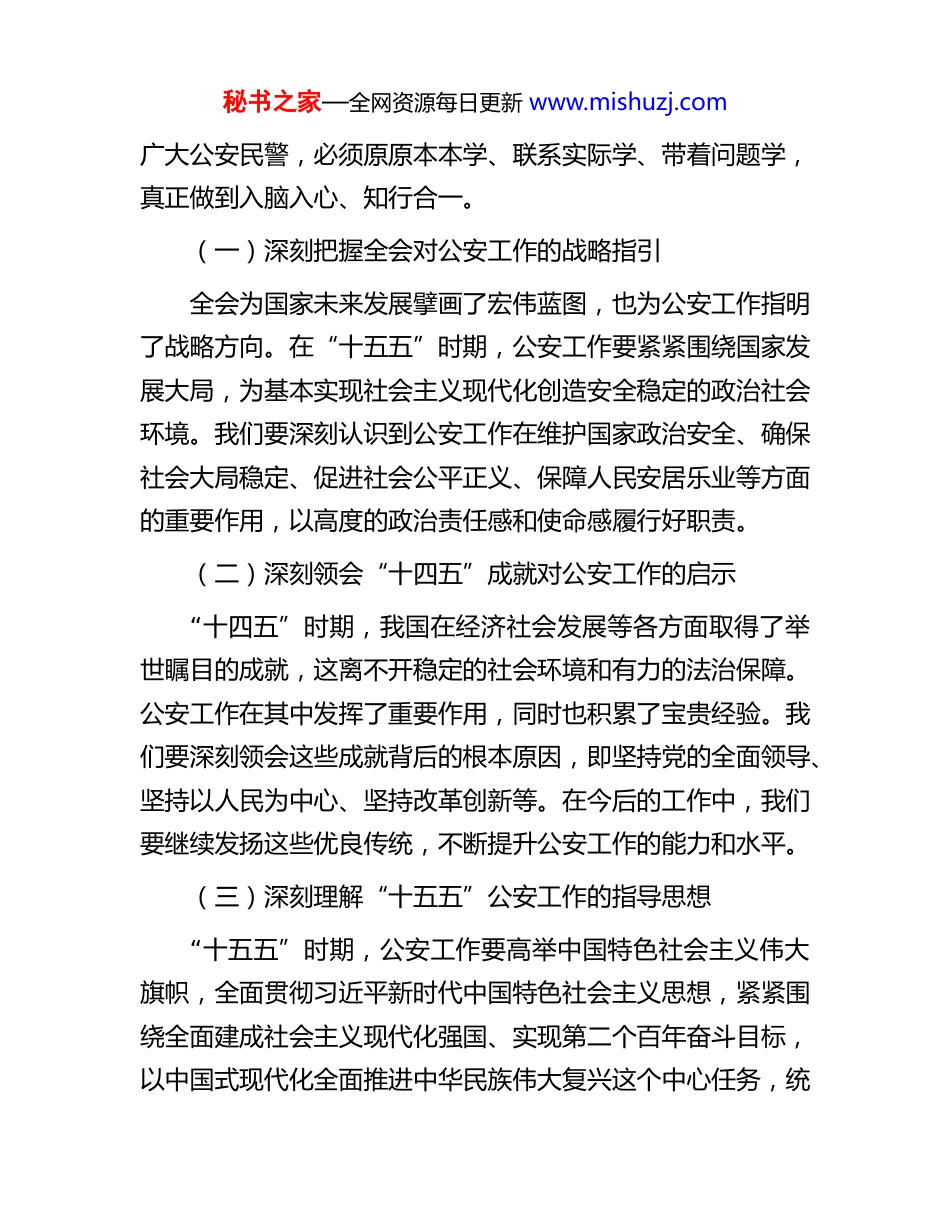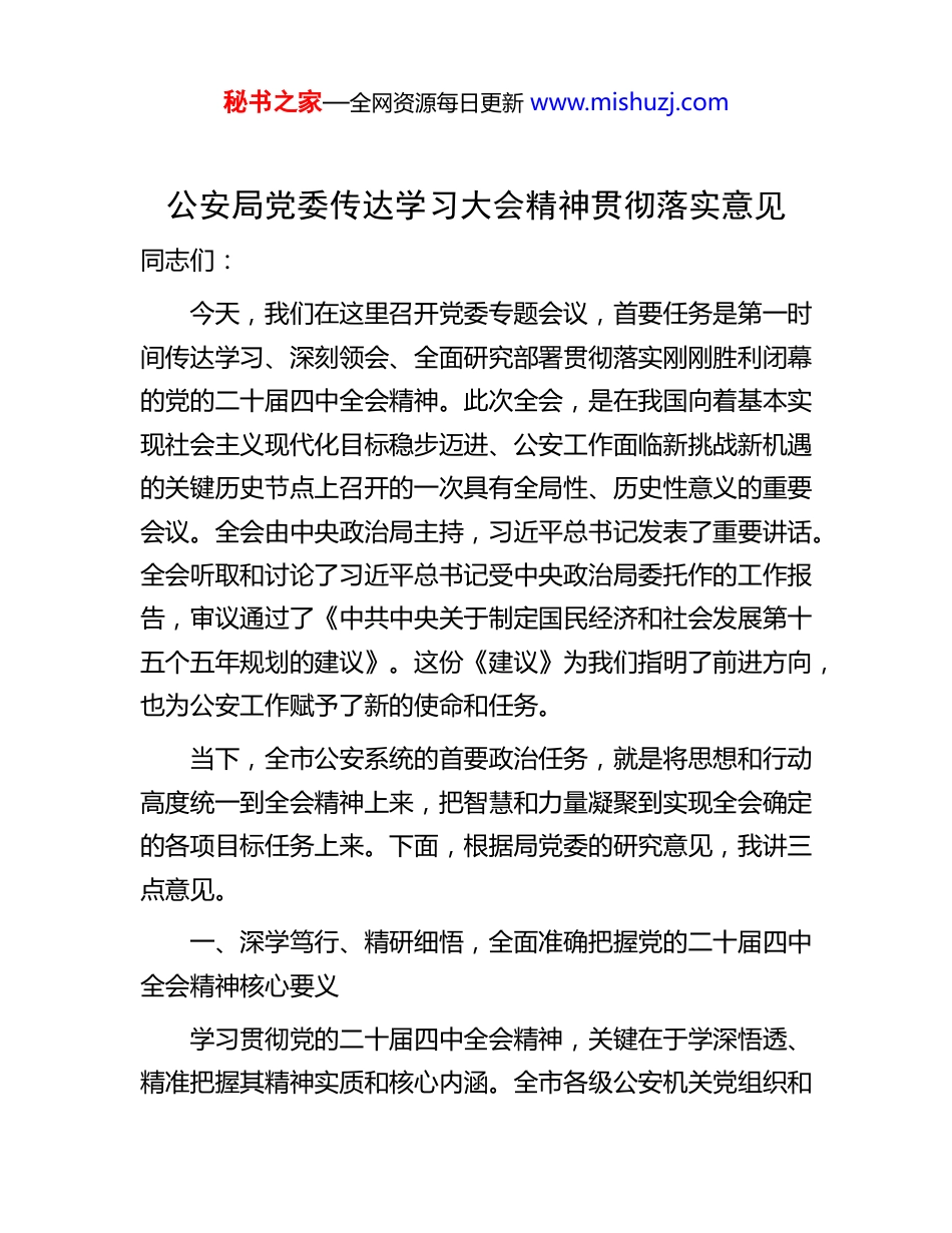 秘书之家—全网资源每日更新 www.mishuzj.com公安局党委传达学习大会精神贯彻落实意见同志们:今天,我们在这里召开党委专题会议,首要任务是第一时间传达学习、深刻领会、全面研究部署贯彻落实刚刚胜利闭幕的党的二十届四中全会精神。此次全会,是在我国向着基本实现社会主义现代化目标稳步迈进、公安工作面临新挑战新机遇的关键历史节点上召开的一次具有全局性、历史性意义的重要会议。全会由中央政治局主持,习近平总书记发表了重要讲话。全会听取和讨论了习近平总书记受中央政治局委托作的工作报告,审议通过了《中共中央关于制定国民经济和社会发展第十五个五年规划的建议》。这份《建议》为我们指明了前进方向,也为公安工作赋予了新的使命和任务。当下,全市公安系统的首要政治任务,就是将思想和行动高度统一到全会精神上来,把智慧和力量凝聚到实现全会确定的各项目标任务上来。下面,根据局党委的研究意见,我讲三点意见。一、深学笃行、精研细悟,全面准确把握党的二十届四中全会精神核心要义学习贯彻党的二十届四中全会精神,关键在于学深悟透、精准把握其精神实质和核心内涵。全市各级公安机关党组织和秘书之家—全网资源每日更新 www.mishuzj.com广大公安民警,必须原原本本学、联系实际学、带着问题学,真正做到入脑入心、知行合一。(一)深刻把握全会对公安工作的战略指引全会为国家未来发展擘画了宏伟蓝图,也为公安工作指明了战略方向。在“十五五”时期,公安工作要紧紧围绕国家发展大局,为基本实现社会主义现代化创造安全稳定的政治社会环境。我们要深刻认识到公安工作在维护国家政治安全、确保社会大局稳定、促进社会公平正义、保障人民安居乐业等方面的重要作用,以高度的政治责任感和使命感履行好职责。(二)深刻领会“十四五”成就对公安工作的启示“十四五”时期,我国在经济社会发展等各方面取得了举世瞩目的成就,这离不开稳定的社会环境和有力的法治保障。公安工作在其中发挥了重要作用,同时也积累了宝贵经验。我们要深刻领会这些成就背后的根本原因,即坚持党的全面领导、坚持以人民为中心、坚持改革创新等。在今后的工作中,我们要继续发扬这些优良传统,不断提升公安工作的能力和水平。(三)深刻理解“十五五”公安工作的指导思想“十五五”时期,公安工作要高举中国特色社会主义伟大旗帜,全面贯彻习近平新时代中国特色社会主义思想,紧紧围绕全面建成社会主义现代化强国、实现第二个百年奋斗目标,以中国式现代化全面推进中华民族伟大复兴这个中心任务,统秘书之家—全网资源每日更新 www.mishuzj.com筹推进公安工作的各项任务。我们要坚持总体国家安全观,以人民安全为宗旨,以政治安全为根本,以经济安全为基础,以军事、科技、文化、社会安全为保障,以促进国际安全为依托,不断提升公安工作的整体效能。(四)深刻把握“十五五”公安工作的重要原则公安工作必须遵循“六个坚持”原则,即坚持党的全面领导、坚持人民至上、坚持高质量发展、坚持全面深化改革、坚持有效市场和有为政府相结合、坚持统筹发展和安全。在公安工作中,坚持党的全面领导是根本保证,坚持人民至上是出发点和落脚点,坚持高质量发展是工作目标,坚持全面深化改革是动力源泉,坚持有效市场和有为政府相结合是工作方法,坚持统筹发展和安全是工作底线。我们要将这些原则贯穿于公安工作的全过程,确保公安工作始终沿着正确的方向前进。(五)深刻明确“十五五”公安工作的主要目标结合全会精神,“十五五”时期公安工作的主要目标包括维护国家政治安全更加有力,社会大局持续稳定,社会治安秩序明显好转,公共安全管理水平显著提升,公安执法公信力不断增强,公安队伍建设更加过硬。我们要围绕这些目标,制定具体的工作措施和行动计划,确保各项工作任务落到实处。(六)深刻聚焦“十五五”公安工作的重点任务秘书之家—全网资源每日更新 www.mishuzj.com全会部署的重点任务为公安工作提供了广阔的空间和重要的机遇。我们要紧密结合公安工作实际,聚焦维护国家政治安全、打击违法犯罪、加强公共安全管理、推进公安改革创新、加强公安队伍建设等重点任务,找准切入...