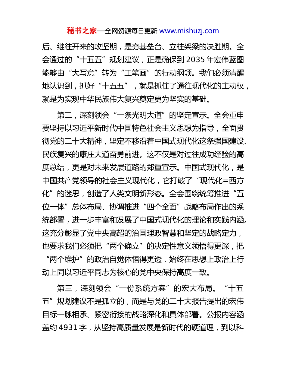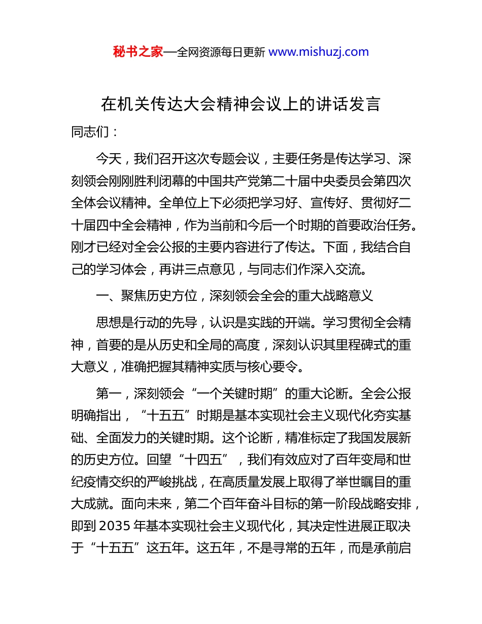 秘书之家—全网资源每日更新 www.mishuzj.com在机关传达大会精神会议上的讲话发言同志们:今天,我们召开这次专题会议,主要任务是传达学习、深刻领会刚刚胜利闭幕的中国共产党第二十届中央委员会第四次全体会议精神。全单位上下必须把学习好、宣传好、贯彻好二十届四中全会精神,作为当前和今后一个时期的首要政治任务。刚才已经对全会公报的主要内容进行了传达。下面,我结合自己的学习体会,再讲三点意见,与同志们作深入交流。一、聚焦历史方位,深刻领会全会的重大战略意义思想是行动的先导,认识是实践的开端。学习贯彻全会精神,首要的是从历史和全局的高度,深刻认识其里程碑式的重大意义,准确把握其精神实质与核心要令。第一,深刻领会“一个关键时期”的重大论断。全会公报明确指出,“十五五”时期是基本实现社会主义现代化夯实基础、全面发力的关键时期。这个论断,精准标定了我国发展新的历史方位。回望“十四五”,我们有效应对了百年变局和世纪疫情交织的严峻挑战,在高质量发展上取得了举世瞩目的重大成就。面向未来,第二个百年奋斗目标的第一阶段战略安排,即到 2035 年基本实现社会主义现代化,其决定性进展正取决于“十五五”这五年。这五年,不是寻常的五年,而是承前启秘书之家—全网资源每日更新 www.mishuzj.com后、继往开来的攻坚期,是夯基垒台、立柱架梁的决胜期。全会通过的“十五五”规划建议,正是确保到 2035 年宏伟蓝图能够由“大写意”转为“工笔画”的行动纲领。我们必须清醒地认识到,抓好“十五五”,就是抓住了通往现代化的主动权,就是为实现中华民族伟大复兴奠定更为坚实的基础。第二,深刻领会“一条光明大道”的坚定宣示。全会重申要坚持以习近平新时代中国特色社会主义思想为指导,全面贯彻党的二十大精神,坚定不移沿着中国式现代化这条强国建设、民族复兴的康庄大道奋勇前进。这不仅是对过往成功经验的高度总结,更是对未来发展道路的郑重宣示。中国式现代化,是中国共产党领导的社会主义现代化,它打破了“现代化=西方化”的迷思,创造了人类文明新形态。全会围绕统筹推进“五位一体”总体布局、协调推进“四个全面”战略布局作出的系统部署,进一步丰富和发展了中国式现代化的理论和实践内涵。这充分彰显了党中央高超的治国理政智慧和坚定的战略定力,也要求我们必须把“两个确立”的决定性意义领悟得更深,把“两个维护”的政治自觉体悟得更透,始终在思想上政治上行动上同以习近平同志为核心的党中央保持高度一致。第三,深刻领会“一份系统方案”的宏大布局。“十五五”规划建议不是孤立的,而是与党的二十大报告提出的宏伟目标一脉相承、紧密衔接的战略深化和具体部署。公报内容涵盖约 4931 字,从坚持高质量发展是新时代的硬道理,到以科秘书之家—全网资源每日更新 www.mishuzj.com技自立自强引领现代化产业体系建设;从全面深化改革构建高水平社会主义市场经济体制,到推进城乡融合和区域协调发展;从建设更高水平的文化强国,到切实增进民生福祉;从推动绿色发展促进人与自然和谐共生,到统筹发展和安全建设更高水平的平安中国乃至推进祖国统一大业和全面从严治党等,共计作出了 12 个方面的战略部署。这些部署,既有高瞻远瞩的战略擘画,又有精准务实的战术安排,构成了一个逻辑严密、内涵丰富、系统集成的“任务书”和“施工图”。特别是其中首次提出的“航天强国”、“交通强国”等新概念,进一步明确了重点突破方向,展现了党和国家面向未来的雄心壮志。二、心怀国之大者,在服务高质量发展上实现新作为蓝图已经绘就,关键在于落实。学习贯彻全会精神,不能停留在口头上、满足于“已阅”,而必须紧密结合单位的职能定位和工作实际,找准切入点、结合点、发力点,将全会精神转化为推动地区高质量发展的强大动力和生动实践。第一,要以新质生产力为牵引,全力服务现代化产业体系建设。全会把发展新质生产力、建设现代化产业体系放在了突出位置。这是推动高质量发展的必然要求。我们单位,虽然不直接创造 GDP,但却是经济社会发展的“护航员”和“服务员”。一方面,要持续优化法治化营商环境。要像爱护眼睛...