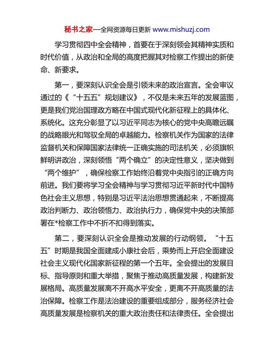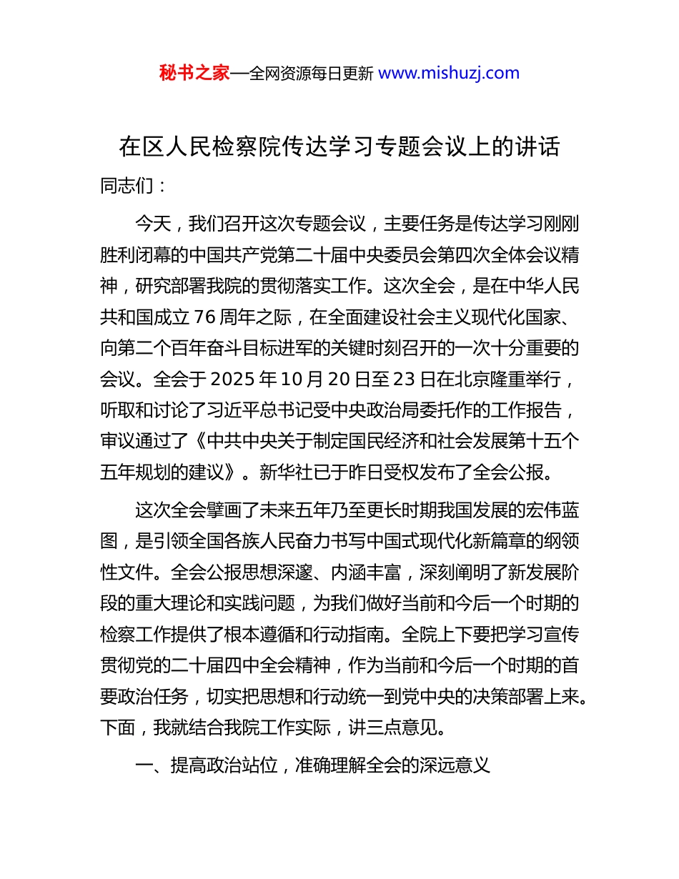 秘书之家—全网资源每日更新 www.mishuzj.com在区人民检察院传达学习专题会议上的讲话同志们:今天,我们召开这次专题会议,主要任务是传达学习刚刚胜利闭幕的中国共产党第二十届中央委员会第四次全体会议精神,研究部署我院的贯彻落实工作。这次全会,是在中华人民共和国成立 76 周年之际,在全面建设社会主义现代化国家、向第二个百年奋斗目标进军的关键时刻召开的一次十分重要的会议。全会于 2025 年 10 月 20 日至 23 日在北京隆重举行,听取和讨论了习近平总书记受中央政治局委托作的工作报告,审议通过了《中共中央关于制定国民经济和社会发展第十五个五年规划的建议》。新华社已于昨日受权发布了全会公报。这次全会擘画了未来五年乃至更长时期我国发展的宏伟蓝图,是引领全国各族人民奋力书写中国式现代化新篇章的纲领性文件。全会公报思想深邃、内涵丰富,深刻阐明了新发展阶段的重大理论和实践问题,为我们做好当前和今后一个时期的检察工作提供了根本遵循和行动指南。全院上下要把学习宣传贯彻党的二十届四中全会精神,作为当前和今后一个时期的首要政治任务,切实把思想和行动统一到党中央的决策部署上来。下面,我就结合我院工作实际,讲三点意见。一、提高政治站位,准确理解全会的深远意义秘书之家—全网资源每日更新 www.mishuzj.com学习贯彻四中全会精神,首要在于深刻领会其精神实质和时代价值,从政治和全局的高度把握其对检察工作提出的新使命、新要求。第一,要深刻认识全会是引领未来的政治宣言。全会审议通过的《“十五五”规划建议》,不仅是未来五年的发展蓝图,更是我们党治国理政方略在中国式现代化新征程上的具体化、系统化。这充分彰显了以习近平同志为核心的党中央高瞻远瞩的战略眼光和驾驭全局的卓越能力。检察机关作为国家的法律监督机关和保障国家法律统一正确实施的司法机关,必须旗帜鲜明讲政治,深刻领悟“两个确立”的决定性意义,坚决做到“两个维护”,确保检察工作始终沿着党中央指引的正确方向前进。我们要将学习全会精神与学习贯彻习近平新时代中国特色社会主义思想,特别是习近平法治思想贯通起来,不断提高政治判断力、政治领悟力、政治执行力,确保党中央的决策部署在*检察工作中不折不扣得到落实。第二,要深刻认识全会是推动发展的行动纲领。“十五五”时期是我国全面建成小康社会后,乘势而上开启全面建设社会主义现代化国家新征程的第一个五年。全会提出的发展目标、指导原则和重大举措,聚焦于推动高质量发展,构建新发展格局。高质量发展离不开高水平安全,更离不开高质量的法治保障。检察工作是法治建设的重要组成部分,服务经济社会高质量发展是检察机关的重大政治责任和法律责任。全会提出秘书之家—全网资源每日更新 www.mishuzj.com要推进国家治理体系和治理能力现代化,建设中国特色社会主义法治体系。这就要求我们必须更加自觉地将检察工作融入经济社会发展大局,找准服务“十五五”规划实施的切入点和着力点。例如,围绕建设现代化产业体系,我们就需要加大对知识产权的司法保护力度;围绕推进全国统一大市场建设,我们就需要依法平等保护各类市场主体合法权益,严厉打击破坏市场经济秩序犯罪;围绕绿色转型,我们就需要持续做优做实生态环境领域的公益诉讼检察。必须将全会擘画的宏伟蓝图转化为检察履职的“施工图”,以法治“含金量”提升发展“含金量”。第三,要深刻认识全面深化改革的强大动力。全会强调,要坚定不移推进全面深化改革。党的十八届四中全会开启了全面依法治国的新时代,部署了深化司法体制改革的宏伟蓝图。党的二十大报告则进一步要求“加强检察机关法律监督工作”。党的二十届四中全会必将在已有基础上,对包括司法体制改革在内的各领域改革作出新的战略部署。检察改革是司法体制改革的重要组成部分,我们必须有“逆水行舟、不进则退”的紧迫感。要对标全会关于全面深化改革、推进国家治理体系和治理能力现代化的新要求持续深化司法责任制综合配套改革,健全检察权运行制约监督体系,完善“四大检察”法律监督新格局,以改革之力破解发展之困,以机制之活激发队伍之能,推动*检察工...