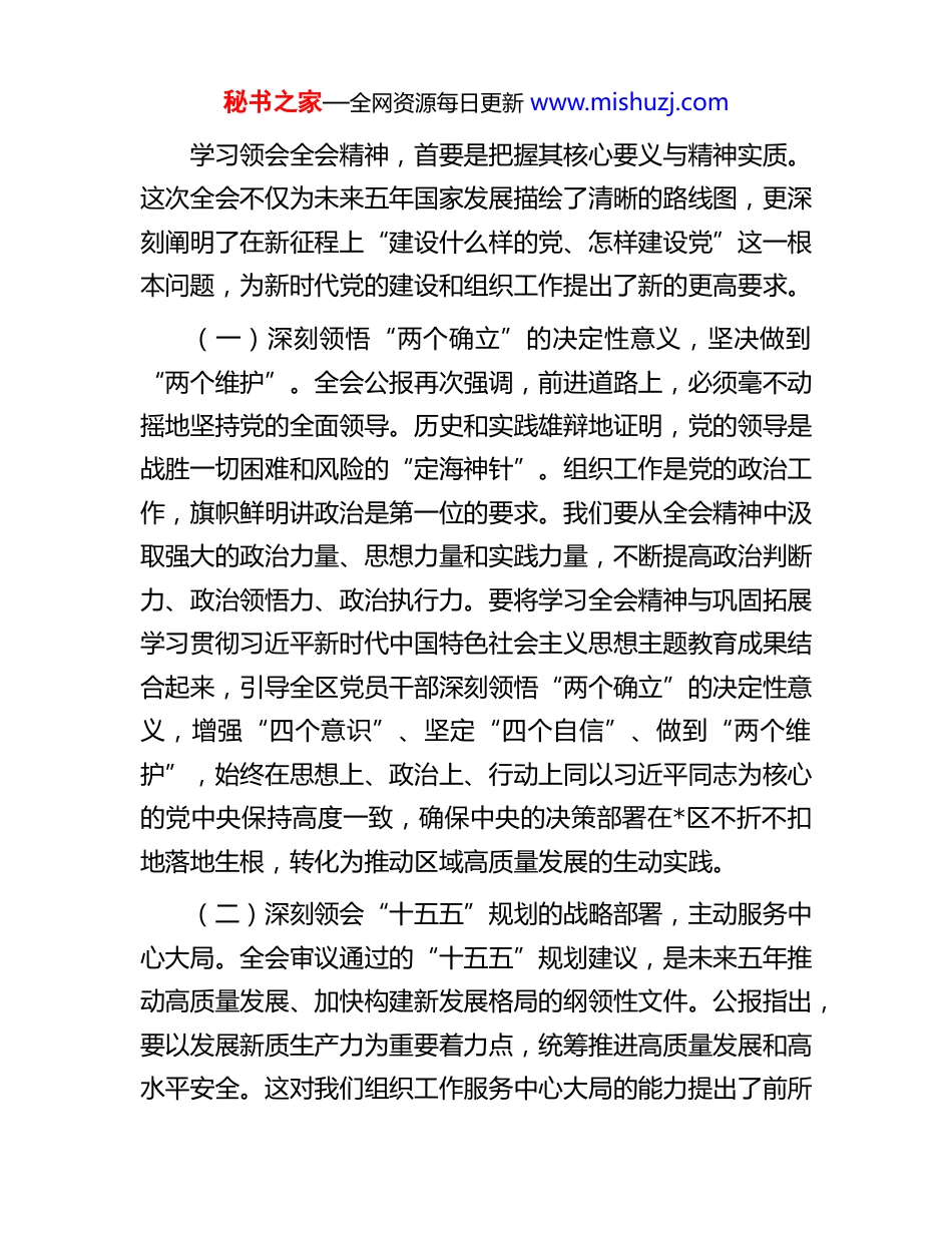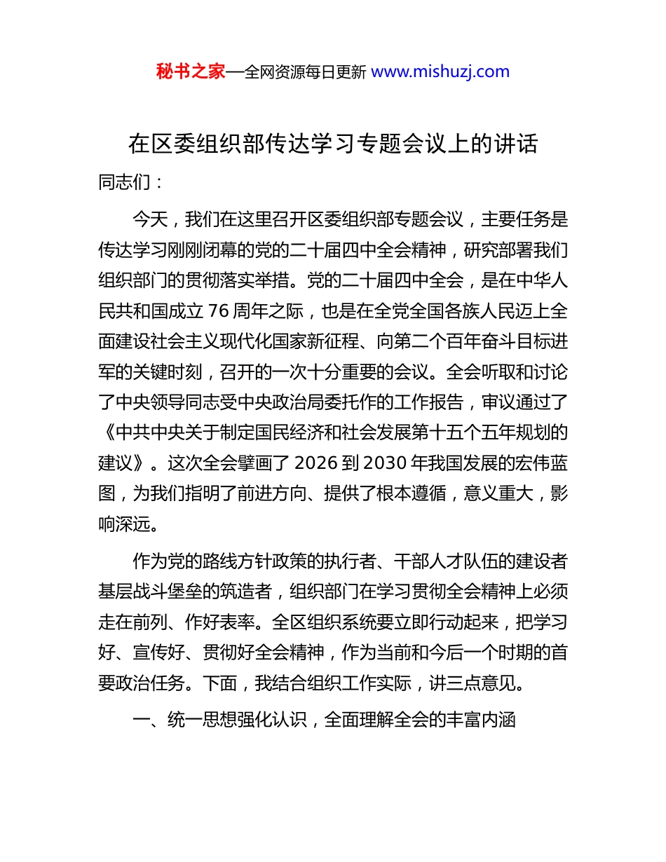 秘书之家—全网资源每日更新 www.mishuzj.com在区委组织部传达学习专题会议上的讲话同志们:今天,我们在这里召开区委组织部专题会议,主要任务是传达学习刚刚闭幕的党的二十届四中全会精神,研究部署我们组织部门的贯彻落实举措。党的二十届四中全会,是在中华人民共和国成立 76 周年之际,也是在全党全国各族人民迈上全面建设社会主义现代化国家新征程、向第二个百年奋斗目标进军的关键时刻,召开的一次十分重要的会议。全会听取和讨论了中央领导同志受中央政治局委托作的工作报告,审议通过了《中共中央关于制定国民经济和社会发展第十五个五年规划的建议》。这次全会擘画了 2026 到 2030 年我国发展的宏伟蓝图,为我们指明了前进方向、提供了根本遵循,意义重大,影响深远。作为党的路线方针政策的执行者、干部人才队伍的建设者基层战斗堡垒的筑造者,组织部门在学习贯彻全会精神上必须走在前列、作好表率。全区组织系统要立即行动起来,把学习好、宣传好、贯彻好全会精神,作为当前和今后一个时期的首要政治任务。下面,我结合组织工作实际,讲三点意见。一、统一思想强化认识,全面理解全会的丰富内涵秘书之家—全网资源每日更新 www.mishuzj.com学习领会全会精神,首要是把握其核心要义与精神实质。这次全会不仅为未来五年国家发展描绘了清晰的路线图,更深刻阐明了在新征程上“建设什么样的党、怎样建设党”这一根本问题,为新时代党的建设和组织工作提出了新的更高要求。(一)深刻领悟“两个确立”的决定性意义,坚决做到“两个维护”。全会公报再次强调,前进道路上,必须毫不动摇地坚持党的全面领导。历史和实践雄辩地证明,党的领导是战胜一切困难和风险的“定海神针”。组织工作是党的政治工作,旗帜鲜明讲政治是第一位的要求。我们要从全会精神中汲取强大的政治力量、思想力量和实践力量,不断提高政治判断力、政治领悟力、政治执行力。要将学习全会精神与巩固拓展学习贯彻习近平新时代中国特色社会主义思想主题教育成果结合起来,引导全区党员干部深刻领悟“两个确立”的决定性意义,增强“四个意识”、坚定“四个自信”、做到“两个维护”,始终在思想上、政治上、行动上同以习近平同志为核心的党中央保持高度一致,确保中央的决策部署在*区不折不扣地落地生根,转化为推动区域高质量发展的生动实践。(二)深刻领会“十五五”规划的战略部署,主动服务中心大局。全会审议通过的“十五五”规划建议,是未来五年推动高质量发展、加快构建新发展格局的纲领性文件。公报指出,要以发展新质生产力为重要着力点,统筹推进高质量发展和高水平安全。这对我们组织工作服务中心大局的能力提出了前所秘书之家—全网资源每日更新 www.mishuzj.com未有的考验。我们必须清醒地认识到,*区正处于转型升级、爬坡过坎的关键阶段,无论是推动大数据与实体经济深度融合,还是培育壮大战略性新兴产业,或是提升城市治理现代化水平,都离不开坚强组织保证和有力的人才支撑。组织部门必须胸怀“国之大者”,自觉把组织工作放到全区乃至全市、全省的发展大局中去思考、去谋划、去推进。要紧紧围绕“十五五”规划建议中明确的重点任务和重大项目,研究制定组织工作服务保障的具体方案,确保党的组织优势、干部优势、人才优势源源不断地转化为发展优势、竞争优势。(三)深刻领会新时代党的建设总要求,精准把握组织工作方向。全会公报强调,实现“十五五”时期发展目标,关键在党,关键在人。必须以彻底的自我革命精神,持续推进新时代党的建设新的伟大工程。全会就“加强干部队伍建设”和“增强基层党组织政治功能和组织功能”作出了新的系统论述。这为我们当前和今后一个时期的组织工作划定了重点、指明了方向。公报中关于“建设适应中国式现代化要求的高素质专业化干部队伍”“推动基层党组织全面进步、全面过硬”等重要论述,既是宏观指引,也是具体要求。我们必须深入研究这些新论述、新要求背后的深刻内涵,结合*区的实际情况,找准贯彻落实的切入点和着力点,确保组织工作始终沿着党中央指引的正确方向前进,不断提高科学化、制度化、规范化水平。二、突出组织工作主线,...