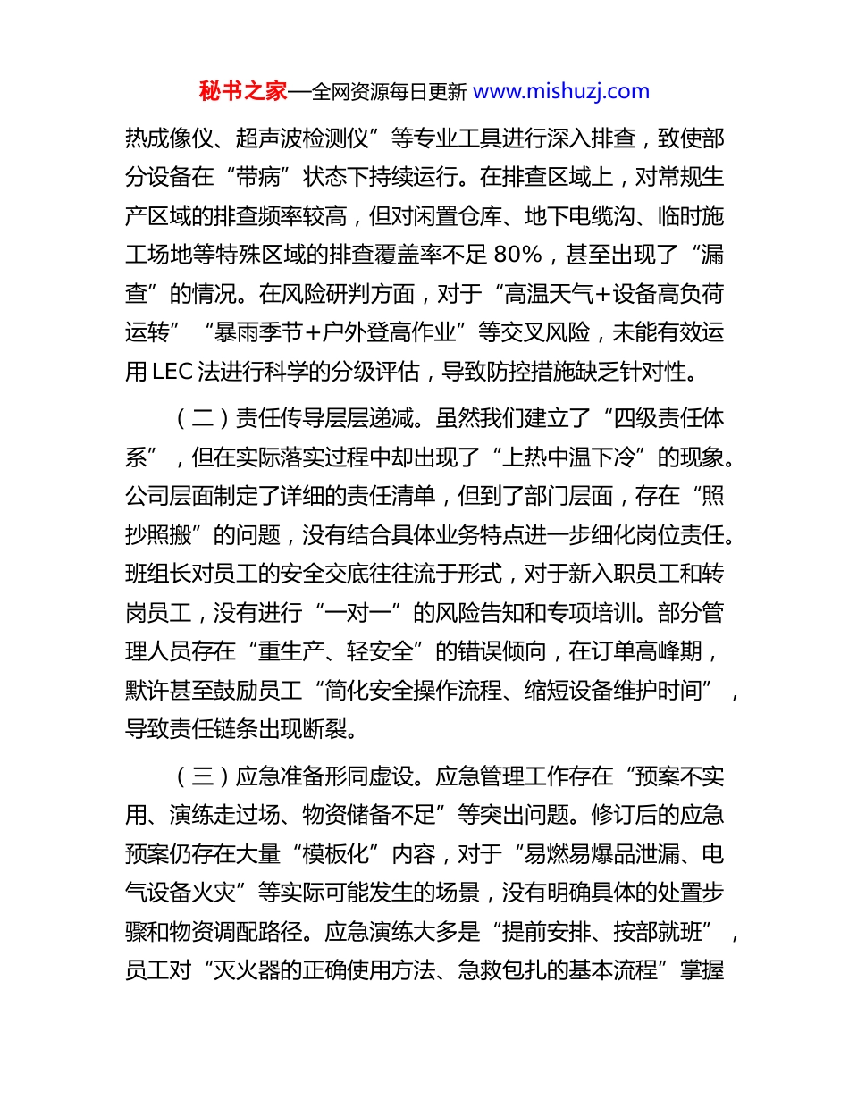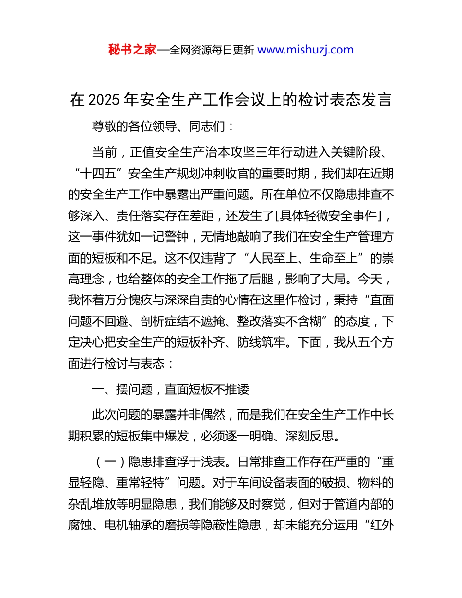 秘书之家—全网资源每日更新 www.mishuzj.com在 2025 年安全生产工作会议上的检讨表态发言尊敬的各位领导、同志们:当前,正值安全生产治本攻坚三年行动进入关键阶段、“十四五”安全生产规划冲刺收官的重要时期,我们却在近期的安全生产工作中暴露出严重问题。所在单位不仅隐患排查不够深入、责任落实存在差距,还发生了[具体轻微安全事件],这一事件犹如一记警钟,无情地敲响了我们在安全生产管理方面的短板和不足。这不仅违背了“人民至上、生命至上”的崇高理念,也给整体的安全工作拖了后腿,影响了大局。今天,我怀着万分愧疚与深深自责的心情在这里作检讨,秉持“直面问题不回避、剖析症结不遮掩、整改落实不含糊”的态度,下定决心把安全生产的短板补齐、防线筑牢。下面,我从五个方面进行检讨与表态:一、摆问题,直面短板不推诿此次问题的暴露并非偶然,而是我们在安全生产工作中长期积累的短板集中爆发,必须逐一明确、深刻反思。(一)隐患排查浮于浅表。日常排查工作存在严重的“重显轻隐、重常轻特”问题。对于车间设备表面的破损、物料的杂乱堆放等明显隐患,我们能够及时察觉,但对于管道内部的腐蚀、电机轴承的磨损等隐蔽性隐患,却未能充分运用“红外秘书之家—全网资源每日更新 www.mishuzj.com热成像仪、超声波检测仪”等专业工具进行深入排查,致使部分设备在“带病”状态下持续运行。在排查区域上,对常规生产区域的排查频率较高,但对闲置仓库、地下电缆沟、临时施工场地等特殊区域的排查覆盖率不足 80%,甚至出现了“漏查”的情况。在风险研判方面,对于“高温天气+设备高负荷运转”“暴雨季节+户外登高作业”等交叉风险,未能有效运用 LEC 法进行科学的分级评估,导致防控措施缺乏针对性。(二)责任传导层层递减。虽然我们建立了“四级责任体系”,但在实际落实过程中却出现了“上热中温下冷”的现象。公司层面制定了详细的责任清单,但到了部门层面,存在“照抄照搬”的问题,没有结合具体业务特点进一步细化岗位责任。班组长对员工的安全交底往往流于形式,对于新入职员工和转岗员工,没有进行“一对一”的风险告知和专项培训。部分管理人员存在“重生产、轻安全”的错误倾向,在订单高峰期,默许甚至鼓励员工“简化安全操作流程、缩短设备维护时间”,导致责任链条出现断裂。(三)应急准备形同虚设。应急管理工作存在“预案不实用、演练走过场、物资储备不足”等突出问题。修订后的应急预案仍存在大量“模板化”内容,对于“易燃易爆品泄漏、电气设备火灾”等实际可能发生的场景,没有明确具体的处置步骤和物资调配路径。应急演练大多是“提前安排、按部就班”,员工对“灭火器的正确使用方法、急救包扎的基本流程”掌握秘书之家—全网资源每日更新 www.mishuzj.com不熟练,甚至在演练中出现“找不到消防器材存放位置”的尴尬情况。应急物资储备存在“重数量、轻质量”的问题,部分车间的消防器材压力不足、急救药品过期,且未按照规定每月进行盘点和更新。(四)双重预防落实乏力。风险分级管控与隐患排查治理双重预防机制未能有效落地。风险辨识工作仅覆盖了主要生产设备,对于“新生产工艺、新业务模式”(如新增的自动化生产线)所带来的风险,没有及时更新风险清单。隐患整改存在“重销号、轻复查”的问题,部分一般隐患虽然标注“已整改”,但未进行复查验证,导致问题反复出现。对员工的双重预防知识培训不足,近 30%的员工不清楚“红橙黄蓝”四级风险的分级标准,难以主动参与到风险防控工作中来。二、挖根源,剖析症结不护短透过问题的表象,深入挖掘根源,我们发现主要是在思想认识、管理机制、人员能力三个方面存在偏差,必须深刻反思、引以为戒。(一)思想认识存在偏差。根本原因在于“忧患意识淡薄底线思维缺失”。存在“经验主义”的错误观念,认为“过去没出过事,现在也不会出事”,对安全生产形势的严峻性和复杂性认识不足。在生产任务繁重时,潜意识里将“保进度、赶产量”放在首位,忽视了安全生产的重要性,导致安全管理工秘书之家—全网资源每日更新 www.mishuzj.com作被边缘化。存在“侥幸心理”,觉得“小隐患不...