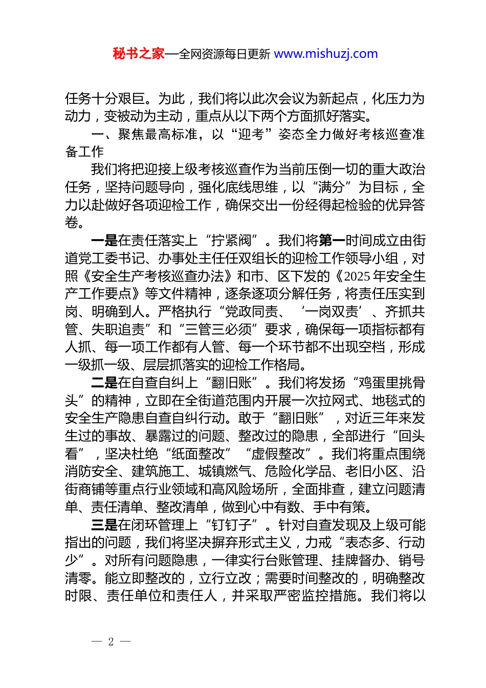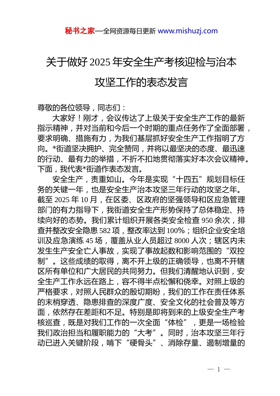 秘书之家—全网资源每日更新 www.mishuzj.com关于做好 2025 年安全生产考核迎检与治本攻坚工作的表态发言尊敬的各位领导,同志们:大家好!刚才,会议传达了上级关于安全生产工作的最新指示精神,并对当前和今后一个时期的重点任务作了全面部署,要求明确、措施有力,为我们基层抓好安全生产工作指明了方向。*街道坚决拥护、完全赞同,并将以最坚决的态度、最迅速的行动、最有力的举措,不折不扣地贯彻落实好本次会议精神。下面,我代表*街道作表态发言。安全生产,责重如山。今年是实现“十四五”规划目标任务的关键一年,也是安全生产治本攻坚三年行动的攻坚之年。截至 2025 年 10 月,在区委、区政府的坚强领导和区应急管理部门的有力指导下,我街道安全生产形势保持了总体稳定、持续向好的态势。我们累计组织开展各类安全检查 950 余次,排查并整改安全隐患 582 项,整改率达到 100%;组织企业安全培训及应急演练 45 场,覆盖从业人员超过 8000 人次;辖区内未发生生产安全亡人事故,实现了事故起数和影响范围的“双控制”。这些成绩的取得,离不开上级的正确领导,也离不开辖区所有单位和广大居民的共同努力。但我们清醒地认识到,安全生产工作永远在路上,容不得半点松懈和侥幸。对照上级的严格要求,对照人民群众的殷切期盼,我们的工作在责任体系的末梢穿透、隐患排查的深度广度、安全文化的社会普及等方面,依然存在差距和不足。特别是即将到来的上级安全生产考核巡查,既是对我们工作的一次全面“体检”,更是一场检验我们政治担当和履职能力的“大考”。同时,治本攻坚三年行动已进入关键阶段,啃下“硬骨头”、消除存量、遏制增量的— 1 —秘书之家—全网资源每日更新 www.mishuzj.com任务十分艰巨。为此,我们将以此次会议为新起点,化压力为动力,变被动为主动,重点从以下两个方面抓好落实。一、聚焦最高标准,以“迎考”姿态全力做好考核巡查准备工作我们将把迎接上级考核巡查作为当前压倒一切的重大政治任务,坚持问题导向,强化底线思维,以“满分”为目标,全力以赴做好各项迎检工作,确保交出一份经得起检验的优异答卷。一是在责任落实上“拧紧阀”。我们将第一时间成立由街道党工委书记、办事处主任任双组长的迎检工作领导小组,对照《安全生产考核巡查办法》和市、区下发的《2025 年安全生产工作要点》等文件精神,逐条逐项分解任务,将责任压实到岗、明确到人。严格执行“党政同责、‘一岗双责’、齐抓共管、失职追责”和“三管三必须”要求,确保每一项指标都有人抓、每一项工作都有人管、每一个环节都不出现空档,形成一级抓一级、层层抓落实的迎检工作格局。二是在自查自纠上“翻旧账”。我们将发扬“鸡蛋里挑骨头”的精神,立即在全街道范围内开展一次拉网式、地毯式的安全生产隐患自查自纠行动。敢于“翻旧账”,对近三年来发生过的事故、暴露过的问题、整改过的隐患,全部进行“回头看”,坚决杜绝“纸面整改”“虚假整改”。我们将重点围绕消防安全、建筑施工、城镇燃气、危险化学品、老旧小区、沿街商铺等重点行业领域和高风险场所,全面排查,建立问题清单、责任清单、整改清单,做到心中有数、手中有策。三是在闭环管理上“钉钉子”。针对自查发现及上级可能指出的问题,我们将坚决摒弃形式主义,力戒“表态多、行动少”。对所有问题隐患,一律实行台账管理、挂牌督办、销号清零。能立即整改的,立行立改;需要时间整改的,明确整改时限、责任单位和责任人,并采取严密监控措施。我们将以— 2 —秘书之家—全网资源每日更新 www.mishuzj.com“钉钉子”的精神,一锤接着一锤敲,确保所有问题隐患在考核巡查组到来之前全部整改到位、闭环清零,不留任何一个漏洞,不丢掉任何一个盲点。二、坚持标本兼治,以“决战”姿态坚决打赢治本攻坚收官之战治本攻坚行动是党中央、国务院作出的重大决策部署 。2025 年作为攻坚之年,我们将坚持“当下改”与“长久立”相结合,既注重解决具体问题,更致力于构建长效机制,推动我街道安全生产治理模式向事前预防转型。一是在源头治理上“下苦功”。我们将坚持“宁肯十防九空,不可用而...