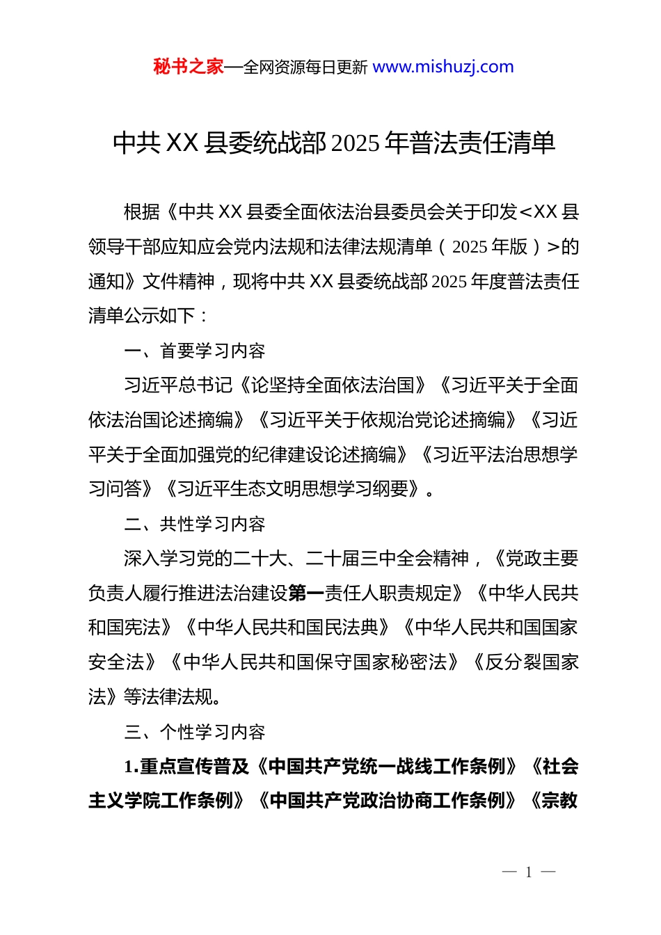 秘书之家—全网资源每日更新 www.mishuzj.com中共 XX 县委统战部 2025 年普法责任清单根据《中共 XX 县委全面依法治县委员会关于印发的通知》文件精神,现将中共 XX 县委统战部 2025 年度普法责任清单公示如下:一、首要学习内容习近平总书记《论坚持全面依法治国》《习近平关于全面依法治国论述摘编》《习近平关于依规治党论述摘编》《习近平关于全面加强党的纪律建设论述摘编》《习近平法治思想学习问答》《习近平生态文明思想学习纲要》。二、共性学习内容深入学习党的二十大、二十届三中全会精神,《党政主要负责人履行推进法治建设第一责任人职责规定》《中华人民共和国宪法》《中华人民共和国民法典》《中华人民共和国国家安全法》《中华人民共和国保守国家秘密法》《反分裂国家法》等法律法规。三、个性学习内容1.重点宣传普及《中国共产党统一战线工作条例》《社会主义学院工作条例》《中国共产党政治协商工作条例》《宗教— 1 —秘书之家—全网资源每日更新 www.mishuzj.com事务条例》《党委(党组)落实统战工作责任制规定》《中华人民共和国归侨侨眷权益保护法》《中华人民共和国归侨侨眷权益保护法实施办法》《贵州省实施<中华人民共和国归侨侨眷权益保护法>办法》《关于进一步促进两岸经济文化交流合作的若干措施》《关于促进两岸经济文化交流合作的若干措施》《关于支持台湾同胞台资企业在大陆农业林业领域发展的若干措施》《贵州省关于促进黔台经济文化交流合作的实施意见》等。2.加强对非公有制经济组织、社会组织管理和从业人员法治教育的协调指导,促进依法诚信经营管理,提高企业经营管理人员依法经营、依法管理、依法维权的意识和能力。四、普法对象普法重点对象为 XX 县委统战部全体干部、民主党派、无党派人士、新的社会阶层人士、网络人士、党外知识分子、港澳台侨胞(属)、侨资企业、归国留学人员、宗教活动场所管理人员及群众等统战工作服务对象。五、普法目标健全普法宣传教育机制,法治宣传教育实效性进一步增强依法治理进一步深化,提升干部法治观念和全体党员党章党规意识,提高全社会厉行法治的积极性和主动性,形成守法光荣、— 2 —秘书之家—全网资源每日更新 www.mishuzj.com违法可耻的社会氛围。— 3 —