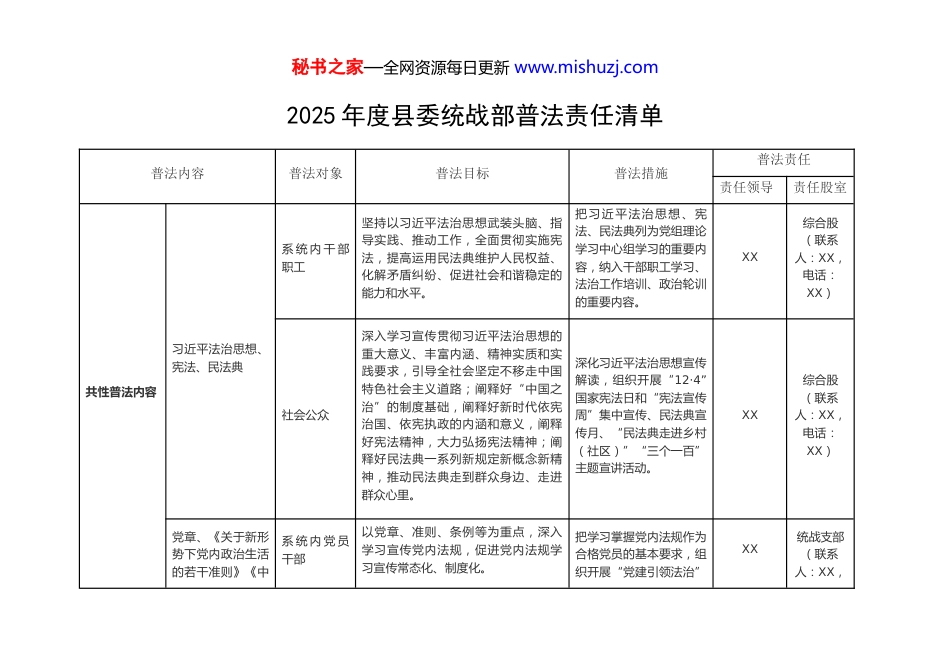 秘书之家—全网资源每日更新 www.mishuzj.com2025 年度县委统战部普法责任清单普法内容普法对象普法目标普法措施普法责任责任领导责任股室共性普法内容习近平法治思想、宪法、民法典系 统 内 干 部职工坚持以习近平法治思想武装头脑、指导实践、推动工作,全面贯彻实施宪法,提高运用民法典维护人民权益、化解矛盾纠纷、促进社会和谐稳定的能力和水平。把习近平法治思想、宪法、民法典列为党组理论学习中心组学习的重要内容,纳入干部职工学习、法治工作培训、政治轮训的重要内容。XX综合股(联系人:XX,电话:XX)社会公众深入学习宣传贯彻习近平法治思想的重大意义、丰富内涵、精神实质和实践要求,引导全社会坚定不移走中国特色社会主义道路;阐释好“中国之治”的制度基础,阐释好新时代依宪治国、依宪执政的内涵和意义,阐释好宪法精神,大力弘扬宪法精神;阐释好民法典一系列新规定新概念新精神,推动民法典走到群众身边、走进群众心里。深化习近平法治思想宣传解读,组织开展“12·4”国家宪法日和“宪法宣传周”集中宣传、民法典宣传月、“民法典走进乡村(社区)”“三个一百”主题宣讲活动。XX综合股(联系人:XX,电话:XX)党章、《关于新形势下党内政治生活的若干准则》《中系 统 内 党 员干部以党章、准则、条例等为重点,深入学习宣传党内法规,促进党内法规学习宣传常态化、制度化。把学习掌握党内法规作为合格党员的基本要求,组织开展“党建引领法治”XX统战支部(联系人:XX,秘书之家—全网资源每日更新 www.mishuzj.com国共产党廉洁自律准则》《信访工作条例》等党内法规主题宣传,把党内法规列入“三会一课”内容,在考核党员、干部时注意了解相关情况。电话:XX ))行政处罚法、行政许可法、行政强制法、四川省行政执法监督条例系 统 内 干 部职工推进严格规范公正文明执法,依法全面正确履行行政执法职能,保护公民、法人或者其他组织的合法权益。将行政处罚法纳入行政执法培训内容,作为行政执法人员的必修课,在落实行政执法公示、执法全过程记录、重大执法决定法制审核制度中加强普法宣传,深入开展行政执法人员、行政复议人员等以案释法活动,面向社会广泛开展宣传。XX民宗股(联系人:XX,电话:XX ))重大行政决策程序暂行条例、四川省行政规范性文件管理办法系 统 内 干 部职工强化依法决策意识,严格落实重大行政决策程序,提高决策质量和效率。加强学习、培训和宣传工作,在合法性审查(审核)工作中实时普法。XX综合股(联系人:XX,电话:XX)行政复议法、国家赔偿法、行政诉讼法系 统 内 干 部职工发挥行政复议化解行政争议主渠道作用,加强和规范行政应诉工作,不断促进社会公平正义。加强学习、培训和宣传工作,在行政复议应诉工作中实时普法,加大以案普法力度,开展“行政复议进乡村、进社区”宣传活动。XX综合股(联系人:XX,电话:XX)秘书之家—全网资源每日更新 www.mishuzj.com个性普法内容《中国共产党统一战线工作条例》系 统 内 党 员干 部 、 统 战工 作 各 领 域人士坚持和加强党对统一战线工作的绝对领导,忠诚履行职责使命,做好新时代党的统一战线工作。组织学习,开展专题培训,全面准确掌握《条例》基本精神、主要内容和工作要求。XX综合股(联系人:XX,电话:XX))《四川省民族团结进步条例》系 统 内 党 员干 部 、 社 会公众推动各民族坚定对伟大祖国、中华民族、中华文化、中国共产党、中国特色社会主义的高度认同,牢固树立中华民族多元一体格局观念,促进各民族共同团结奋斗、共同繁荣发展,全力推动各民族共同走向社会主义现代化。加强学习、培训和宣传工作,在各族群众中大力开展《条例》宣传。XX民宗股(联系人:XX,电话:XX )《宗教事务条例》《四川省宗教事务条例》等涉宗教工作的法律法规系 统 内 党 员干 部 、 宗 教教 职 人 员 、信教群众保障公民宗教信仰自由,维护宗教和睦与社会和谐,规范宗教事务管理,提高宗教工作法治化水平。加强系统内部学习培训,依法加强宗教事务管理。加强宗教教职人员、信教群众的普法宣传工作,不断提高...