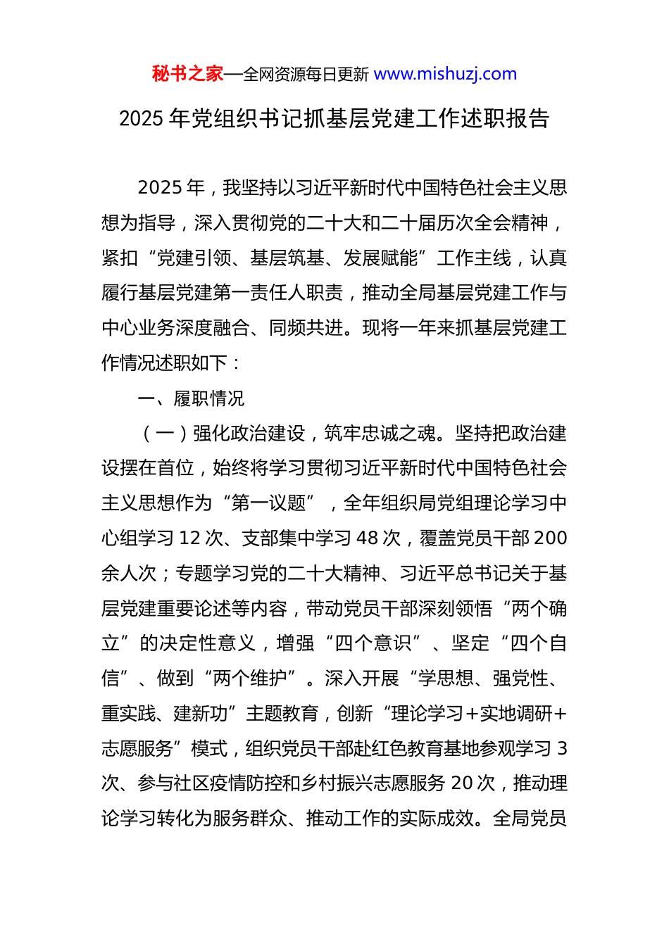 秘书之家—全网资源每日更新 www.mishuzj.com2025 年党组织书记抓基层党建工作述职报告 2025 年,我坚持以习近平新时代中国特色社会主义思想为指导,深入贯彻党的二十大和二十届历次全会精神,紧扣“党建引领、基层筑基、发展赋能”工作主线,认真履行基层党建第一责任人职责,推动全局基层党建工作与中心业务深度融合、同频共进。现将一年来抓基层党建工作情况述职如下:一、履职情况(一)强化政治建设,筑牢忠诚之魂。坚持把政治建设摆在首位,始终将学习贯彻习近平新时代中国特色社会主义思想作为“第一议题”,全年组织局党组理论学习中心组学习 12 次、支部集中学习 48 次,覆盖党员干部 200余人次;专题学习党的二十大精神、习近平总书记关于基层党建重要论述等内容,带动党员干部深刻领悟“两个确立”的决定性意义,增强“四个意识”、坚定“四个自信”、做到“两个维护”。深入开展“学思想、强党性、重实践、建新功”主题教育,创新“理论学习+实地调研+志愿服务”模式,组织党员干部赴红色教育基地参观学习 3次、参与社区疫情防控和乡村振兴志愿服务 20 次,推动理论学习转化为服务群众、推动工作的实际成效。全局党员秘书之家—全网资源每日更新 www.mishuzj.com干部政治判断力、政治领悟力、政治执行力显著提升,在重大任务中始终保持对党忠诚的政治本色。(二)夯实组织基础,建强战斗堡垒。坚持抓基层、打基础,推动基层党组织标准化规范化建设走深走实。全年完成 3 个支部换届选举,选优配强支部班子,将 3 名业务骨干充实到支部书记岗位,支部战斗力进一步增强;开展“支部建设提升年”活动,制定《支部工作标准化手册》,规范“三会一课”、主题党日、民主评议党员等制度执行,全年支部开展“三会一课”48 次、主题党日 12次,民主生活会、组织生活会实现 100%全覆盖,谈心谈话 200 余人次,党员参与率达 98%以上。加强支部工作考核,建立“月度检查、季度评估、年度评优”机制,对支部组织生活、党员教育管理等情况进行动态监测,推动支部工作从“达标”向“提质”转变。(三)聚焦队伍建设,提升能力素质。坚持党管干部原则,加强党员干部教育培养。全年发展党员 5 名,其中35 岁以下青年党员 3 名,党员队伍结构不断优化;开展“党员先锋岗”创建活动,评选“党员先锋”10 名,通过“先锋事迹宣讲”“岗位练兵”等形式,发挥党员模范带头作用。加强干部能力提升,组织干部参加上级党委举办的党建业务培训班 5 期,选派 10 名干部到基层一线挂职锻秘书之家—全网资源每日更新 www.mishuzj.com炼,推动干部在实践中增长才干。完善干部考核评价体系,将政治表现、工作业绩、作风形象纳入考核指标,树立“能者上、庸者下”的用人导向,激励干部担当作为。(四)深化融合发展,赋能中心工作。坚持“党建+业务”融合发展理念,推动党建工作与中心业务同部署、同落实、同考核。结合局职能职责,打造“党建+项目攻坚”“党建+志愿服务”等特色品牌,组织党员干部参与重点项目建设 12 个,推动项目完成率达 120%;参与“我为群众办实事”实践活动,为群众解决就医、就业等实际问题 50件,群众满意度达 95%以上。将党建工作纳入业务考核体系,占比达 20%,推动支部将党建工作融入业务流程,如在行政审批环节设立“党员服务窗口”,优化办事流程,缩短办理时间 30%,实现党建与业务“双促进、双提升”。(五)从严管党治党,涵养清风正气。坚持全面从严治党,落实主体责任,制定《党风廉政建设工作计划》,与支部书记签订《党风廉政建设责任书》,明确责任分工。开展“廉政教育月”活动,组织观看廉政教育片、参观廉政教育基地、签订《廉政承诺书》等活动,增强党员干部廉洁自律意识。加强监督检查,全年开展廉政检查 6次,重点检查干部作风、资金使用、项目审批等方面,发秘书之家—全网资源每日更新 www.mishuzj.com现问题 3 个,均督促整改到位。严格执行纪律规定及其实施细则,坚决反对“四风”,全年未发生违规违纪问题,营造了风清气正的政治生态。二、存在问题和下一步工作打算回顾一年来的工作,虽然取得一定成绩...