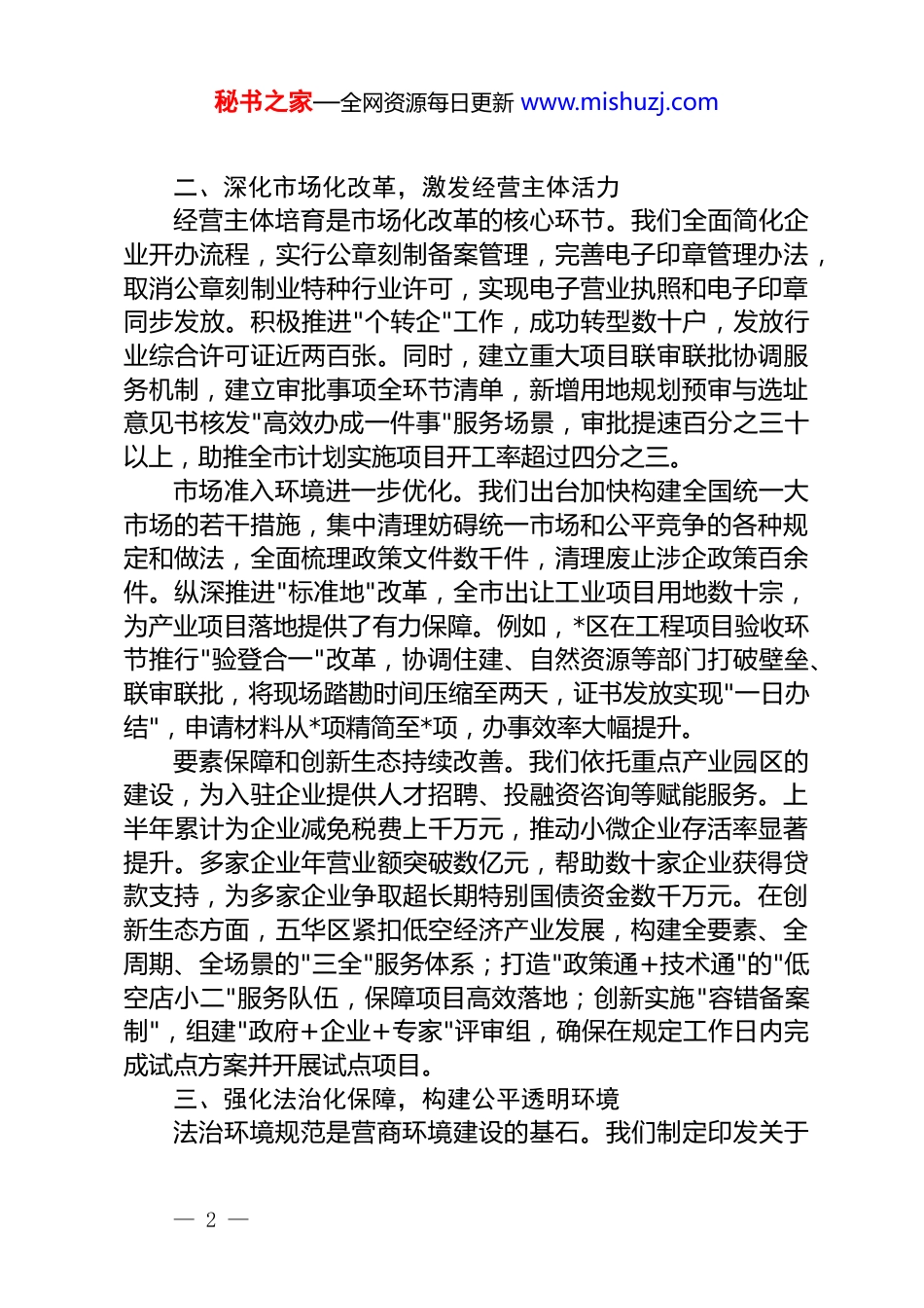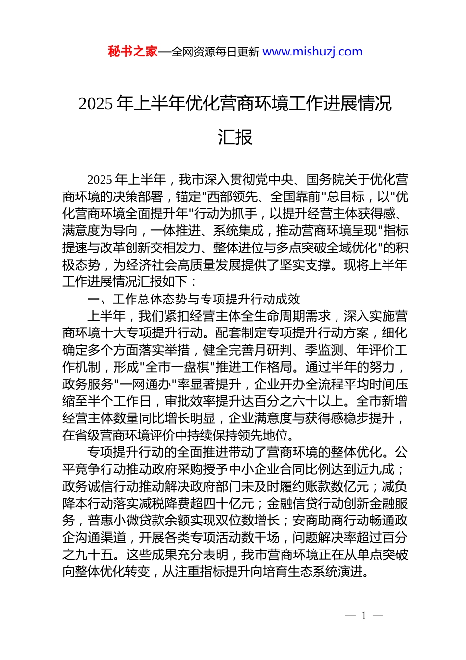 秘书之家—全网资源每日更新 www.mishuzj.com2025 年上半年优化营商环境工作进展情况汇报2025 年上半年,我市深入贯彻党中央、国务院关于优化营商环境的决策部署,锚定"西部领先、全国靠前"总目标,以"优化营商环境全面提升年"行动为抓手,以提升经营主体获得感、满意度为导向,一体推进、系统集成,推动营商环境呈现"指标提速与改革创新交相发力、整体进位与多点突破全域优化"的积极态势,为经济社会高质量发展提供了坚实支撑。现将上半年工作进展情况汇报如下:一、工作总体态势与专项提升行动成效上半年,我们紧扣经营主体全生命周期需求,深入实施营商环境十大专项提升行动。配套制定专项提升行动方案,细化确定多个方面落实举措,健全完善月研判、季监测、年评价工作机制,形成"全市一盘棋"推进工作格局。通过半年的努力,政务服务"一网通办"率显著提升,企业开办全流程平均时间压缩至半个工作日,审批效率提升达百分之六十以上。全市新增经营主体数量同比增长明显,企业满意度与获得感稳步提升,在省级营商环境评价中持续保持领先地位。专项提升行动的全面推进带动了营商环境的整体优化。公平竞争行动推动政府采购授予中小企业合同比例达到近九成;政务诚信行动推动解决政府部门未及时履约账款数亿元;减负降本行动落实减税降费超四十亿元;金融信贷行动创新金融服务,普惠小微贷款余额实现双位数增长;安商助商行动畅通政企沟通渠道,开展各类专项活动数千场,问题解决率超过百分之九十五。这些成果充分表明,我市营商环境正在从单点突破向整体优化转变,从注重指标提升向培育生态系统演进。— 1 —秘书之家—全网资源每日更新 www.mishuzj.com二、深化市场化改革,激发经营主体活力经营主体培育是市场化改革的核心环节。我们全面简化企业开办流程,实行公章刻制备案管理,完善电子印章管理办法,取消公章刻制业特种行业许可,实现电子营业执照和电子印章同步发放。积极推进"个转企"工作,成功转型数十户,发放行业综合许可证近两百张。同时,建立重大项目联审联批协调服务机制,建立审批事项全环节清单,新增用地规划预审与选址意见书核发"高效办成一件事"服务场景,审批提速百分之三十以上,助推全市计划实施项目开工率超过四分之三。市场准入环境进一步优化。我们出台加快构建全国统一大市场的若干措施,集中清理妨碍统一市场和公平竞争的各种规定和做法,全面梳理政策文件数千件,清理废止涉企政策百余件。纵深推进"标准地"改革,全市出让工业项目用地数十宗,为产业项目落地提供了有力保障。例如,*区在工程项目验收环节推行"验登合一"改革,协调住建、自然资源等部门打破壁垒、联审联批,将现场踏勘时间压缩至两天,证书发放实现"一日办结",申请材料从*项精简至*项,办事效率大幅提升。要素保障和创新生态持续改善。我们依托重点产业园区的建设,为入驻企业提供人才招聘、投融资咨询等赋能服务。上半年累计为企业减免税费上千万元,推动小微企业存活率显著提升。多家企业年营业额突破数亿元,帮助数十家企业获得贷款支持,为多家企业争取超长期特别国债资金数千万元。在创新生态方面,五华区紧扣低空经济产业发展,构建全要素、全周期、全场景的"三全"服务体系;打造"政策通+技术通"的"低空店小二"服务队伍,保障项目高效落地;创新实施"容错备案制",组建"政府+企业+专家"评审组,确保在规定工作日内完成试点方案并开展试点项目。三、强化法治化保障,构建公平透明环境法治环境规范是营商环境建设的基石。我们制定印发关于— 2 —秘书之家—全网资源每日更新 www.mishuzj.com规范行政机关涉企行为优化法治化营商环境的措施,进一步规范涉企行政执法检查,梳理市本级涉企行政检查计划,向社会公布实施。健全知识产权纠纷多元化解机制,入驻人民法院人民调解系统,今年受理商标注册业务数十件,累计注册商标上万件,有效发明数百件,万人有效发明拥有量达到可观数字。同时,推行涉企轻微违法"免罚轻罚"柔性执法,鼓励经营者主动纠错、自我纠错、主动消除或减轻社会危害后果,彰显司法"温度"。知识产权保护体系不断完善。我们创新建立知识产权快速协同保护机...