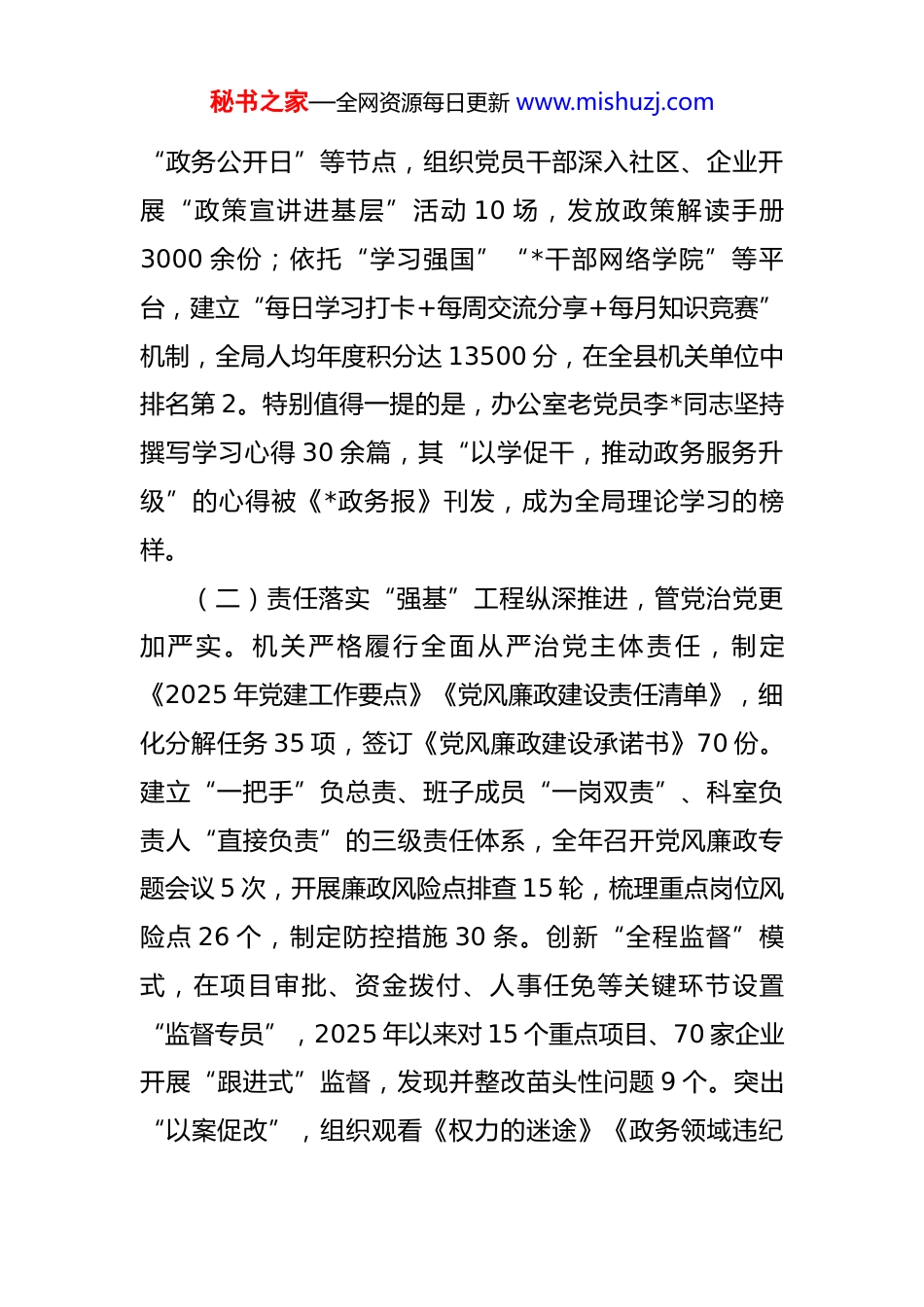 秘书之家—全网资源每日更新 www.mishuzj.com2025 年政府机关政治生态分析报告 根据《关于常态化开展政治生态分析研判工作的实施意见》(*组发〔2025〕12 号)文件要求,本政府机关坚持问题导向、目标导向、结果导向,通过专题调研、谈心谈话、查阅资料、征求意见等方式,全面梳理 2025 年以来全局政治生态建设情况,深入查摆存在的短板弱项,深刻剖析问题根源,针对性提出整改提升措施。现将分析研判情况报告如下。一、政治生态建设总体情况2025 年以来,本政府机关坚持以习近平新时代中国特色社会主义思想为指导,深入学习贯彻党的二十大及二十届三中全会精神,严格落实新时代党的建设总要求,推动政治生态持续向上向好,为高效履行政府职能、服务地方经济社会发展提供了坚强政治保障。(一)理论武装“铸魂”工程扎实推进,政治方向更加坚定。机关始终把政治建设摆在首位,严格落实“第一议题”制度,2025 年累计召开党组会 23 次,专题学习习近平总书记关于政府工作重要论述 15 次,开展“习近平新时代治国理政思想”专题研讨 8 场,覆盖干部职工 220 余人次。创新“线上+线下”学习模式,结合“国家宪法日”秘书之家—全网资源每日更新 www.mishuzj.com“政务公开日”等节点,组织党员干部深入社区、企业开展“政策宣讲进基层”活动 10 场,发放政策解读手册3000 余份;依托“学习强国”“*干部网络学院”等平台,建立“每日学习打卡+每周交流分享+每月知识竞赛”机制,全局人均年度积分达 13500 分,在全县机关单位中排名第 2。特别值得一提的是,办公室老党员李*同志坚持撰写学习心得 30 余篇,其“以学促干,推动政务服务升级”的心得被《*政务报》刊发,成为全局理论学习的榜样。(二)责任落实“强基”工程纵深推进,管党治党更加严实。机关严格履行全面从严治党主体责任,制定《2025 年党建工作要点》《党风廉政建设责任清单》,细化分解任务 35 项,签订《党风廉政建设承诺书》70 份。建立“一把手”负总责、班子成员“一岗双责”、科室负责人“直接负责”的三级责任体系,全年召开党风廉政专题会议 5 次,开展廉政风险点排查 15 轮,梳理重点岗位风险点 26 个,制定防控措施 30 条。创新“全程监督”模式,在项目审批、资金拨付、人事任免等关键环节设置“监督专员”,2025 年以来对 15 个重点项目、70 家企业开展“跟进式”监督,发现并整改苗头性问题 9 个。突出“以案促改”,组织观看《权力的迷途》《政务领域违纪秘书之家—全网资源每日更新 www.mishuzj.com违法警示录》等专题片 5 场,开展“以案说纪”微课堂 8次,干部职工纪律意识、规矩意识显著增强。(三)权力监督运行“规范”工程稳步推进,权力行使更加透明。建立健全权力运行制约和监督体系,加强对权力运行的全过程监督。制定完善了《重大事项决策制度》《财务管理制度》《人事任免制度》等一系列规章制度,明确了权力运行的流程和规范,确保权力在阳光下运行。加强对项目审批、资金使用、行政执法等重点领域和关键环节的监督检查,严肃查处违规违纪行为,有效防范了廉政风险。2025 年,通过审计监督发现并纠正资金使用不规范问题 3 起,涉及金额 50 余万元。(四)依法依规履职“效能”工程深入推进,政务服务更加高效。坚持依法行政、依法办事,严格执行国家法律法规和政策规定,不断提高政府治理能力和水平。加强行政执法队伍建设,组织开展执法人员培训和考试,提高执法人员的业务素质和执法水平。深入推进“放管服”改革,优化营商环境,提高服务效能。2025 年,行政审批事项平均办理时限缩短至 5 个工作日,较去年缩短了 3 个工作日;政务服务事项网上可办率达到 95%以上,让群众和企业办事更加便捷。(五)纠治“四风”“清朗”工程持续深化,工作作秘书之家—全网资源每日更新 www.mishuzj.com风更加务实。严格执行纪律规定要求,2025 年全局“三公”经费支出同比下降 20%,会议文件数量同比减少28%。大力整治“庸懒散慢拖”问题,开展“作风建设提升季”活动,建立“日巡查、周通报、月考评”机制,通报迟到早退、脱岗串岗等...