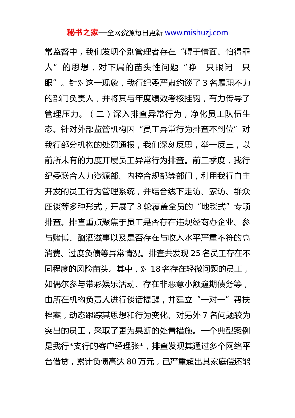 秘书之家—全网资源每日更新 www.mishuzj.com关于银行问题排查与整改成效的工作报告 根据总行党委关于全面从严治党、深化内部治理的总体部署,*分行纪委聚焦主责主业,坚持问题导向,在2025 年前三季度围绕员工行为管理、信贷、运营、股东管理等关键领域,开展了系列问题排查与处置工作。本报告旨在坦诚揭示问题、深度剖析原因、系统总结成效,以期为下一阶段工作提供精准指引,推动分行高质量发展行稳致远。一、聚焦主责主业,深化员工行为监督与管理员工是银行最宝贵的资产,也是风险防控的第一道防线。今年以来,我行坚持严管与厚爱结合,通过构建“问题发现—难点剖析—对策部署”的管理闭环,有效遏制了违规行为的发生,净化了内部生态。(一)强化中层干部管理,筑牢“关键少数”防线。中层管理人员作为连接决策层和执行层的关键枢纽,其行为示范和管理效能直接影响全行风气。我行始终将对“关键少数”的监督作为重中之重。前三季度,我行组织了针对全行 150 余名中层管理人员的“新时期金融干部责任与担当”专题轮训,强化其“一岗双责”意识。同时,纪检部门对 25 名新提任及轮岗的中层干部进行了一对一廉洁谈话,明确纪律红线。在日秘书之家—全网资源每日更新 www.mishuzj.com常监督中,我们发现个别管理者存在“碍于情面、怕得罪人”的思想,对下属的苗头性问题“睁一只眼闭一只眼”。针对这一现象,我行纪委严肃约谈了 3 名履职不力的部门负责人,并将其与年度绩效考核挂钩,有力传导了管理压力。(二)深入排查异常行为,净化员工队伍生态。针对外部监管机构因“员工异常行为排查不到位”对我行部分机构的处罚通报,我们深刻反思,举一反三,以前所未有的力度开展员工异常行为排查。前三季度,我行纪委联合人力资源部、内控合规部等部门,利用我行自主开发的员工行为管理系统,并结合线下走访、家访、群众座谈等多种形式,开展了 3 轮覆盖全员的“地毯式”专项排查。排查重点聚焦于员工是否存在违规经商办企业、参与赌博、酗酒滋事以及是否存在与收入水平严重不符的高消费、过度负债等异常情况。排查共发现 25 名员工存在不同程度的风险苗头。其中,对 18 名存在轻微问题的员工,如偶尔参与带彩娱乐活动、存在非恶意小额逾期债务等,由所在机构负责人进行谈话提醒,并建立“一对一”帮扶档案,动态跟踪其思想和行为变化。对另外 7 名问题较为突出的员工,采取了更为果断的处置措施。一个典型案例是我行*支行的客户经理张*,排查发现其通过多个网络平台借贷,累计负债高达 80 万元,已严重超出其家庭偿还能秘书之家—全网资源每日更新 www.mishuzj.com力,且存在向客户借款的苗头。经深入核查,其负债主要源于网络赌博。对此,我行纪委果断介入:一是立即暂停其客户经理职务,调离关键岗位,防止风险蔓延;二是会同其家庭成员进行联合帮扶,劝导其戒除赌瘾,并协助其制定债务重组与偿还计划;三是依据《中国建设银行员工行为管理办法》相关规定,给予其记大过处分,并在全行范围内进行匿名通报,起到了“处置一人、警示一片”的震慑效果。通过这一系列举措,我行逐步扭转了过去在员工异常行为管理上存在的宽松软问题。(三)延伸八小时外监督,构建全天候管理闭环。大量案例表明,员工“八小时外”的“生活圈”和“社交圈”是滋生问题的温床。我行积极探索对员工“八小时外”行为的有效监督路径。前三季度,我们共对 50 名身处关键岗位或存在风险苗头的员工进行了家访,与家属沟通,了解员工的家庭、生活状况,共同构筑家庭廉洁防线。此外,我行在各分支机构聘请了 20 名社会监督员,通过他们收集员工在社区的表现和口碑。我行升级后的员工行为管理系统,也加强了对员工社交媒体、消费习惯等公开信息的风险模型分析,实现了对员工行为的动态和长期监测,尽早识别和预警潜在风险。二、严守信贷业务底线,提升资产质量与从业素养秘书之家—全网资源每日更新 www.mishuzj.com信贷业务是银行的生命线,也是廉洁风险的高发区。我行始终以“零容忍”的态度对待信贷领域的违规行为,坚决守住不发生系统性风险的底线。(一)深化信贷领域治理,精准...
