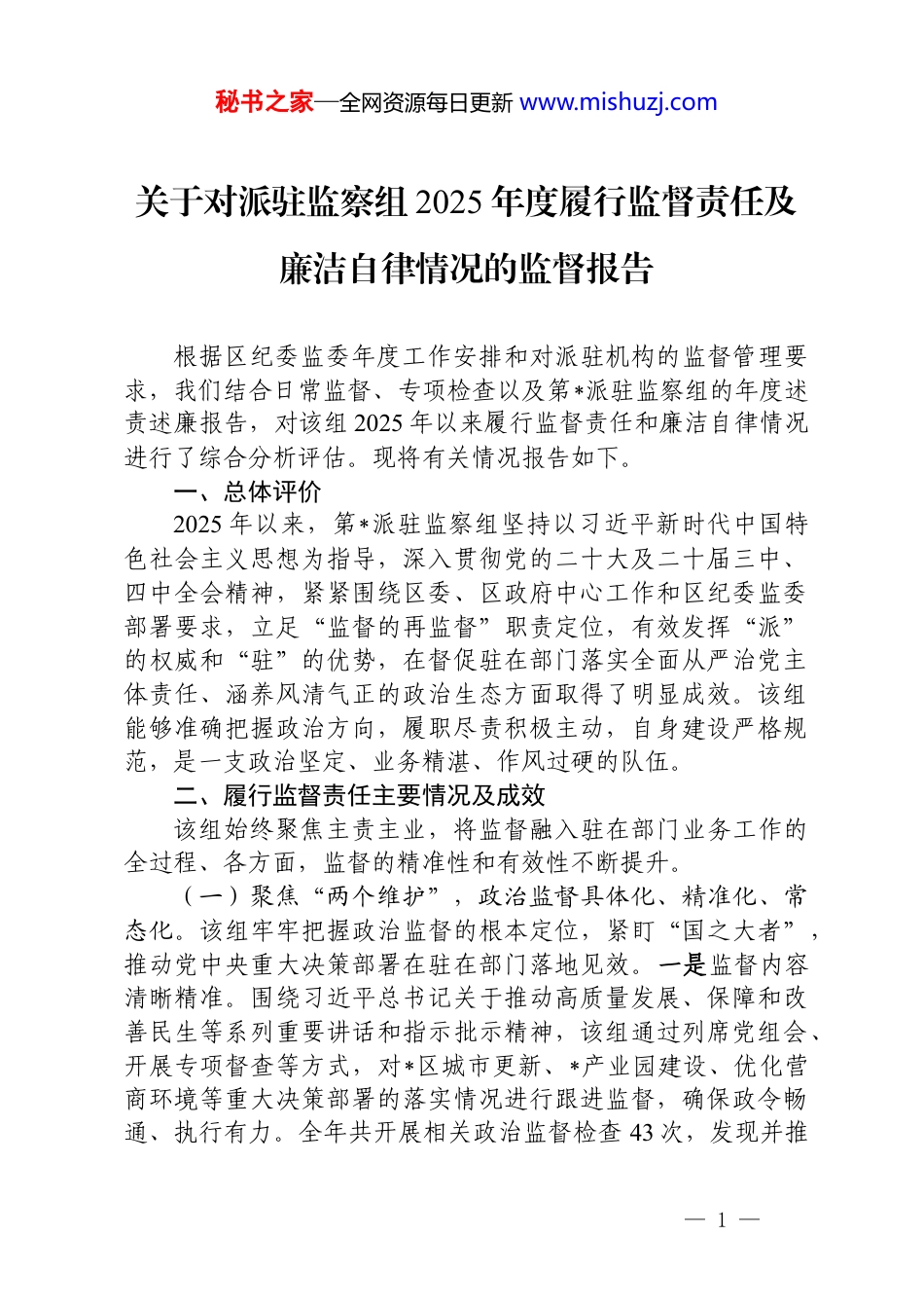 秘书之家—全网资源每日更新 www.mishuzj.com关于对派驻监察组 2025 年度履行监督责任及廉洁自律情况的监督报告根据区纪委监委年度工作安排和对派驻机构的监督管理要求,我们结合日常监督、专项检查以及第*派驻监察组的年度述责述廉报告,对该组 2025 年以来履行监督责任和廉洁自律情况进行了综合分析评估。现将有关情况报告如下。一、总体评价2025 年以来,第*派驻监察组坚持以习近平新时代中国特色社会主义思想为指导,深入贯彻党的二十大及二十届三中、四中全会精神,紧紧围绕区委、区政府中心工作和区纪委监委部署要求,立足“监督的再监督”职责定位,有效发挥“派”的权威和“驻”的优势,在督促驻在部门落实全面从严治党主体责任、涵养风清气正的政治生态方面取得了明显成效。该组能够准确把握政治方向,履职尽责积极主动,自身建设严格规范,是一支政治坚定、业务精湛、作风过硬的队伍。二、履行监督责任主要情况及成效该组始终聚焦主责主业,将监督融入驻在部门业务工作的全过程、各方面,监督的精准性和有效性不断提升。(一)聚焦“两个维护”,政治监督具体化、精准化、常态化。该组牢牢把握政治监督的根本定位,紧盯“国之大者”,推动党中央重大决策部署在驻在部门落地见效。一是监督内容清晰精准。围绕习近平总书记关于推动高质量发展、保障和改善民生等系列重要讲话和指示批示精神,该组通过列席党组会、开展专项督查等方式,对*区城市更新、*产业园建设、优化营商环境等重大决策部署的落实情况进行跟进监督,确保政令畅通、执行有力。全年共开展相关政治监督检查 43 次,发现并推— 1 —秘书之家—全网资源每日更新 www.mishuzj.com动整改问题 51 个。二是监督机制健全完善。严格落实与驻在部门党组的会商研判机制,坚持每季度通报监督情况、每半年专题研究一次全面从严治党工作。创新实施“嵌入式”监督,派员全程参与驻在部门巡察整改、民主生活会等重要政治活动,提出整改建议,压实政治责任。全年与驻在部门党组主要负责同志开展专题会商 4 次,与领导班子成员开展廉政谈话提醒 95人次,批评教育 18 人次,有效传导了压力。三是监督成效切实显现。紧盯“关键少数”,特别是各驻在部门“一把手”和领导班子成员,协助建立健全领导干部廉政档案 260 余份,实现动态更新。在元旦、春节、国庆等重要节点,牵头或联合驻在部门开展作风建设专项督查 12 次,通过明察暗访、大数据筛查等方式,严肃查处隐形变异“四风”问题,共发出监察建议书42 份,有力巩固了中央八项规定精神堤坝。(二)聚焦抓早抓小,日常监督精细化规范化。该组坚持把纪律和规矩挺在前面,深化运用“四种形态”特别是第一种形态,对党员干部的苗头性、倾向性问题做到早发现、早提醒、早处置,防止小问题演变成大错误。一是在重大事项监督上保持高度警觉。紧盯驻在部门权力运行的关键环节,对干部选拔任用、职称评定、大型设备采购、政府购买服务等事项,进行全过程、全链条监督。2025 年,在对*区智慧城市管理平台项目进行监督时,及时发现招标文件中存在排他性条款,提出修改建议,有效避免了廉政风险和国有资产流失。全年共对干部提拔、评优评先等出具党风廉政意见 150 余人次,均做到事实清楚、依据充分。二是在规范权力运行上做到慎始慎终。督促并协助驻在部门梳理廉政风险点,完善“三重一大”事项决策机制。建立“三重一大”议题会商制度,对涉及重大项目安排、大额资金使用的议题,提前介入,分析研判风险,提出防范建议。全年共列席驻在部门“三重一大”相关会议 85 次,提出意见建议 110 余条,绝大部分被采纳,有效规范了决策行为。三— 2 —秘书之家—全网资源每日更新 www.mishuzj.com是在推动责任落实上体现担当作为。积极协助、督促驻在部门党组扛起主体责任。在全区推动党政机关习惯过紧日子的要求下,该组会同驻在部门开展专项检查,对公务接待超标、办公用房超面积等问题进行严肃纠正。同时,积极参与区委巡察工作,承担了对*单位、*单位巡察反馈问题的整改监督任务,多次深入一线实地督查,推动解决了历史遗留的*地块权属纠纷等一批重难点...