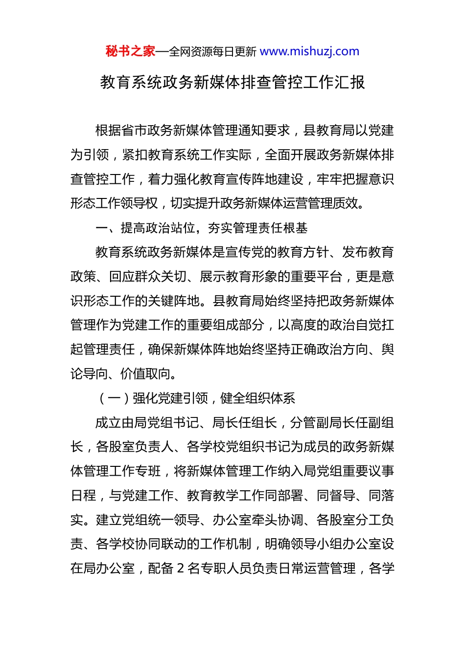 秘书之家—全网资源每日更新 www.mishuzj.com教育系统政务新媒体排查管控工作汇报 根据省市政务新媒体管理通知要求,县教育局以党建为引领,紧扣教育系统工作实际,全面开展政务新媒体排查管控工作,着力强化教育宣传阵地建设,牢牢把握意识形态工作领导权,切实提升政务新媒体运营管理质效。一、提高政治站位,夯实管理责任根基教育系统政务新媒体是宣传党的教育方针、发布教育政策、回应群众关切、展示教育形象的重要平台,更是意识形态工作的关键阵地。县教育局始终坚持把政务新媒体管理作为党建工作的重要组成部分,以高度的政治自觉扛起管理责任,确保新媒体阵地始终坚持正确政治方向、舆论导向、价值取向。(一)强化党建引领,健全组织体系成立由局党组书记、局长任组长,分管副局长任副组长,各股室负责人、各学校党组织书记为成员的政务新媒体管理工作专班,将新媒体管理工作纳入局党组重要议事日程,与党建工作、教育教学工作同部署、同督导、同落实。建立党组统一领导、办公室牵头协调、各股室分工负责、各学校协同联动的工作机制,明确领导小组办公室设在局办公室,配备 2 名专职人员负责日常运营管理,各学秘书之家—全网资源每日更新 www.mishuzj.com校指定党组织书记主管新媒体工作,配备 1-2 名专职管理员,形成上下贯通、左右协同、责任到岗、任务到人的管理格局。(二)压实政治责任,明确管理要求局党组多次召开专题会议,学习贯彻《国务院办公厅关于推进政务新媒体健康有序发展的意见》《河南省人民政府办公厅关于推进政务新媒体健康有序发展的通知》等文件精神,深入落实意识形态工作责任制,将政务新媒体管理纳入各学校党组织书记抓党建述职评议考核和年度绩效考核重要内容,层层签订《政务新媒体管理责任状》,明确各级党组织在新媒体内容审核、舆情处置、阵地管理等方面的具体责任,构建党组书记负总责、分管领导直接抓、具体人员抓落实的责任链条,确保责任不悬空、工作不落虚。(三)深化理论武装,筑牢思想防线以学习贯彻习近平新时代中国特色社会主义思想为主线,结合党史学习教育常态化长效化,组织全县教育系统新媒体工作人员开展政治理论和业务能力培训 X 次,培训覆盖 X 余人次。重点学习习近平总书记关于意识形态工作、宣传思想工作、网络强国的重要论述,以及教育方针政策、政务新媒体运营规范、舆情处置技巧等内容,引导秘书之家—全网资源每日更新 www.mishuzj.com工作人员不断提高政治判断力、政治领悟力、政治执行力,增强做好新媒体工作的责任感和使命感,自觉抵制错误思想和不良信息,筑牢思想防线。二、全面排查整治,规范运营管理县教育局以此次全省政务新媒体管理情况检查为契机,聚焦重点环节,开展全方位、拉网式排查整治,着力解决存在的突出问题,推动政务新媒体规范有序发展。(一)聚焦开设情况,摸清底数清退乱象按照全覆盖、无死角的要求,对全县教育系统各级各类政务新媒体进行全面排查,重点核查账号名称、类型是否符合规定,是否存在僵尸账号、未认证账号、同一平台多个账号等问题。经排查,目前全县教育系统共有政务新媒体 X 个,其中县教育局官方微信公众号 X 个、官方视频号 X 个,各学校微信公众号 X 个、微博 X 个,均已完成认证备案,账号名称规范统一,无僵尸账号、未认证账号情况。针对部分学校存在的同一平台多个账号问题,已责令限期清理整合,注销重复账号 X 个,实现一个单位一个主账号、一个平台一个账号的管理目标。对未开设政务新媒体的 X 所偏远农村学校,督促其按要求进行零报告,确保排查工作全覆盖、无遗漏。(二)聚焦监管环节,健全机制强化管控秘书之家—全网资源每日更新 www.mishuzj.com严格落实政务新媒体监管要求,将县教育局官方微信公众号、视频号及各学校政务新媒体全部录入全国政务新媒体信息报送系统和河南省省级政府网站统一技术平台新媒体管理系统,确保录入信息真实、准确、一致。建立账号信息动态更新机制,明确专人负责跟踪账号信息、运行状态变化,及时修改更新管理信息,全年累计更新账号信息 X 条。强化技术监管手段,运用新媒体管理平台对发布内容进...