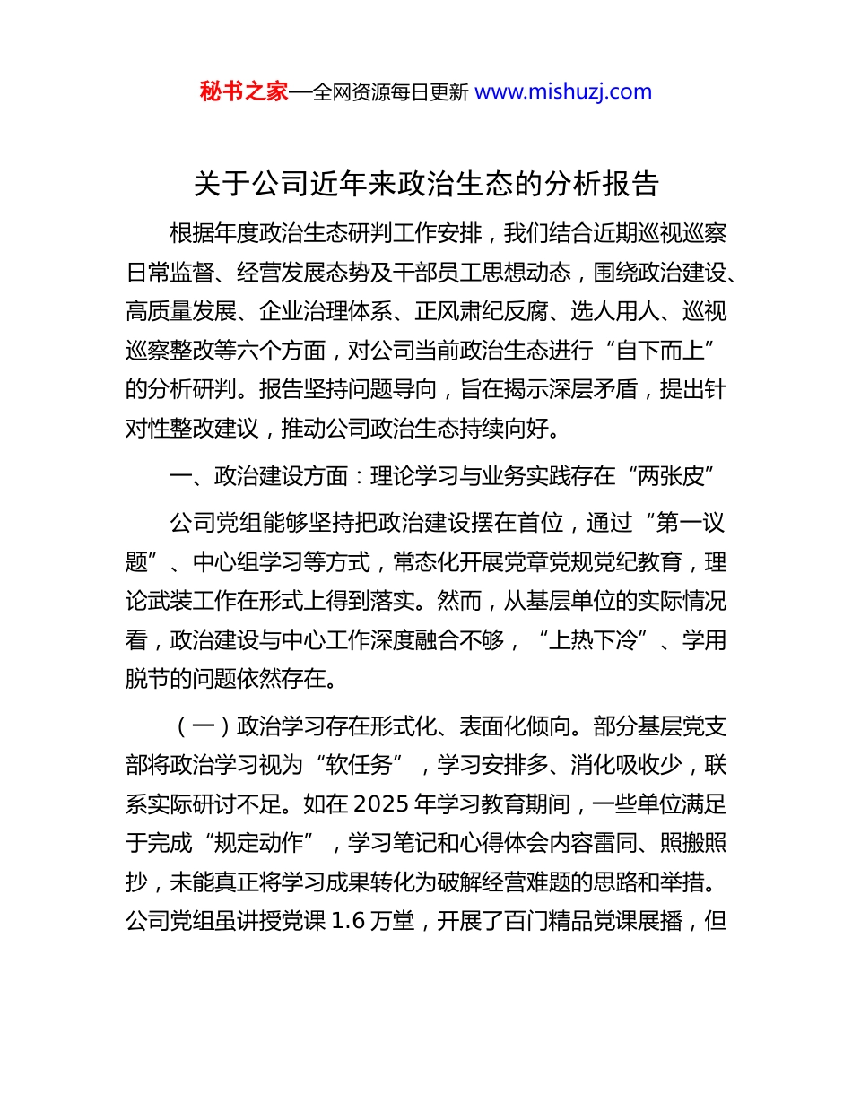 秘书之家—全网资源每日更新 www.mishuzj.com关于公司近年来政治生态的分析报告根据年度政治生态研判工作安排,我们结合近期巡视巡察日常监督、经营发展态势及干部员工思想动态,围绕政治建设、高质量发展、企业治理体系、正风肃纪反腐、选人用人、巡视巡察整改等六个方面,对公司当前政治生态进行“自下而上”的分析研判。报告坚持问题导向,旨在揭示深层矛盾,提出针对性整改建议,推动公司政治生态持续向好。一、政治建设方面:理论学习与业务实践存在“两张皮”公司党组能够坚持把政治建设摆在首位,通过“第一议题”、中心组学习等方式,常态化开展党章党规党纪教育,理论武装工作在形式上得到落实。然而,从基层单位的实际情况看,政治建设与中心工作深度融合不够,“上热下冷”、学用脱节的问题依然存在。(一)政治学习存在形式化、表面化倾向。部分基层党支部将政治学习视为“软任务”,学习安排多、消化吸收少,联系实际研讨不足。如在 2025 年学习教育期间,一些单位满足于完成“规定动作”,学习笔记和心得体会内容雷同、照搬照抄,未能真正将学习成果转化为破解经营难题的思路和举措。公司党组虽讲授党课 1.6 万堂,开展了百门精品党课展播,但秘书之家—全网资源每日更新 www.mishuzj.com基层党员反映,部分党课内容脱离一线实际,对解决智慧家庭业务推广难、客户服务满意度提升慢等具体问题指导性不强。(二)基层党组织政治功能发挥不充分。公司当前拥有庞大的组织体系,截至 2024 年底,仅*一地分公司总部便有直属党组织 22 家、党员近 500 名。但在部分经营压力大的基层单元,党建工作有被边缘化的风险。少数党支部书记由业务骨干兼任,存在重业务、轻党建的思想,难以投入足够精力抓好支部工作。“三会一课”制度执行质量不高,有的支部会议变成了业务工作布置会,批评和自我批评“辣味”不足,流于形式。在重大任务攻坚中,虽成立了党员突击队,但作用发挥参差不齐,少数突击队“只挂名、不出征”,未能有效凝聚攻坚克难的强大合力。(三)意识形态阵地管理存在薄弱环节。公司高度重视意识形态工作,加强了对门户网站、微信公众号等官方平台的管理。但在自媒体时代,对员工个人在网络空间的言论引导和管理相对滞后。2025 年以来,监测发现少数员工在外部社交平台发布对公司薪酬体系、考核政策的负面言论,甚至对公司数字化转型战略提出非建设性质疑,暴露出思想政治工作未能深入覆盖到每一位员工,价值引领未能完全跟上企业改革发展的步伐。秘书之家—全网资源每日更新 www.mishuzj.com二、高质量发展方面:“增收不增利”隐忧显现,转型压力巨大近年来,公司牢牢把握“云改数转”战略,经营业绩持续向好。2024 年,公司实现营业收入 5078.43 亿元,同比增长 6.9%;净利润达 304.46 亿元,同比增长 10.3%。然而,靓丽的数据背后,高质量发展的根基尚不稳固,结构性矛盾和潜在风险不容忽视。(一)新兴业务对盈利的贡献与高投入不匹配。以天翼云为代表的产业数字化业务是公司增长的核心引擎,2024 年收入达到 972 亿元,同比激增 67.9%。但此类业务前期投入巨大、市场竞争“白热化”,导致营业成本同步高速增长。2024 年公司营业成本增速达 11.9%,高于营收增速。在新兴业务领域,公司一定程度上陷入了为抢占市场份额而牺牲短期利润的窘境,部分政企项目存在“赔本赚吆喝”的情况,可持续性存疑。若不能尽快提升核心技术竞争力和项目交付效率,新兴业务“增收不增利”的风险将进一步放大。(二)传统业务下滑趋势难以遏制,网络资源效能有待提升。2024 年,公司固定电话用户数净减 393 万户,传统通信业务的萎缩态势明显。同时,公司在网络建设上投入巨大,2024 年资本开支达 988 亿元,在用 5G 基站超过 121 万站。但部分区域的 5G 网络利用率偏低,尤其是在*等偏远农村地秘书之家—全网资源每日更新 www.mishuzj.com区,网络覆盖与用户体验提升后,未能有效转化为匹配的业务收入增长,资产回报率承压。如何盘活庞大的存量网络资产,通过创新应用场景提升投资效率,是实现高质量发展的关键瓶颈。(三)科技创新“形”...