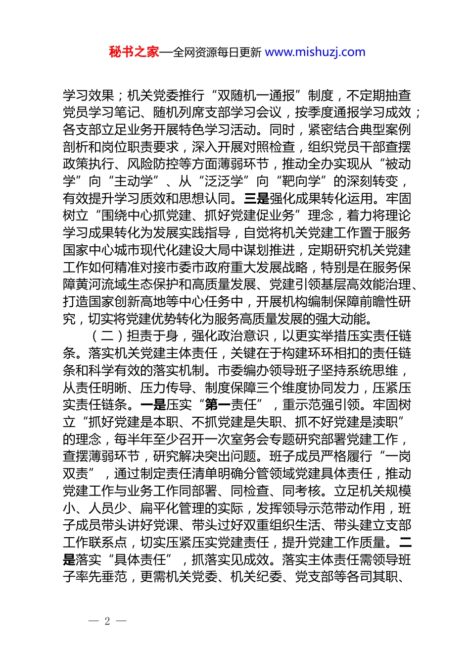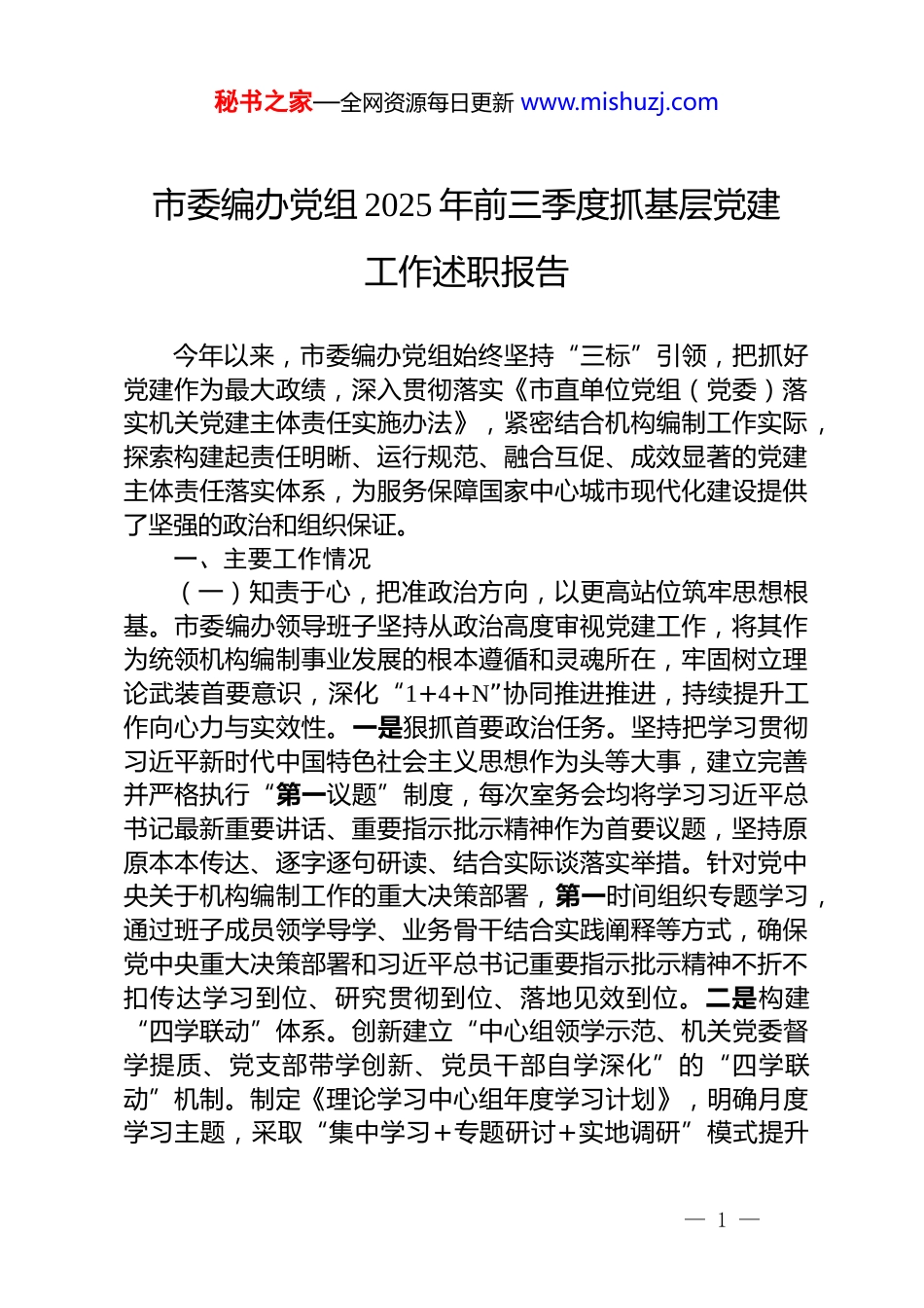 秘书之家—全网资源每日更新 www.mishuzj.com市委编办党组 2025 年前三季度抓基层党建工作述职报告今年以来,市委编办党组始终坚持“三标”引领,把抓好党建作为最大政绩,深入贯彻落实《市直单位党组(党委)落实机关党建主体责任实施办法》,紧密结合机构编制工作实际,探索构建起责任明晰、运行规范、融合互促、成效显著的党建主体责任落实体系,为服务保障国家中心城市现代化建设提供了坚强的政治和组织保证。一、主要工作情况(一)知责于心,把准政治方向,以更高站位筑牢思想根基。市委编办领导班子坚持从政治高度审视党建工作,将其作为统领机构编制事业发展的根本遵循和灵魂所在,牢固树立理论武装首要意识,深化“1+4+N”协同推进推进,持续提升工作向心力与实效性。一是狠抓首要政治任务。坚持把学习贯彻习近平新时代中国特色社会主义思想作为头等大事,建立完善并严格执行“第一议题”制度,每次室务会均将学习习近平总书记最新重要讲话、重要指示批示精神作为首要议题,坚持原原本本传达、逐字逐句研读、结合实际谈落实举措。针对党中央关于机构编制工作的重大决策部署,第一时间组织专题学习,通过班子成员领学导学、业务骨干结合实践阐释等方式,确保党中央重大决策部署和习近平总书记重要指示批示精神不折不扣传达学习到位、研究贯彻到位、落地见效到位。二是构建“四学联动”体系。创新建立“中心组领学示范、机关党委督学提质、党支部带学创新、党员干部自学深化”的“四学联动”机制。制定《理论学习中心组年度学习计划》,明确月度学习主题,采取“集中学习+专题研讨+实地调研”模式提升— 1 —秘书之家—全网资源每日更新 www.mishuzj.com学习效果;机关党委推行“双随机一通报”制度,不定期抽查党员学习笔记、随机列席支部学习会议,按季度通报学习成效;各支部立足业务开展特色学习活动。同时,紧密结合典型案例剖析和岗位职责要求,深入开展对照检查,组织党员干部查摆政策执行、风险防控等方面薄弱环节,推动全办实现从“被动学”向“主动学”、从“泛泛学”向“靶向学”的深刻转变,有效提升学习质效和思想认同。三是强化成果转化运用。牢固树立“围绕中心抓党建、抓好党建促业务”理念,着力将理论学习成果转化为发展实践指导,自觉将机关党建工作置于服务国家中心城市现代化建设大局中谋划推进,定期研究机关党建工作如何精准对接市委市政府重大发展战略,特别是在服务保障黄河流域生态保护和高质量发展、党建引领基层高效能治理、打造国家创新高地等中心任务中,开展机构编制保障前瞻性研究,切实将党建优势转化为服务高质量发展的强大动能。(二)担责于身,强化政治意识,以更实举措压实责任链条。落实机关党建主体责任,关键在于构建环环相扣的责任链条和科学有效的落实机制。市委编办领导班子坚持系统思维,从责任明晰、压力传导、制度保障三个维度协同发力,压紧压实责任链条。一是压实“第一责任”,重示范强引领。牢固树立“抓好党建是本职、不抓党建是失职、抓不好党建是渎职”的理念,每半年至少召开一次室务会专题研究部署党建工作,查摆薄弱环节,研究解决突出问题。班子成员严格履行“一岗双责”,通过制定责任清单明确分管领域党建具体责任,推动党建工作与业务工作同部署、同检查、同考核。立足机关规模小、人员少、扁平化管理的实际,发挥领导示范带动作用,班子成员带头讲好党课、带头过好双重组织生活、带头建立支部工作联系点,切实压紧压实党建责任,提升党建工作质量。二是落实“具体责任”,抓落实见成效。落实主体责任需领导班子率先垂范,更需机关党委、机关纪委、党支部等各司其职、— 2 —秘书之家—全网资源每日更新 www.mishuzj.com协同联动,构建上下贯通、齐抓共管的工作格局。精准界定机关党委的专门责任与机关纪委的监督责任,每年研究制定党建和党风廉政建设工作要点并严格组织实施,确保责任压实推动任务落地。压紧压实基层党组织责任,健全“月提醒、季调度、年述评”工作闭环,月初印发《党建重点工作提示单》明确任务,季度召开调度会逐项核查进展,年终开展“双向述职评议”,督促基层党组织时刻紧绷...
