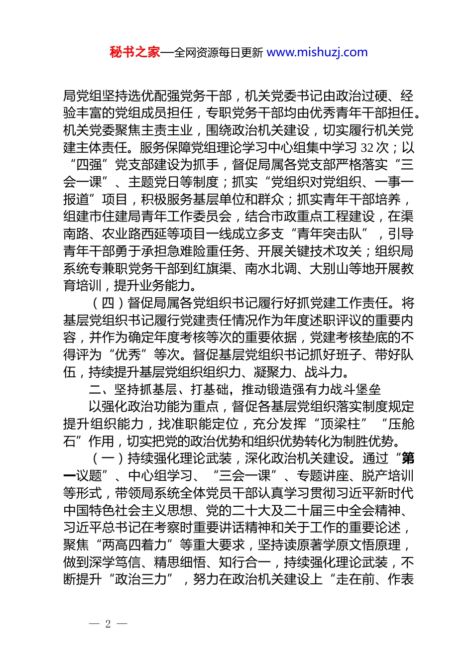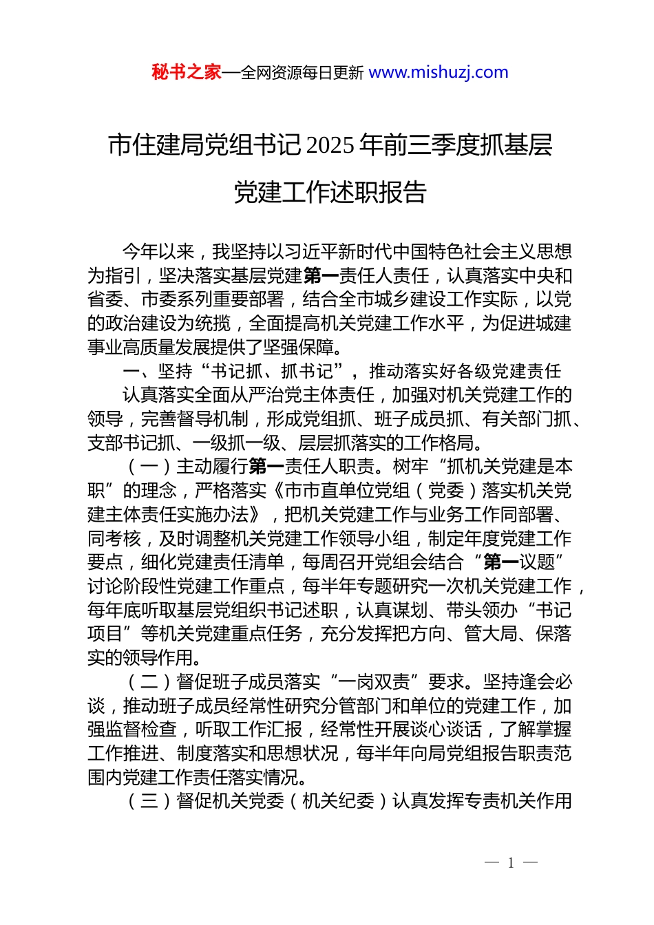 秘书之家—全网资源每日更新 www.mishuzj.com市住建局党组书记 2025 年前三季度抓基层党建工作述职报告今年以来,我坚持以习近平新时代中国特色社会主义思想为指引,坚决落实基层党建第一责任人责任,认真落实中央和省委、市委系列重要部署,结合全市城乡建设工作实际,以党的政治建设为统揽,全面提高机关党建工作水平,为促进城建事业高质量发展提供了坚强保障。一、坚持“书记抓、抓书记”,推动落实好各级党建责任认真落实全面从严治党主体责任,加强对机关党建工作的领导,完善督导机制,形成党组抓、班子成员抓、有关部门抓、支部书记抓、一级抓一级、层层抓落实的工作格局。(一)主动履行第一责任人职责。树牢“抓机关党建是本职”的理念,严格落实《市市直单位党组(党委)落实机关党建主体责任实施办法》,把机关党建工作与业务工作同部署、同考核,及时调整机关党建工作领导小组,制定年度党建工作要点,细化党建责任清单,每周召开党组会结合“第一议题”讨论阶段性党建工作重点,每半年专题研究一次机关党建工作,每年底听取基层党组织书记述职,认真谋划、带头领办“书记项目”等机关党建重点任务,充分发挥把方向、管大局、保落实的领导作用。(二)督促班子成员落实“一岗双责”要求。坚持逢会必谈,推动班子成员经常性研究分管部门和单位的党建工作,加强监督检查,听取工作汇报,经常性开展谈心谈话,了解掌握工作推进、制度落实和思想状况,每半年向局党组报告职责范围内党建工作责任落实情况。(三)督促机关党委(机关纪委)认真发挥专责机关作用— 1 —秘书之家—全网资源每日更新 www.mishuzj.com局党组坚持选优配强党务干部,机关党委书记由政治过硬、经验丰富的党组成员担任,专职党务干部均由优秀青年干部担任。机关党委聚焦主责主业,围绕政治机关建设,切实履行机关党建主体责任。服务保障党组理论学习中心组集中学习 32 次;以“四强”党支部建设为抓手,督促局属各党支部严格落实“三会一课”、主题党日等制度;抓实“党组织对党组织、一事一报道”项目,积极服务基层单位和群众;抓实青年干部培养,组建市住建局青年工作委员会,结合市政重点工程建设,在渠南路、农业路西延等项目一线成立多支“青年突击队”,引导青年干部勇于承担急难险重任务、开展关键技术攻关;组织局系统专兼职党务干部到红旗渠、南水北调、大别山等地开展教育培训,提升业务能力。(四)督促局属各党组织书记履行好抓党建工作责任。将基层党组织书记履行党建责任情况作为年度述职评议的重要内容,并作为确定年度考核等次的重要依据,党建考核垫底的不得评为“优秀”等次。督促基层党组织书记抓好班子、带好队伍,持续提升基层党组织组织力、凝聚力、战斗力。二、坚持抓基层、打基础,推动锻造强有力战斗堡垒以强化政治功能为重点,督促各基层党组织落实制度规定提升组织能力,找准职能定位,充分发挥“顶梁柱”“压舱石”作用,切实把党的政治优势和组织优势转化为制胜优势。(一)持续强化理论武装,深化政治机关建设。通过“第一议题”、中心组学习、“三会一课”、专题讲座、脱产培训等形式,带领局系统全体党员干部认真学习贯彻习近平新时代中国特色社会主义思想、党的二十大及二十届三中全会精神、习近平总书记在考察时重要讲话精神和关于工作的重要论述,聚焦“两高四着力”等重大要求,坚持读原著学原文悟原理,做到深学笃信、精思细悟、知行合一,持续强化理论武装,不断提升“政治三力”,努力在政治机关建设上“走在前、作表— 2 —秘书之家—全网资源每日更新 www.mishuzj.com率”,以实际行动拥护“两个确立”、做到“两个维护”。(二)严格落实组织生活制度,打造更多“四强”党支部抓实“三会一课”等各项制度,班子成员带头以普通党员身份参加所在支部活动,带头给分管处室和单位讲党课。到市政工程一线、廉政教育基地、庭审现场等,开展多样式、“沉浸式”主题党日活动,提升党建活动吸引力实效性。突出抓好“四强”党支部建设,充分发挥典型示范作用,带动各级基层党组织奋勇争先、担当作为,目前共创建“四强”党支部 10 个。坚持把牢党员...