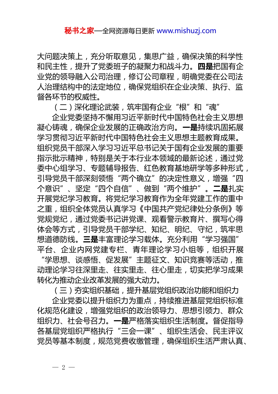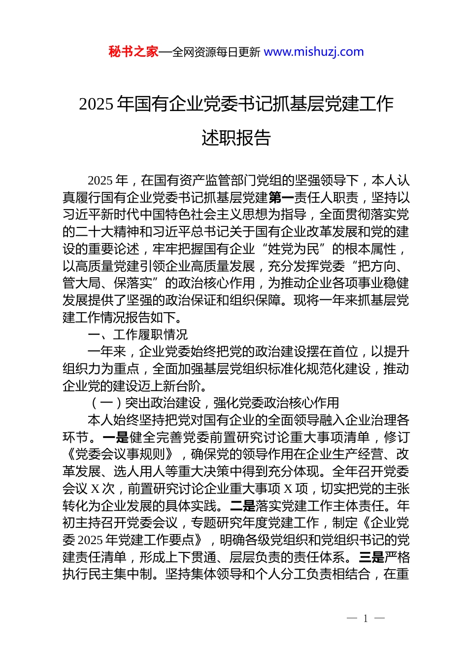 秘书之家—全网资源每日更新 www.mishuzj.com2025 年国有企业党委书记抓基层党建工作述职报告2025 年,在国有资产监管部门党组的坚强领导下,本人认真履行国有企业党委书记抓基层党建第一责任人职责,坚持以习近平新时代中国特色社会主义思想为指导,全面贯彻落实党的二十大精神和习近平总书记关于国有企业改革发展和党的建设的重要论述,牢牢把握国有企业“姓党为民”的根本属性,以高质量党建引领企业高质量发展,充分发挥党委“把方向、管大局、保落实”的政治核心作用,为推动企业各项事业稳健发展提供了坚强的政治保证和组织保障。现将一年来抓基层党建工作情况报告如下。一、工作履职情况一年来,企业党委始终把党的政治建设摆在首位,以提升组织力为重点,全面加强基层党组织标准化规范化建设,推动企业党的建设迈上新台阶。(一)突出政治建设,强化党委政治核心作用本人始终坚持把党对国有企业的全面领导融入企业治理各环节。一是健全完善党委前置研究讨论重大事项清单,修订《党委会议事规则》,确保党的领导作用在企业生产经营、改革发展、选人用人等重大决策中得到充分体现。全年召开党委会议 X 次,前置研究讨论企业重大事项 X 项,切实把党的主张转化为企业发展的具体实践。二是落实党建工作主体责任。年初主持召开党委会议,专题研究年度党建工作,制定《企业党委 2025 年党建工作要点》,明确各级党组织和党组织书记的党建责任清单,形成上下贯通、层层负责的责任体系。三是严格执行民主集中制。坚持集体领导和个人分工负责相结合,在重— 1 —秘书之家—全网资源每日更新 www.mishuzj.com大问题决策上,充分听取意见,集思广益,确保决策的科学性和民主性,提升了党委班子的凝聚力和战斗力。四是把国有企业党的领导融入公司治理,修订公司章程,明确党委在公司法人治理结构中的法定地位,确保党组织在企业决策、执行、监督各环节的权威性。(二)深化理论武装,筑牢国有企业“根”和“魂”企业党委坚持不懈用习近平新时代中国特色社会主义思想凝心铸魂,确保企业发展的正确政治方向。一是持续巩固拓展学习贯彻习近平新时代中国特色社会主义思想主题教育成果。组织党员干部深入学习习近平总书记关于国有企业发展的重要指示批示精神,特别是关于本行业本领域的最新论述,通过党委中心组学习、专题辅导报告、红色教育基地研学等多种形式,引导党员干部深刻领悟“两个确立”的决定性意义,增强“四个意识”、坚定“四个自信”、做到“两个维护”。二是扎实开展党纪学习教育。将党纪学习教育作为全年党建工作的重中之重,组织全体党员认真学习《中国共产党纪律处分条例》等党规党纪,通过党委书记讲党课、观看警示教育片、撰写心得体会等方式,引导党员干部学纪、知纪、明纪、守纪,筑牢思想道德防线。三是丰富理论学习载体。充分利用“学习强国”平台、企业内网党建专栏、青年理论学习小组等,组织开展“学思想、谈感悟、促发展”主题征文、知识竞赛等活动,推动理论学习往深里走、往实里走、往心里走,切实把学习成果转化为推动企业改革发展的强大动力。(三)夯实组织基础,提升基层党组织政治功能和组织力企业党委以提升组织力为重点,持续推进基层党组织标准化规范化建设,增强党组织的政治领导力、思想引领力、群众组织力、社会号召力。一是严格落实组织生活制度。督促指导各基层党组织严格执行“三会一课”、组织生活会、民主评议党员等基本制度,规范党费收缴管理,确保组织生活严肃认真、— 2 —秘书之家—全网资源每日更新 www.mishuzj.com富有成效。全年共开展主题党日活动 X 次,党委班子成员带头参加,发挥示范引领作用。二是加强党员队伍建设。严格发展党员程序,加大在青年骨干、生产一线发展党员力度,全年发展党员 X 名,转正党员 X 名,为党组织注入新鲜血液。同时,强化党员日常教育管理,开展“党员示范岗”“党员突击队”“我为企业献一策”等活动,引导党员立足岗位创先争优,让党旗在企业改革发展一线高高飘扬。三是配强建好党务干部队伍。定期组织党务干部培训,提升其政治理论水平和业务工作能力,确保党务工作有人抓、...
