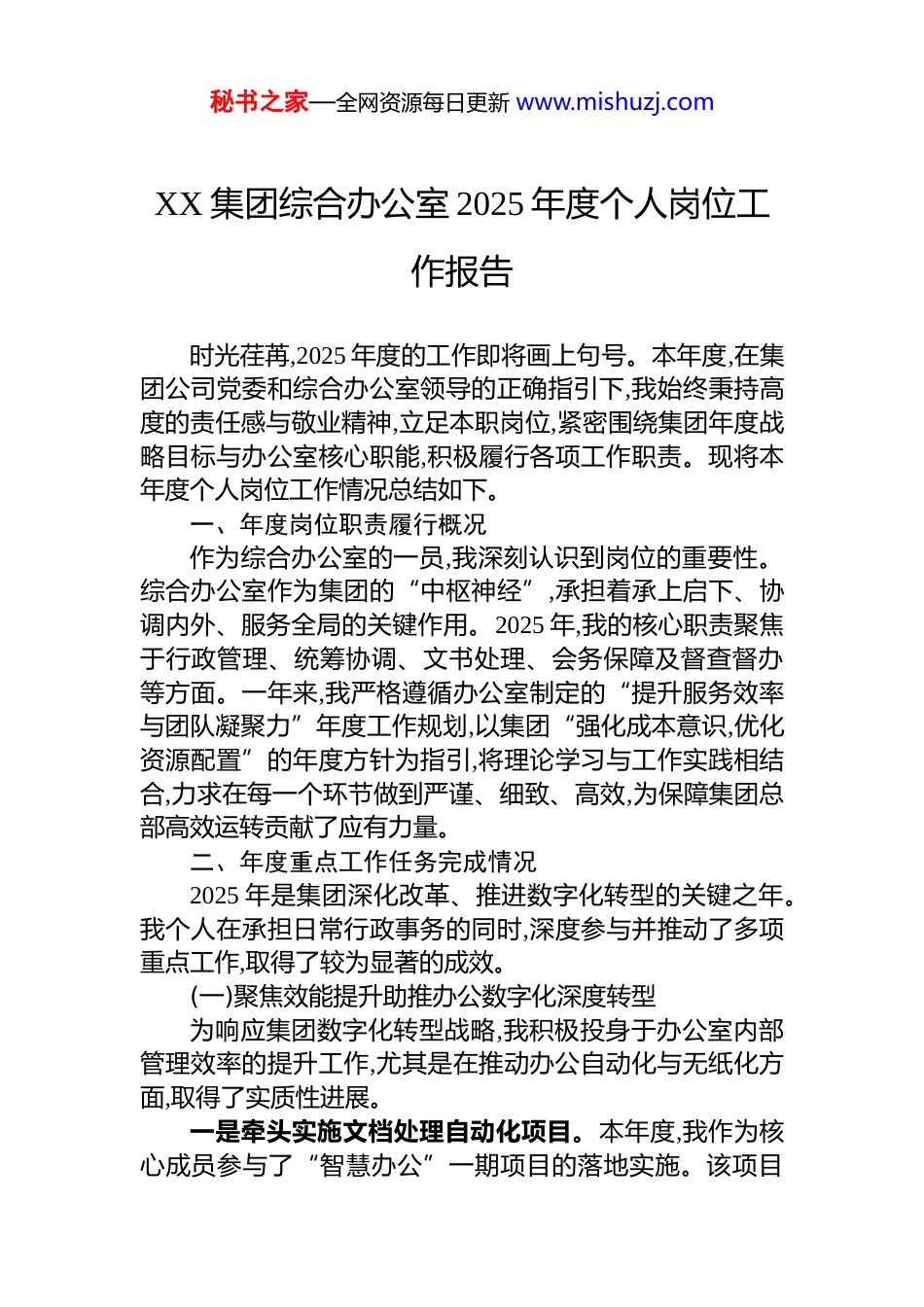 秘书之家—全网资源每日更新 www.mishuzj.comXX 集团综合办公室 2025 年度个人岗位工作报告时光荏苒,2025 年度的工作即将画上句号。本年度,在集团公司党委和综合办公室领导的正确指引下,我始终秉持高度的责任感与敬业精神,立足本职岗位,紧密围绕集团年度战略目标与办公室核心职能,积极履行各项工作职责。现将本年度个人岗位工作情况总结如下。一、年度岗位职责履行概况作为综合办公室的一员,我深刻认识到岗位的重要性。综合办公室作为集团的“中枢神经”,承担着承上启下、协调内外、服务全局的关键作用。2025 年,我的核心职责聚焦于行政管理、统筹协调、文书处理、会务保障及督查督办等方面。一年来,我严格遵循办公室制定的“提升服务效率与团队凝聚力”年度工作规划,以集团“强化成本意识,优化资源配置”的年度方针为指引,将理论学习与工作实践相结合,力求在每一个环节做到严谨、细致、高效,为保障集团总部高效运转贡献了应有力量。二、年度重点工作任务完成情况2025 年是集团深化改革、推进数字化转型的关键之年。我个人在承担日常行政事务的同时,深度参与并推动了多项重点工作,取得了较为显著的成效。(一)聚焦效能提升助推办公数字化深度转型为响应集团数字化转型战略,我积极投身于办公室内部管理效率的提升工作,尤其是在推动办公自动化与无纸化方面,取得了实质性进展。一是牵头实施文档处理自动化项目。本年度,我作为核心成员参与了“智慧办公”一期项目的落地实施。该项目秘书之家—全网资源每日更新 www.mishuzj.com旨在通过引入先进的文档管理系统与人工智能技术,优化公文流转与档案管理流程。项目实施后,成效显著。截至目前,集团内部非涉密文件的电子化流转率达到 95%以上,实现了从起草、审核、签发到归档的全流程线上闭环管理。根据初步测算,通过引入 AI 自动分类与索引技术,文件的平均处理周期由原先的 2.3 天缩短至 12.7 小时,整体文档处理效率提升约 40%。这一变革不仅大幅节省了时间成本,更将相关岗位的人员从繁琐的重复性劳动中解放出来,转向更具价值的分析与监督工作。二是深化无纸化办公实践。在集团范围内,我负责推广并监督无纸化办公措施的执行。通过优化内部协同平台功能、倡导使用电子签名及云存储,显著减少了纸张消耗与打印成本。据行政成本核算,2025 年集团总部的纸张采购量同比下降约 60%,打印设备相关的维护与耗材费用减少了近 30万元。这不仅符合集团降本增效的要求,也体现了绿色发展的企业社会责任。(二)精准服务保障确保集团中枢高效运转作为综合办公室的核心职能,提供精准、高效的服务保障是工作的重中之重。本年度,我在文书处理、会务组织、行政接待等方面,始终坚持最高标准。一是高效精准的文书流转与信息报送。2025 年,我累计经手处理各类收文、发文 3,200 余件,起草、核校集团各类报告、纪要、函件等综合性文稿超过 150 篇。在工作中,我严格执行公文处理规范,确保每一份文件的时效性、准确性与严肃性,全年未发生任何因个人疏忽导致的流转延误或信息错漏。同时,在信息报送方面,我密切关注行业动态与政策走向,全年编写《XX 信息参考》24 期,为集团领导决策提供了有价值的信息支撑。二是周密细致的会务组织与协调。会议是集团决策和部署工作的重要载体。本年度,我全程参与组织和协调了包括集团年度工作会议、季度经营分析会、战略研讨专题会秘书之家—全网资源每日更新 www.mishuzj.com党委中心组学习会在内的各层级会议共计 48 场次。在会务工作中,我从会议方案的策划、材料的准备、场地的布置,到过程中的服务与记录,均力求做到万无一失。特别是在 XX项目启动会、与 XX 战略合作伙伴高层峰会等几次重大会议中,通过建立标准化的会务工作流程,有效提升了会议质量。根据会后匿名满意度调查问卷统计,与会人员对会议组织的综合满意度评分平均达到 94.8%,有效保障了集团各项重大决策的顺利传达与落实。三是规范有序的行政接待与后勤支持。全年共计负责或参与了 65 次重要商务接待及上级单位视察调研活动。在接待工作中,我注重细节,精心安排,展现了集团良好的专业形象与精神风貌。在日常后勤支持方面,通过优化办公用品...