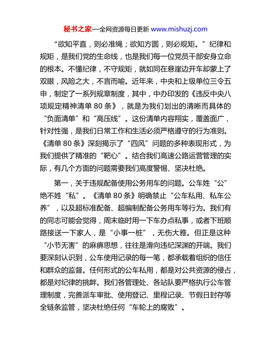 秘书之家—全网资源每日更新 www.mishuzj.com国企党课:严守纪律规矩,筑牢廉洁防线同志们:根据区域总部党委的统一部署,今天我来到这里,与大家共同开展一次政治纪律专题的学习交流。这次党课的主题是“严守纪律规矩,筑牢廉洁防线”。目的非常明确,就是要通过重温纪律、剖析案例、明确要求,引导大家进一步增强纪律意识、规矩意识和廉洁意识,持续巩固我们深入贯彻中央八项规定精神的成果,为区域总部的健康稳定和高质量发展,营造一个风清气正、廉洁高效的政治生态和干事创业环境。作风建设永远在路上,反腐倡廉建设也永远在路上。党的十八大以来,以习近平同志为核心的党中央以前所未有的决心和力度推进全面从严治党,开启了激浊扬清的作风之变。作为国有企业的党员干部,我们身处经营管理一线,直接面对市场、服务社会,手中掌握着一定的资源和权力,更要时刻保持清醒的头脑,深刻认识到我们的一言一行,不仅关乎个人前途,更关乎企业形象和党的声誉。下面,我将围绕“明纪律、守规矩、防风险”这条主线,结合我们的工作实际,从四个方面与同志们进行深入探讨。一、深学细悟,精准把握纪律的“高压线”秘书之家—全网资源每日更新 www.mishuzj.com“欲知平直,则必准绳;欲知方圆,则必规矩。”纪律和规矩,是我们党的生命线,也是我们每一位党员干部安身立命的根本。不懂纪律,不守规矩,就如同在悬崖边开车却蒙上了双眼,风险之大,不言而喻。近年来,中央和上级单位三令五申,制定了一系列规章制度,其中,中办印发的《违反中央八项规定精神清单 80 条》,就是为我们划出的清晰而具体的“负面清单”和“高压线”。这份清单内容翔实,覆盖面广,针对性强,是我们日常工作和生活必须严格遵守的行为准则。《清单 80 条》深刻揭示了“四风”问题的多种表现形式,为我们提供了精准的“靶心”。结合我们高速公路运营管理的实际,有几个方面的问题需要我们高度警惕、坚决杜绝。第一,关于违规配备使用公务用车的问题。公车姓“公”绝不姓“私”。《清单 80 条》明确禁止“公车私用、私车公养”,以及超标准配备、超编制配备公务用车等行为。我们有的同志可能会觉得,周末临时用一下车办点私事,或者下班顺路接送一下家人,是“小事一桩”,无伤大雅。但正是这种“小节无害”的麻痹思想,往往是滑向违纪深渊的开端。我们要深刻认识到,公车使用记录的每一笔,都承载着组织的信任和群众的监督。任何形式的公车私用,都是对公共资源的侵占,都是对纪律的挑衅。我们各管理处、各站队要严格执行公车管理制度,完善派车审批、使用登记、里程记录、节假日封存等全链条监管,坚决杜绝任何“车轮上的腐败”。秘书之家—全网资源每日更新 www.mishuzj.com第二,关于违规收送名贵特产和礼品礼金的问题。这是人情往来中最容易触碰的“红线”。随着科技发展,违规收送礼品礼金的方式也变得更加隐蔽,从过去的烟酒茶,演变为现在的电子预付卡、微信红包、快递送礼等。有的人认为,不收现金,收点土特产不算什么;或者认为,同事之间、上下级之间逢年过节发个红包是“增进感情”。这些想法都是极其错误的。《清单 80 条》明确指出,无论是收受可能影响公正执行公务的礼品礼金,还是以任何名义收受管理服务对象的财物,都属于违纪行为。我们从事高速公路管理工作,会与各类承包商、供应商、服务区经营方等打交道。在这些交往中,必须保持清醒,划清公与私的界限,坚决抵制任何形式的“糖衣炮弹”。要记住,今天你收下的一瓶酒、一条烟,明天可能就要用手中的权力去偿还。这种交易,最终只会让我们付出沉重的代价。第三,关于违规发放津补贴或福利的问题。津补贴和福利的发放,必须严格依据国家和上级单位的政策规定。然而在实际工作中,一些单位巧立名目,通过虚列开支、虚报冒领等方式,变相为职工谋取“福利”。比如,以“加班补助”之名行“普惠奖励”之实,或者以“春秋游”的名义组织公款旅游。这些行为看似是为职工着想,实际上是严重违反财经纪律的“小金库”行为,扰乱了收入分配秩序,也败坏了风气。《清单 80 条》对此有明确禁令。我们各级负责人必须增强法治意识和规矩...