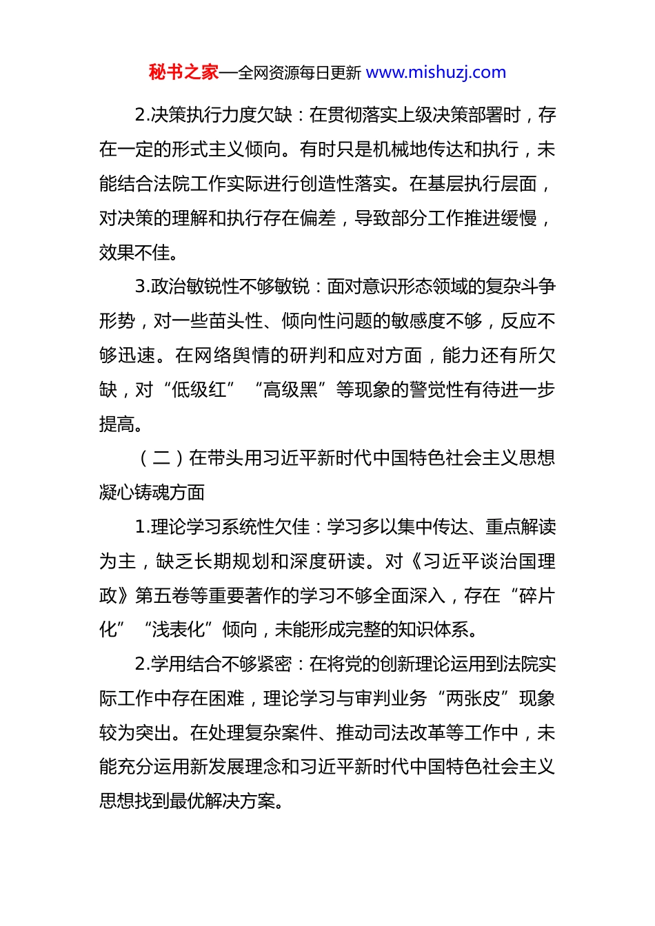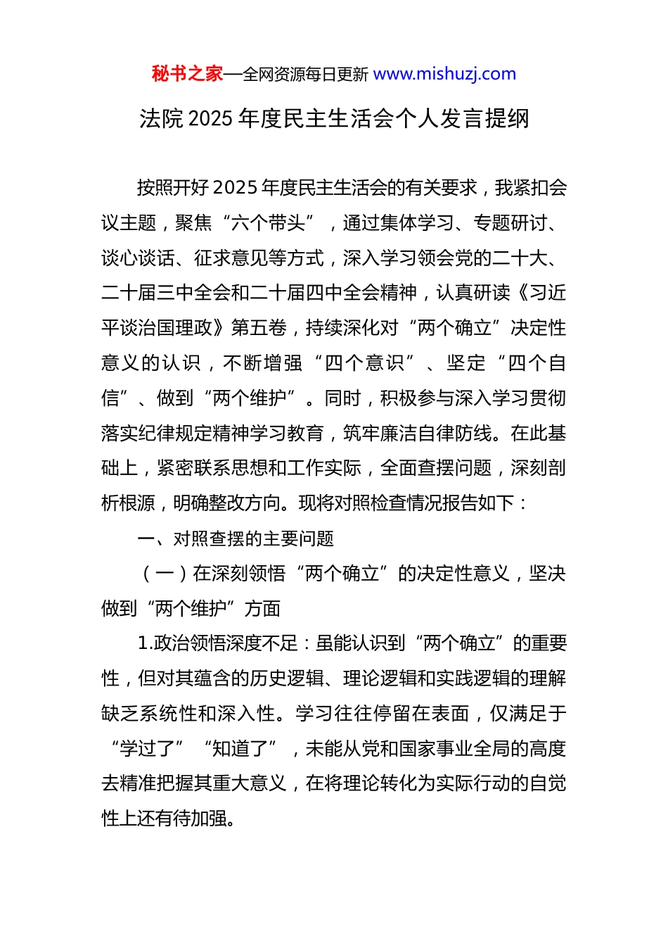 秘书之家—全网资源每日更新 www.mishuzj.com法院 2025 年度民主生活会个人发言提纲 按照开好 2025 年度民主生活会的有关要求,我紧扣会议主题,聚焦“六个带头”,通过集体学习、专题研讨、谈心谈话、征求意见等方式,深入学习领会党的二十大、二十届三中全会和二十届四中全会精神,认真研读《习近平谈治国理政》第五卷,持续深化对“两个确立”决定性意义的认识,不断增强“四个意识”、坚定“四个自信”、做到“两个维护”。同时,积极参与深入学习贯彻落实纪律规定精神学习教育,筑牢廉洁自律防线。在此基础上,紧密联系思想和工作实际,全面查摆问题,深刻剖析根源,明确整改方向。现将对照检查情况报告如下:一、对照查摆的主要问题(一)在深刻领悟“两个确立”的决定性意义,坚决做到“两个维护”方面1.政治领悟深度不足:虽能认识到“两个确立”的重要性,但对其蕴含的历史逻辑、理论逻辑和实践逻辑的理解缺乏系统性和深入性。学习往往停留在表面,仅满足于“学过了”“知道了”,未能从党和国家事业全局的高度去精准把握其重大意义,在将理论转化为实际行动的自觉性上还有待加强。秘书之家—全网资源每日更新 www.mishuzj.com2.决策执行力度欠缺:在贯彻落实上级决策部署时,存在一定的形式主义倾向。有时只是机械地传达和执行,未能结合法院工作实际进行创造性落实。在基层执行层面,对决策的理解和执行存在偏差,导致部分工作推进缓慢,效果不佳。3.政治敏锐性不够敏锐:面对意识形态领域的复杂斗争形势,对一些苗头性、倾向性问题的敏感度不够,反应不够迅速。在网络舆情的研判和应对方面,能力还有所欠缺,对“低级红”“高级黑”等现象的警觉性有待进一步提高。(二)在带头用习近平新时代中国特色社会主义思想凝心铸魂方面1.理论学习系统性欠佳:学习多以集中传达、重点解读为主,缺乏长期规划和深度研读。对《习近平谈治国理政》第五卷等重要著作的学习不够全面深入,存在“碎片化”“浅表化”倾向,未能形成完整的知识体系。2.学用结合不够紧密:在将党的创新理论运用到法院实际工作中存在困难,理论学习与审判业务“两张皮”现象较为突出。在处理复杂案件、推动司法改革等工作中,未能充分运用新发展理念和习近平新时代中国特色社会主义思想找到最优解决方案。秘书之家—全网资源每日更新 www.mishuzj.com3.思想引领作用发挥不充分:对法院干警的思想动态掌握不够及时,思想政治工作方式方法较为传统,缺乏针对性和实效性。部分干警存在“重业务轻思想”的倾向,理想信念根基不够牢固,需要进一步加强思想引领。(三)在带头坚持和加强党的全面领导方面1.议事决策机制执行不严:在重大案件讨论、重要事项决策等过程中,有时存在调研论证不充分、听取基层意见不够广泛的问题,存在“拍脑袋”决策的风险。民主集中制落实不够到位,“一把手”末位发言制度执行不够严格,班子成员发表意见的主动性有待提高。2.党建与业务融合不深:存在“重业务、轻党建”的思想,党建工作与审判业务结合不够紧密,存在“两张皮”现象。党建工作责任制落实层层递减,部分基层党组织战斗堡垒作用发挥不明显,党员先锋模范作用不够突出。3.统筹协调能力有待提升:在面对跨部门、跨领域的复杂案件和工作任务时,牵头抓总、协调推进的力度不够,存在“各扫门前雪”现象,整体合力尚未完全形成。在处理与其他政法部门的协作配合时,沟通协调不够顺畅,影响了工作效率。(四)在带头坚持以人民为中心的发展思想,推动改革发展稳定方面秘书之家—全网资源每日更新 www.mishuzj.com1.调查研究不够深入:下基层调研存在“走马观花”“被安排”现象,真正蹲点解剖麻雀、倾听群众心声的时间少,掌握第一手资料不全面。在制定司法政策和工作措施时,未能充分考虑群众的实际需求和利益,导致部分政策脱离实际。2.服务群众能力有待提高:面对群众多元化、个性化的司法需求,服务供给方式单一,信息化手段应用不充分。立案、审判、执行等环节的办事流程仍显烦琐,“最后一公里”梗阻问题依然存在,群众诉讼体验不佳。3.推动改革攻坚的韧劲不足:在司法体制改革过程中,面对一些体制机制障...