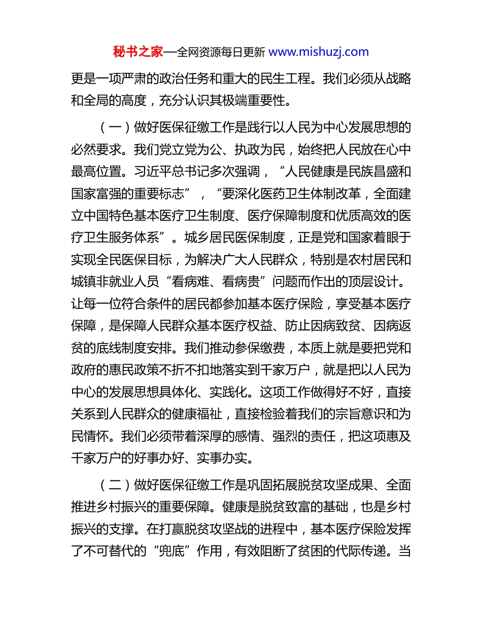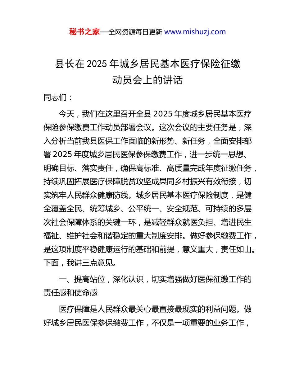 秘书之家—全网资源每日更新 www.mishuzj.com县长在 2025 年城乡居民基本医疗保险征缴动员会上的讲话同志们:今天,我们在这里召开全县 2025 年度城乡居民基本医疗保险参保缴费工作动员部署会议。这次会议的主要任务是,深入分析当前我县医保工作面临的新形势、新任务,全面安排部署 2025 年度城乡居民医保参保缴费工作,进一步统一思想、明确目标、落实责任,确保高标准、高质量完成年度征缴任务,持续巩固拓展医疗保障脱贫攻坚成果同乡村振兴有效衔接,切实筑牢人民群众健康防线。城乡居民基本医疗保险制度,是健全覆盖全民、统筹城乡、公平统一、安全规范、可持续的多层次社会保障体系的关键一环,是减轻群众就医负担、增进民生福祉、维护社会和谐稳定的重大制度安排。做好参保缴费工作,是这项制度平稳健康运行的基础和前提,意义重大,责任如山。下面,我讲三点意见。一、提高站位,深化认识,切实增强做好医保征缴工作的责任感和使命感医疗保障是人民群众最关心最直接最现实的利益问题。做好城乡居民医保参保缴费工作,不仅是一项重要的业务工作,秘书之家—全网资源每日更新 www.mishuzj.com更是一项严肃的政治任务和重大的民生工程。我们必须从战略和全局的高度,充分认识其极端重要性。(一)做好医保征缴工作是践行以人民为中心发展思想的必然要求。我们党立党为公、执政为民,始终把人民放在心中最高位置。习近平总书记多次强调,“人民健康是民族昌盛和国家富强的重要标志”,“要深化医药卫生体制改革,全面建立中国特色基本医疗卫生制度、医疗保障制度和优质高效的医疗卫生服务体系”。城乡居民医保制度,正是党和国家着眼于实现全民医保目标,为解决广大人民群众,特别是农村居民和城镇非就业人员“看病难、看病贵”问题而作出的顶层设计。让每一位符合条件的居民都参加基本医疗保险,享受基本医疗保障,是保障人民群众基本医疗权益、防止因病致贫、因病返贫的底线制度安排。我们推动参保缴费,本质上就是要把党和政府的惠民政策不折不扣地落实到千家万户,就是把以人民为中心的发展思想具体化、实践化。这项工作做得好不好,直接关系到人民群众的健康福祉,直接检验着我们的宗旨意识和为民情怀。我们必须带着深厚的感情、强烈的责任,把这项惠及千家万户的好事办好、实事办实。(二)做好医保征缴工作是巩固拓展脱贫攻坚成果、全面推进乡村振兴的重要保障。健康是脱贫致富的基础,也是乡村振兴的支撑。在打赢脱贫攻坚战的进程中,基本医疗保险发挥了不可替代的“兜底”作用,有效阻断了贫困的代际传递。当秘书之家—全网资源每日更新 www.mishuzj.com前,我们正处在巩固拓展脱贫攻坚成果同乡村振兴有效衔接的关键时期,面临的防止返贫任务依然艰巨。疾病,尤其是重大疾病,仍然是导致家庭陷入困境的主要风险之一。城乡居民基本医疗保险,连同大病保险、医疗救助等制度,共同构筑起了防范因病返贫致贫的坚固屏障。确保农村低收入人口和脱贫人口动态纳入医保覆盖范围,实现应保尽保,是守住不发生规模性返贫底线的硬性要求,也是推进乡村全面振兴、实现共同富裕的内在需要。各乡镇、各相关部门必须清醒认识到,医保参保缴费工作不是一项可有可无、可紧可松的常规工作,而是必须完成、必须完成的硬任务,是乡村振兴战略在医疗保障领域的具体体现,必须抓紧抓实抓出成效。(三)做好医保征缴工作是提升社会治理效能、维护社会和谐稳定的现实需要。基本医疗保险通过“大数法则”实现社会互助共济,可以有效化解疾病风险带来的经济冲击,促进社会公平正义。较高的参保率,是医保基金可持续运行的基础。基金池子越大,抗风险能力就越强,保障水平就越稳定,制度运行就越安全。反之,如果参保率下降,不仅会影响个别未参保居民的健康保障,更会动摇医保制度的根基,影响基金的共济能力和可持续性,最终损害的是所有参保人的共同利益。同时,完善的医疗保障体系能够缓解群众的后顾之忧,释放消费潜力,为经济发展创造良好条件;能够有效减少因疾病带来的社会矛盾和纠纷,促进社会和谐安定。因此,抓好医保征缴,秘书之家—全网资源每日更新 www.mishuzj.com提高参...