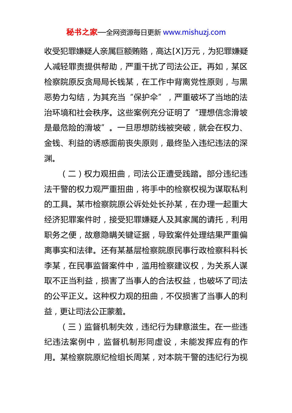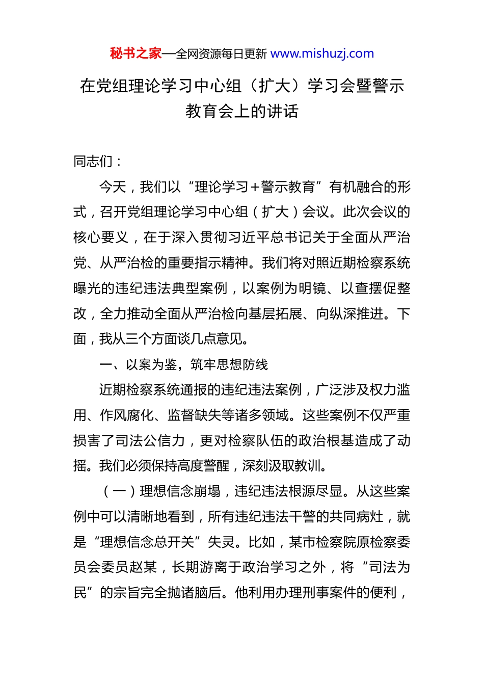 秘书之家—全网资源每日更新 www.mishuzj.com在党组理论学习中心组(扩大)学习会暨警示教育会上的讲话 同志们:今天,我们以“理论学习+警示教育”有机融合的形式,召开党组理论学习中心组(扩大)会议。此次会议的核心要义,在于深入贯彻习近平总书记关于全面从严治党、从严治检的重要指示精神。我们将对照近期检察系统曝光的违纪违法典型案例,以案例为明镜、以查摆促整改,全力推动全面从严治检向基层拓展、向纵深推进。下面,我从三个方面谈几点意见。一、以案为鉴,筑牢思想防线近期检察系统通报的违纪违法案例,广泛涉及权力滥用、作风腐化、监督缺失等诸多领域。这些案例不仅严重损害了司法公信力,更对检察队伍的政治根基造成了动摇。我们必须保持高度警醒,深刻汲取教训。(一)理想信念崩塌,违纪违法根源尽显。从这些案例中可以清晰地看到,所有违纪违法干警的共同病灶,就是“理想信念总开关”失灵。比如,某市检察院原检察委员会委员赵某,长期游离于政治学习之外,将“司法为民”的宗旨完全抛诸脑后。他利用办理刑事案件的便利,秘书之家—全网资源每日更新 www.mishuzj.com收受犯罪嫌疑人亲属巨额贿赂,高达[X]万元,为犯罪嫌疑人减轻罪责提供帮助,严重干扰了司法公正。再如,某区检察院原反贪局局长钱某,在工作中背离党性原则,与黑恶势力勾结,为其充当“保护伞”,严重破坏了当地的法治环境和社会秩序。这些案例充分证明了“理想信念滑坡是最危险的滑坡”。一旦思想防线被突破,就会在权力、金钱、利益的诱惑面前丧失原则,最终坠入违纪违法的深渊。(二)权力观扭曲,司法公正遭受践踏。部分违纪违法干警的权力观严重扭曲,将手中的检察权视为谋取私利的工具。某市检察院原公诉处处长孙某,在办理一起重大经济犯罪案件时,接受犯罪嫌疑人及其家属的请托,利用职务之便,故意隐瞒关键证据,导致案件处理结果严重偏离事实和法律。还有某基层检察院原民事行政检察科科长李某,在民事监督案件中,滥用检察建议权,为关系人谋取不正当利益,损害了当事人的合法权益,也破坏了司法的公平正义。这种权力观的扭曲,不仅损害了当事人的利益,更让司法公正蒙羞。(三)监督机制失效,违纪行为肆意滋生。在一些违纪违法案例中,监督机制形同虚设,未能发挥应有的作用。某检察院原纪检组长周某,对本院干警的违纪行为视秘书之家—全网资源每日更新 www.mishuzj.com而不见,甚至为违纪人员通风报信,阻碍调查工作的开展。由于内部监督的缺失,使得一些干警的违纪行为得不到及时制止和纠正,从而愈演愈烈。这也反映出我们在监督机制建设方面存在漏洞,必须加以完善。针对以上问题,我们要把政治建设作为首要任务:一是强化“第一议题”制度,将习近平总书记关于政法工作、检察工作的重要论述细化为“学习-研讨-落实-督查”的完整闭环。每季度组织一次“政治理论测试”,检验学习成果,确保理论武装真正入脑入心。二是构建“三查三看”政治体检机制,查办案卷宗看政治效果是否实现,查信访记录看为民情怀是否深厚,查决策流程看政治担当是否彰显。通过这种方式,倒逼干警将“两个维护”切实落实到每一项具体工作中。三是开展“红色检察教育”活动,组织干警到本地的革命纪念馆、廉政教育基地进行现场教学。让干警们在红色文化的熏陶下,滋养初心,筑牢拒腐防变的思想堤坝。二、剖析根源,找准问题关键(一)教育管理缺失,思想根基不牢。在部分检察机关中,对干警的思想政治教育和业务培训不够系统和深入。政治学习往往流于形式,缺乏针对性和实效性。一些干警对党的理论和路线方针政策理解不深,导致理想信念秘书之家—全网资源每日更新 www.mishuzj.com动摇。业务培训也存在重实践、轻理论的现象,使得干警的法律素养和职业道德水平难以得到有效提升。同时,对干警的日常管理不够严格,对一些不良行为和倾向未能及时发现和纠正,从而为违纪违法问题的发生埋下了隐患。(二)制度执行不力,监督约束虚化。虽然我们建立了一系列的规章制度,但在实际执行过程中,存在打折扣、搞变通的现象。一些单位对制度的宣传和解读不够到位,导致干警对制度的内容和要求理解不清晰...
