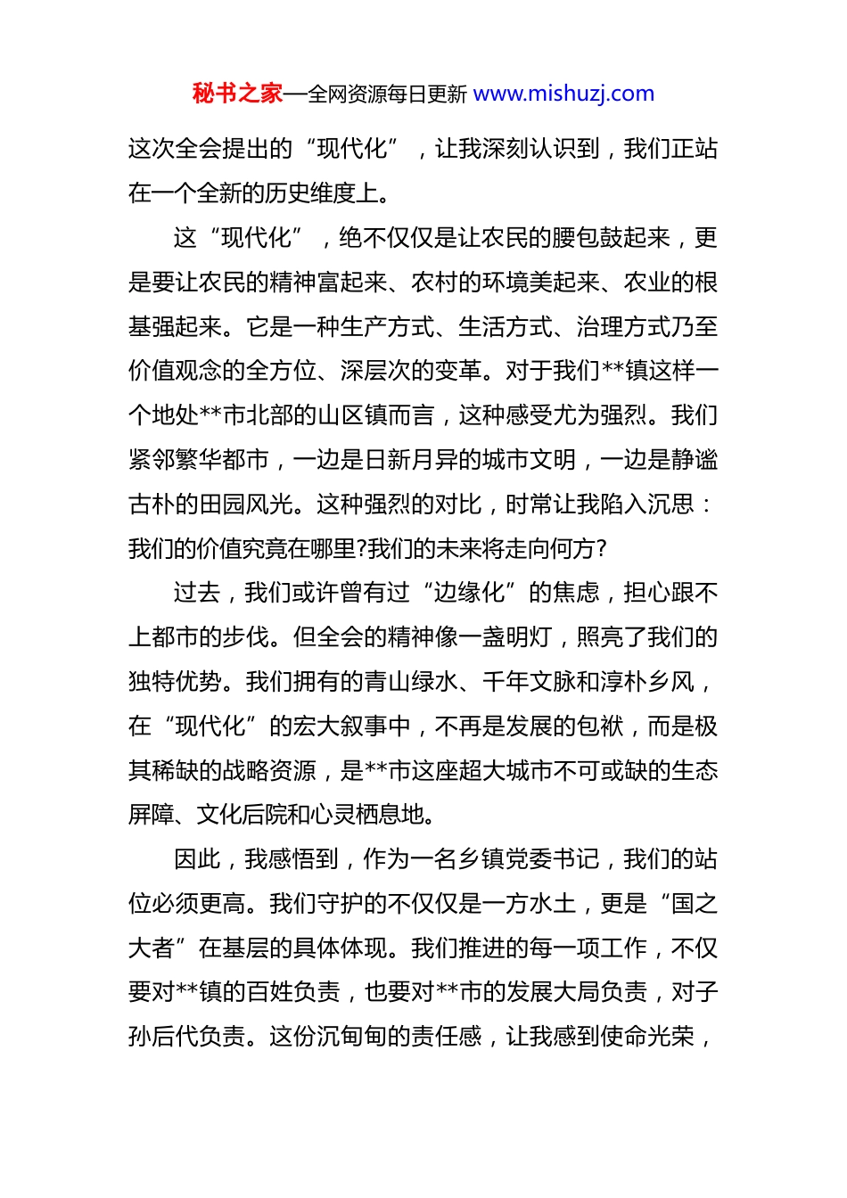 秘书之家—全网资源每日更新 www.mishuzj.com在区委理论学习中心组(扩大)会议上关于学习全会精神的研讨发言 尊敬的各位领导,同志们:大家好!非常荣幸能有这样一个机会,与各位领导和同志们一起,交流学习党的二十届四中全会精神的心得体会。刚才聆听了大家的发言,很受启发、深受教育。全会擘画的宏伟蓝图,特别是其中关于“加快农业农村现代化,扎实推进乡村全面振兴”的深刻论述,对于我们这些身处基层、心系乡土的干部来说,不啻为一声思想的惊雷,更是一道行动的号令。站在这里,我不想过多汇报**镇已经做了什么,取得了哪些成绩。我想借此宝贵机会,以一名基层党委书记的身份,更以一个从农村走出来的普通党员干部的身份,和大家谈谈我的几点感悟、反思与期盼。这既是向组织汇报思想,也是一次自我剖析和鞭策。一、感悟“国之大者”,从“现代化”新高度,重新审视乡村的价值与使命学习全会精神,我反复思考一个问题:新时代的“乡村振兴”,究竟“新”在哪里?我们追求的“农业农村现代化”,又到底意味着什么?过去,我们谈乡村发展,可能更多聚焦于“脱贫”“增收”,是用经济指标来衡量的。而秘书之家—全网资源每日更新 www.mishuzj.com这次全会提出的“现代化”,让我深刻认识到,我们正站在一个全新的历史维度上。这“现代化”,绝不仅仅是让农民的腰包鼓起来,更是要让农民的精神富起来、农村的环境美起来、农业的根基强起来。它是一种生产方式、生活方式、治理方式乃至价值观念的全方位、深层次的变革。对于我们**镇这样一个地处**市北部的山区镇而言,这种感受尤为强烈。我们紧邻繁华都市,一边是日新月异的城市文明,一边是静谧古朴的田园风光。这种强烈的对比,时常让我陷入沉思:我们的价值究竟在哪里?我们的未来将走向何方?过去,我们或许曾有过“边缘化”的焦虑,担心跟不上都市的步伐。但全会的精神像一盏明灯,照亮了我们的独特优势。我们拥有的青山绿水、千年文脉和淳朴乡风,在“现代化”的宏大叙事中,不再是发展的包袱,而是极其稀缺的战略资源,是**市这座超大城市不可或缺的生态屏障、文化后院和心灵栖息地。因此,我感悟到,作为一名乡镇党委书记,我们的站位必须更高。我们守护的不仅仅是一方水土,更是“国之大者”在基层的具体体现。我们推进的每一项工作,不仅要对**镇的百姓负责,也要对**市的发展大局负责,对子孙后代负责。这份沉甸甸的责任感,让我感到使命光荣,秘书之家—全网资源每日更新 www.mishuzj.com也让我感到如履薄冰,必须以“时时放心不下”的自觉,去思考和谋划**镇的未来。我们不能再简单地模仿城市的模式,而是要探索一条人与自然和谐共生、传统与现代交相辉映的乡村特色现代化之路。二、思考“镇之要务”,在“引领区”新机遇中,精心谋划融合发展的路径全会精神是“纲”,具体工作是“目”。如何纲举目张,把宏伟蓝图落实为**镇的“施工图”?我思考的答案是:必须牢牢抓住环**山—**山县镇村高质量发展引领区建设这个千载难逢的历史机遇,做好“融合”这篇大文章。这些天,我的脑海里时常浮现出一幅画卷:未来的**镇,不再是各个产业、各个村落单打独斗,而是一个有机联动的生命体。首先,是“形”与“神”的融合,让古镇焕发新生。**镇有幸承载着千年的历史,这份厚重是我们最宝贵的财富。但财富如果尘封,就无法转化为发展的动能。我们规划推进的**老街提升改造,在我看来,绝非简单的“修旧如旧”。它更像是一场“文化唤醒”工程。我们要做的,不仅是修复一砖一瓦,更是要找回老街的“魂”。我想象着,未来的老街,石板路上回荡的不仅有游客的脚步声,秘书之家—全网资源每日更新 www.mishuzj.com还有老手艺人的吆喝声、孩子们在古榕下的嬉笑声、文化讲堂里的读书声。它是一个活着的、有温度的社区,是历史与现代生活方式的完美融合,让人们“看得见山,望得见水,记得住乡愁”。其次,是“山”与“水”的融合,让生态彰显价值。生态优先、绿色发展,这是我们必须坚守的底线,也是我们最大的发展优势。**公路改线、碧道联通工程等项目,表面看是交通基础设施建设,但我更愿意将它们视为“生态织补”工程。我们畅通交...