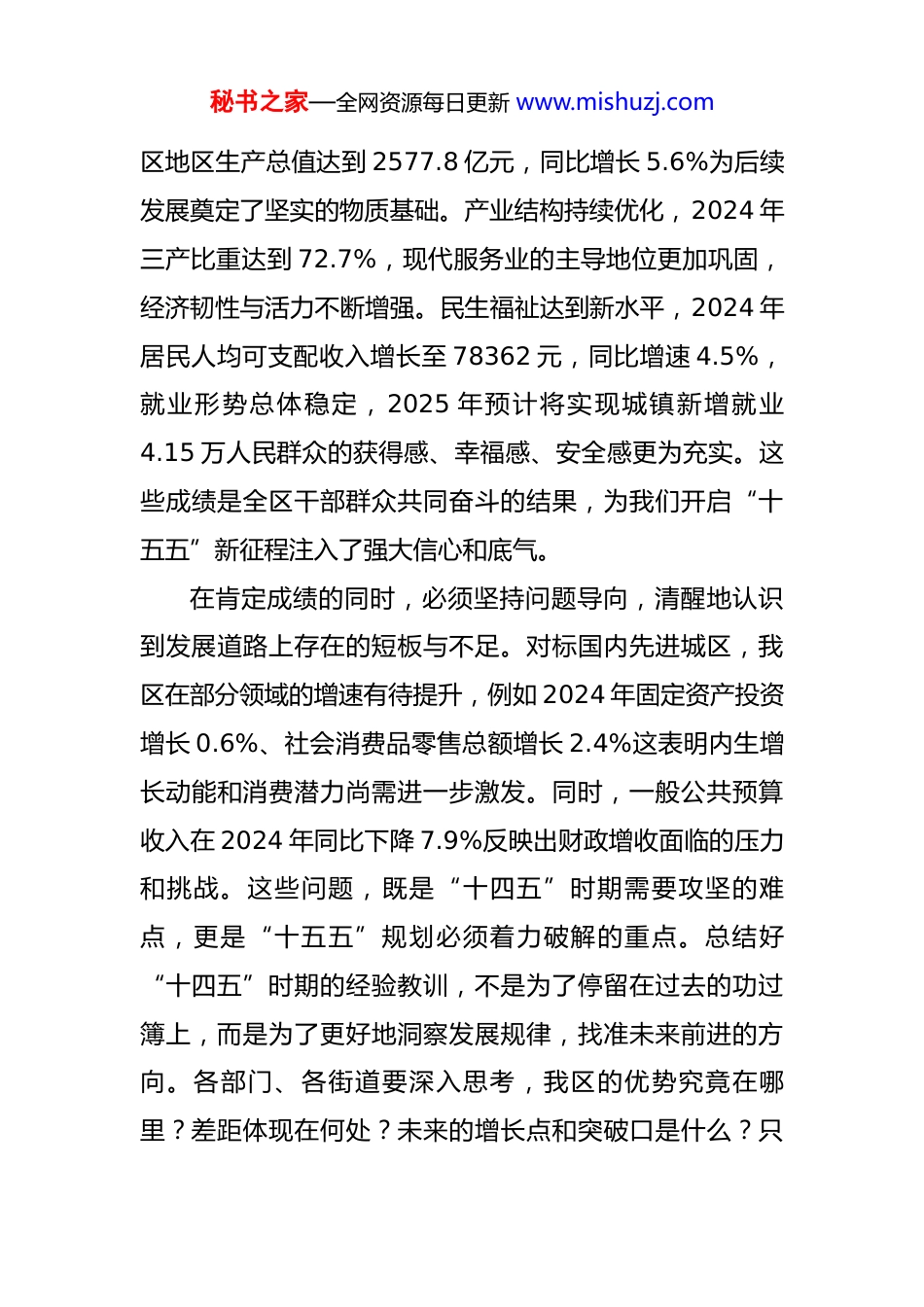秘书之家—全网资源每日更新 www.mishuzj.com在全区“十五五”规划编制专题会议上的讲话 同志们:今天,我们召开全区“十五五”规划编制专题会议,主要任务是深入贯彻党的二十届四中全会精神,全面落实国家、省、市关于“十五五”规划编制工作的决策部署,统一思想、凝聚共识,共同谋划布局我区未来五年的宏伟蓝图。“十五五”时期,即 2026 年至 2030 年,是*区在新的历史起点上,推动高质量发展、加快现代化建设的关键五年。编制一部具有前瞻性、科学性和指导性的“十五五”规划,不仅是描绘未来发展路径的战略纲领,更是回应全区人民对美好生活新期待的庄严承诺。做好这项工作,意义重大,影响深远。下面,我讲几点意见。一、科学研判形势在总结经验中把握发展主动谋定而后动,知止而有得。科学编制“十五五”规划,首要任务就是对“十四五”时期的发展历程进行一次全面、深刻的复盘,既要肯定成绩、坚定信心,也要正视问题、迎接挑战,从而在新征程上牢牢把握发展的主动权。回望“十四五”,在复杂严峻的外部环境和艰巨繁重的改革发展任务面前,全区上下砥砺前行,经济社会发展取得了来之不易的成就。经济总量实现新跨越,2024 年全秘书之家—全网资源每日更新 www.mishuzj.com区地区生产总值达到 2577.8 亿元,同比增长 5.6%为后续发展奠定了坚实的物质基础。产业结构持续优化,2024 年三产比重达到 72.7%,现代服务业的主导地位更加巩固,经济韧性与活力不断增强。民生福祉达到新水平,2024 年居民人均可支配收入增长至 78362 元,同比增速 4.5%,就业形势总体稳定,2025 年预计将实现城镇新增就业4.15 万人民群众的获得感、幸福感、安全感更为充实。这些成绩是全区干部群众共同奋斗的结果,为我们开启“十五五”新征程注入了强大信心和底气。在肯定成绩的同时,必须坚持问题导向,清醒地认识到发展道路上存在的短板与不足。对标国内先进城区,我区在部分领域的增速有待提升,例如 2024 年固定资产投资增长 0.6%、社会消费品零售总额增长 2.4%这表明内生增长动能和消费潜力尚需进一步激发。同时,一般公共预算收入在 2024 年同比下降 7.9%反映出财政增收面临的压力和挑战。这些问题,既是“十四五”时期需要攻坚的难点,更是“十五五”规划必须着力破解的重点。总结好“十四五”时期的经验教训,不是为了停留在过去的功过簿上,而是为了更好地洞察发展规律,找准未来前进的方向。各部门、各街道要深入思考,我区的优势究竟在哪里?差距体现在何处?未来的增长点和突破口是什么?只秘书之家—全网资源每日更新 www.mishuzj.com有把这些根本性问题想清楚、研究透,才能确保“十五五”规划的编制工作立足现实、靶向精准。二、提升战略站位在服务大局中明确发展蓝图编制“十五五”规划,必须具备宽广的视野和宏大的格局。要坚决扛起省会中心城区的政治担当,自觉地“跳出*看*”,将我区的发展置于全国、全省、全市的发展大局之中进行审视和谋划,找准定位、明确方向,确保规划既体现国家战略导向,又彰显*特色。一是要明晰战略定位。在新的发展阶段,*区不能仅仅满足于做一个经济强区,而应致力于成为引领区域发展的核心引擎、探索超大城市中心城区治理现代化的示范样板、汇聚全球创新要素的开放高地。这一定位,要求规划不仅要关注经济指标的增长,更要注重发展质量的提升、治理能力的现代化和城区影响力的扩展。二是要确立奋斗目标。基于这一战略定位,“十五五”期间,*区的总体奋斗目标应当是:经济综合实力和发展质效实现新一轮跃升,城区功能品质和治理水平达到国内一流水准,在全省的首位度与核心地位更加巩固,部分关键领域的发展指标率先达到国内顶尖城区水平。为实现这一宏伟目标,需要设定一系列具有挑战性和牵引性的量化指标。例如,可以研究提出“十五五”期间地区生产总秘书之家—全网资源每日更新 www.mishuzj.com值年均增速保持在 6%左右,到 2030 年经济总量突破3500 亿元大关;全社会研发经费投入强度稳步提升,努力达到先进水平;居民人均可支配收入增长与经济增长基本同步,确保发展成果更多更公平惠及全体人民。这些目标一...