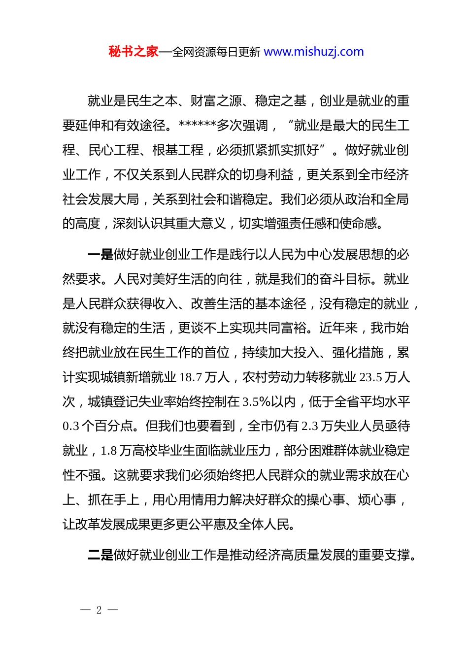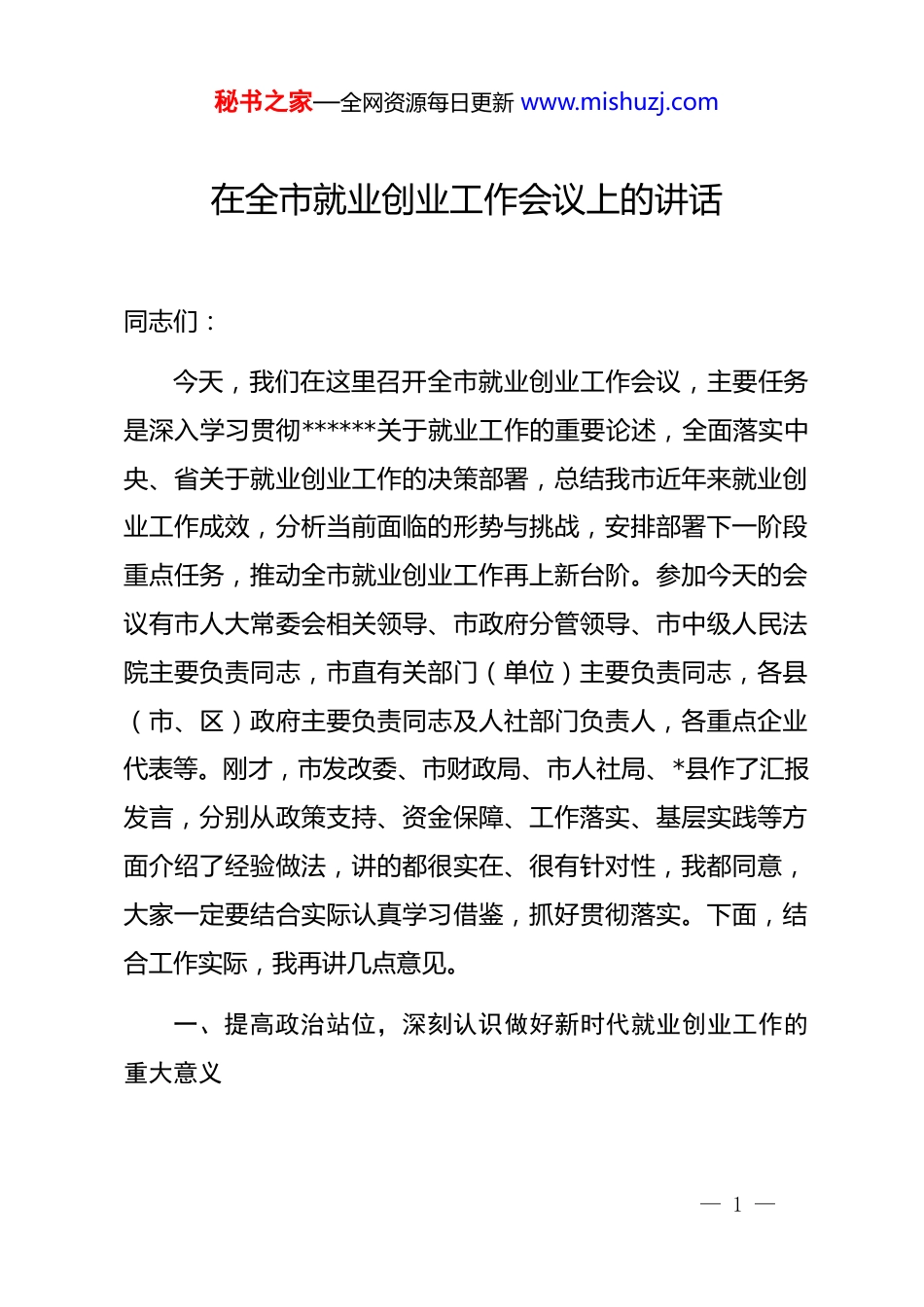 秘书之家—全网资源每日更新 www.mishuzj.com在全市就业创业工作会议上的讲话同志们:今天,我们在这里召开全市就业创业工作会议,主要任务是深入学习贯彻******关于就业工作的重要论述,全面落实中央、省关于就业创业工作的决策部署,总结我市近年来就业创业工作成效,分析当前面临的形势与挑战,安排部署下一阶段重点任务,推动全市就业创业工作再上新台阶。参加今天的会议有市人大常委会相关领导、市政府分管领导、市中级人民法院主要负责同志,市直有关部门(单位)主要负责同志,各县(市、区)政府主要负责同志及人社部门负责人,各重点企业代表等。刚才,市发改委、市财政局、市人社局、*县作了汇报发言,分别从政策支持、资金保障、工作落实、基层实践等方面介绍了经验做法,讲的都很实在、很有针对性,我都同意,大家一定要结合实际认真学习借鉴,抓好贯彻落实。下面,结合工作实际,我再讲几点意见。一、提高政治站位,深刻认识做好新时代就业创业工作的重大意义— 1 —秘书之家—全网资源每日更新 www.mishuzj.com就业是民生之本、财富之源、稳定之基,创业是就业的重要延伸和有效途径。******多次强调,“就业是最大的民生工程、民心工程、根基工程,必须抓紧抓实抓好”。做好就业创业工作,不仅关系到人民群众的切身利益,更关系到全市经济社会发展大局,关系到社会和谐稳定。我们必须从政治和全局的高度,深刻认识其重大意义,切实增强责任感和使命感。一是做好就业创业工作是践行以人民为中心发展思想的必然要求。人民对美好生活的向往,就是我们的奋斗目标。就业是人民群众获得收入、改善生活的基本途径,没有稳定的就业,就没有稳定的生活,更谈不上实现共同富裕。近年来,我市始终把就业放在民生工作的首位,持续加大投入、强化措施,累计实现城镇新增就业 18.7 万人,农村劳动力转移就业 23.5 万人次,城镇登记失业率始终控制在 3.5%以内,低于全省平均水平0.3 个百分点。但我们也要看到,全市仍有 2.3 万失业人员亟待就业,1.8 万高校毕业生面临就业压力,部分困难群体就业稳定性不强。这就要求我们必须始终把人民群众的就业需求放在心上、抓在手上,用心用情用力解决好群众的操心事、烦心事,让改革发展成果更多更公平惠及全体人民。二是做好就业创业工作是推动经济高质量发展的重要支撑。— 2 —秘书之家—全网资源每日更新 www.mishuzj.com就业与经济发展相辅相成、相互促进。一方面,经济发展是就业的基础,只有经济持续健康发展,才能创造更多就业岗位;另一方面,充分就业能够为经济发展提供充足的人力资源保障,激发消费潜力,拉动内需增长。当前,我市正处于转型升级、爬坡过坎的关键时期,新能源、新材料、高端装备制造等新兴产业加速崛起,对高素质劳动力的需求日益迫切。2024 年,我市战略性新兴产业产值同比增长 15.2%,带动新增就业岗位 1.2万个,但技能型人才缺口仍达 8000 余人,一定程度上制约了产业发展。同时,通过鼓励创业可以催生新产业、新业态、新模式,2023 年全市新增市场主体 1.5 万户,带动就业 4.2 万人,创业对就业的倍增效应日益凸显。因此,做好就业创业工作,能够为经济高质量发展提供坚实的人力支撑和内生动力。三是做好就业创业工作是维护社会和谐稳定的根本保障。就业是社会稳定的 “压舱石”,只有人人有活干、有收入,社会才能和谐稳定、长治久安。当前,国际形势复杂多变,国内经济面临下行压力,就业领域的不确定因素增多。从我市情况看,2024 年全市化解过剩产能涉及职工 3200 人,虽然通过转岗培训、再就业帮扶等措施实现了 98% 的再就业,但仍有部分人员面临就业困难;此外,随着城镇化进程加快,每年有 1.2 万— 3 —秘书之家—全网资源每日更新 www.mishuzj.com农村劳动力涌入城镇寻找工作,就业市场竞争日趋激烈。如果这些群体的就业问题得不到妥善解决,不仅会影响其家庭生活,还可能引发一系列社会问题。因此,我们必须把就业创业工作作为维护社会稳定的重要抓手,全力以赴做好各项工作,为全市经济社会发展营造良好环境。二、客观总结成绩,准确把握当前就业创业工作的...