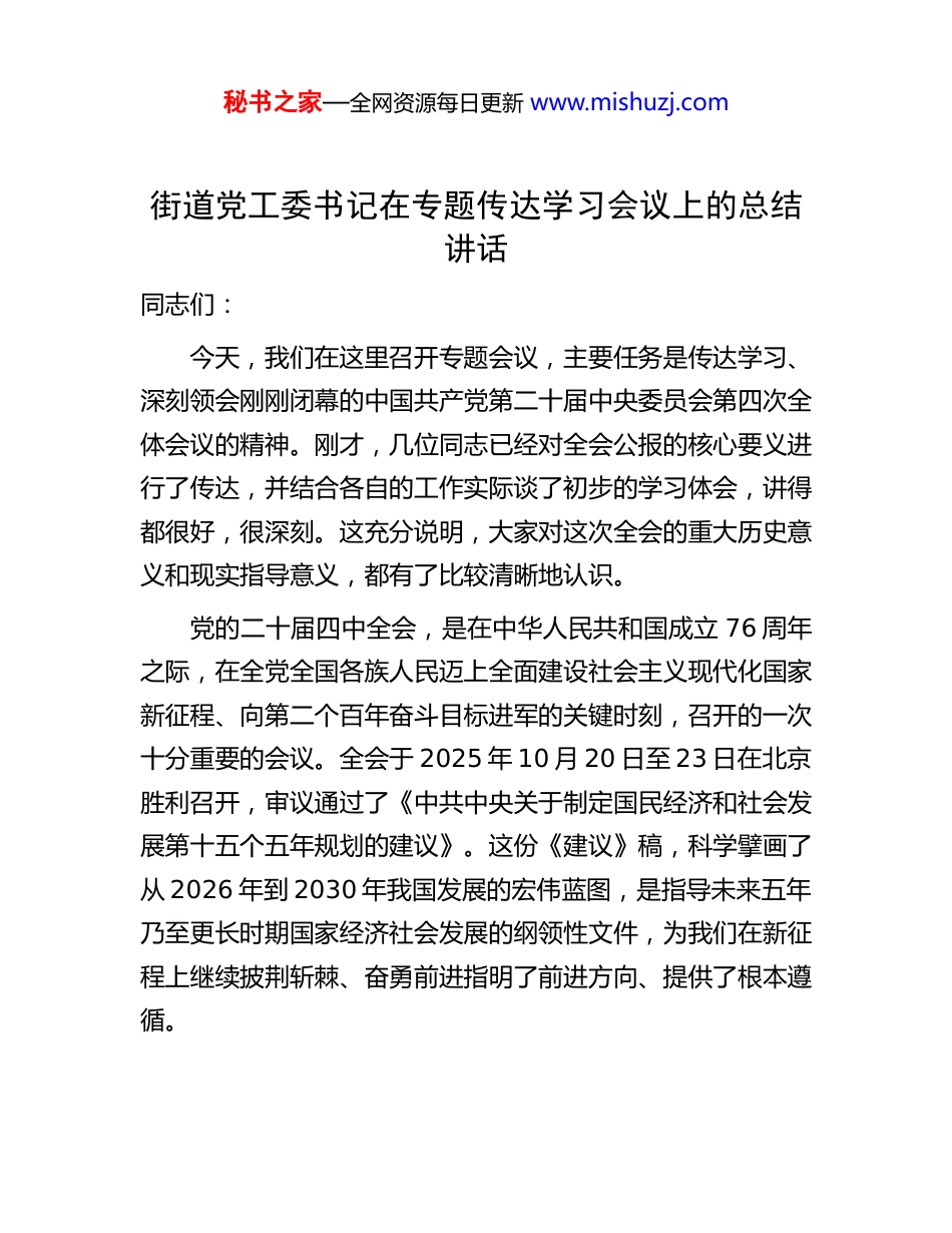 秘书之家—全网资源每日更新 www.mishuzj.com街道党工委书记在专题传达学习会议上的总结讲话同志们:今天,我们在这里召开专题会议,主要任务是传达学习、深刻领会刚刚闭幕的中国共产党第二十届中央委员会第四次全体会议的精神。刚才,几位同志已经对全会公报的核心要义进行了传达,并结合各自的工作实际谈了初步的学习体会,讲得都很好,很深刻。这充分说明,大家对这次全会的重大历史意义和现实指导意义,都有了比较清晰地认识。党的二十届四中全会,是在中华人民共和国成立 76 周年之际,在全党全国各族人民迈上全面建设社会主义现代化国家新征程、向第二个百年奋斗目标进军的关键时刻,召开的一次十分重要的会议。全会于 2025 年 10 月 20 日至 23 日在北京胜利召开,审议通过了《中共中央关于制定国民经济和社会发展第十五个五年规划的建议》。这份《建议》稿,科学擘画了从 2026 年到 2030 年我国发展的宏伟蓝图,是指导未来五年乃至更长时期国家经济社会发展的纲领性文件,为我们在新征程上继续披荆斩棘、奋勇前进指明了前进方向、提供了根本遵循。秘书之家—全网资源每日更新 www.mishuzj.com现在,根据会议安排,我结合自己的学习思考,围绕如何将全会精神贯彻落实到我们*街道的具体工作中,再讲三点意见,与同志们作一个深入的交流。一、学深悟透精神内核,牢牢把握全会的目标方向学习领会四中全会精神,首要任务是原原本本、逐字逐句地研读全会公报,深刻理解其中蕴含的一系列新思想、新观点、新论断。不能浅尝辄止、浮于表面,必须往深里走、往实里走、往心里走,真正把握其精神实质和核心要义。第一,要深刻认识“十五五”时期的关键历史定位。全会公报明确指出,“十五五”时期是基本实现社会主义现代化的关键五年,是承前启后、继往开来的攻坚期和窗口期。这意味着,未来五年,不再是简单的量的积累,而是质的跃升;不再是单兵突进,而是系统集成。每一项工作的成效,都直接关系到 2035 年基本实现社会主义现代化的宏伟目标能否如期达成。我们街道的每一名党员干部,都必须站在这个历史高度上,审视自己的工作,思考街道的发展,把我们的各项事业放到党和国家事业发展全局中去谋划和推进,增强责任感、使命感和紧迫感。第二,要准确把握以高质量发展为主题的战略导向。全会精神通篇贯穿着高质量发展这条主线。公报提出的一系列目标任务,无论是构建现代化产业体系、强化国家战略科技力量,秘书之家—全网资源每日更新 www.mishuzj.com还是全面推进乡村振兴、促进区域协调发展,最终都指向发展的质量和效益。对于我们街道而言,高质量发展不是一个空洞的概念。它体现在我们经济发展的“含金量”上,要求我们不能只盯着传统的指标,更要关注科技创新企业的引进、楼宇经济的坪效、辖区商圈的活力;它体现在城市管理的“精细度”上,要求我们从群众身边的一条路、一盏灯、一个井盖做起,下足“绣花”功夫;它体现在公共服务的“满意度”上,要求我们的服务供给更加均衡、更加优质、更加精准地对接群众需求。第三,要坚定贯彻全面深化改革和推进治理能力现代化的核心要求。改革是发展的根本动力。全会强调,要坚定不移推进全面深化改革,着力破解深层次体制机制障碍,为高质量发展注入强大动能。同时,全会也对推进国家治理体系和治理能力现代化作出了新的重大部署。这与我们基层工作息息相关。街道作为国家治理体系的“神经末梢”,是党和政府联系群众、服务群众的“最后一公里”。全会释放出的强烈信号是,基层治理必须向更高效能、更高水平迈进。这意味着过去的“老办法”可能不灵了,过去的“旧路径”可能走不通了。我们必须以改革的精神、创新的勇气,去探索基层治理的新模式、新手段,切实提升我们应对复杂局面、服务人民群众的本领。二、立足街道职能定位,持续提升基层治理能力水平秘书之家—全网资源每日更新 www.mishuzj.com学习的目的全在于应用。将四中全会描绘的宏伟蓝图转化为*街道的生动实践,关键在于找准结合点和发力点,把街道的职能定位与全会的要求部署精准对接。街道办事处作为区委、区政府的派出机关,承担着加强党的建设、统...