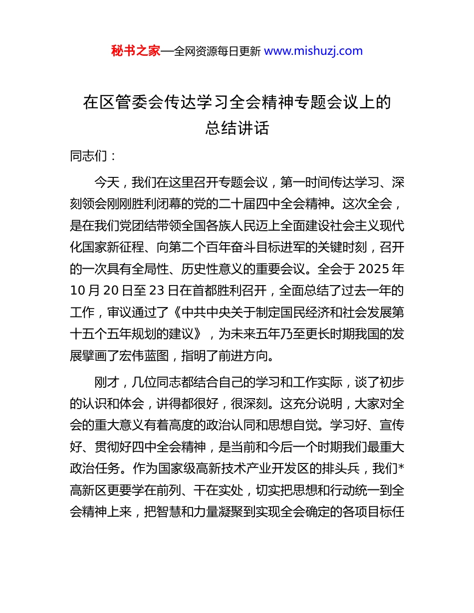 秘书之家—全网资源每日更新 www.mishuzj.com在区管委会传达学习全会精神专题会议上的总结讲话同志们:今天,我们在这里召开专题会议,第一时间传达学习、深刻领会刚刚胜利闭幕的党的二十届四中全会精神。这次全会,是在我们党团结带领全国各族人民迈上全面建设社会主义现代化国家新征程、向第二个百年奋斗目标进军的关键时刻,召开的一次具有全局性、历史性意义的重要会议。全会于 2025 年10 月 20 日至 23 日在首都胜利召开,全面总结了过去一年的工作,审议通过了《中共中央关于制定国民经济和社会发展第十五个五年规划的建议》,为未来五年乃至更长时期我国的发展擘画了宏伟蓝图,指明了前进方向。刚才,几位同志都结合自己的学习和工作实际,谈了初步的认识和体会,讲得都很好,很深刻。这充分说明,大家对全会的重大意义有着高度的政治认同和思想自觉。学习好、宣传好、贯彻好四中全会精神,是当前和今后一个时期我们最重大政治任务。作为国家级高新技术产业开发区的排头兵,我们*高新区更要学在前列、干在实处,切实把思想和行动统一到全会精神上来,把智慧和力量凝聚到实现全会确定的各项目标任秘书之家—全网资源每日更新 www.mishuzj.com务上来。下面,结合今天的学习和*高新区的实际,我再谈三点体会和要求。一、准确把握精神要旨,深刻领悟全会的创新理论党的理论创新每前进一步,理论武装就要跟进一步。党的二十届四中全会公报内容博大精深,提出了一系列新思想、新观点、新论断,是我们开启“十五五”新征程的根本遵循和行动指南。学习领会全会精神,首要的就是要原原本本、逐字逐句地研读公报和《建议》全文,深刻领悟贯穿其中的马克思主义立场观点方法,准确把握其核心要义和精神实质。首先,要深刻领会“新质生产力”作为核心驱动力的战略定位。全会公报明确指出,发展新质生产力是推动高质量发展的内在要求和重要着力点。这已经不是一个简单的经济学概念,而是被提升到了事关发展全局的战略高度。全会深刻阐述了新质生产力的内涵,它是由技术革命性突破、生产要素创新性配置、产业深度转型升级而催生的当代先进生产力。其特点是高科技、高效能、高质量。这一重大论断,精准指出了新发展阶段我国经济转型升级的主攻方向。对于我们*高新区而言,我们从诞生之日起就肩负着探索和发展先进生产力的使命。过去我们依靠政策优势和区位优势实现了快速发展,未来要实现更高质量的发展,就必须牢牢抓住新质生产力这个“牛鼻子”,把发展的基点真正放到创新驱动上来。秘书之家—全网资源每日更新 www.mishuzj.com其次,要深刻领会“高水平科技自立自强”作为国家发展基石的极端重要性。全会公报在“十二项重大部署”中,将“加快实现高水平科技自立自强”置于极其重要的位置,强调要加强基础研究、原始创新和关键核心技术攻关,健全新型举国体制,打赢关键核心技术攻坚战(综合考虑各方面因素)。这充分彰显了党中央对当前国际科技竞争态势的深刻洞察和坚定决心。面对日益复杂严峻的国际环境和“卡脖子”风险,科技自立自强不是一道选择题,而是一道必答题,关系到我们的发展主动权和国家安全。我们*高新区作为科技创新的主阵地,必须强化使命担当,清醒地认识到,我们不仅是区域经济的增长极,更是国家战略科技力量的重要组成部分。园区的一举一动,都与国家科技安全和产业安全息息相关。最后,要深刻领会“全面深化改革开放”作为发展活力之源的时代要求。全会强调,必须坚定不移依靠改革开放增强发展内生动力。其中,构建高水平社会主义市场经济体制、建设高标准市场体系、营造市场化、法治化、国际化一流营商环境被放到了突出位置。这表明,未来的竞争,不仅是技术和产业的竞争,更是制度和环境的竞争。一个地区、一个园区有没有吸引力、竞争力,关键就看它的制度环境是否优越。我们必须破除一切制约科技创新和产业发展的思想障碍和制度藩篱,以刀刃向内的勇气,持续深化改革,让各类先进优质生产要素在*高新区竞相迸发、充分涌流。秘书之家—全网资源每日更新 www.mishuzj.com二、聚焦科技创新引领,加快打造一流高新技术产业集群党的二十届四中全会为我们...