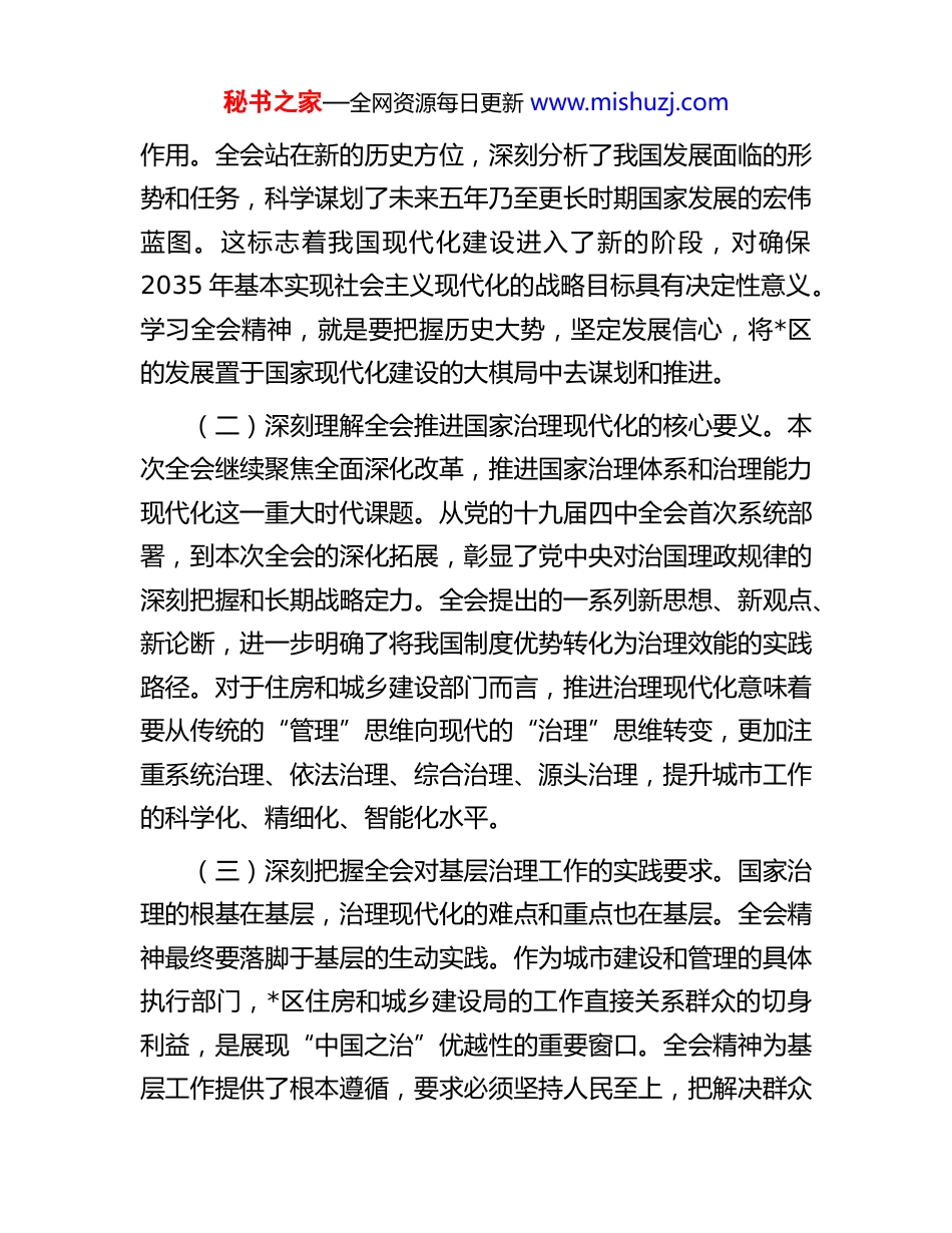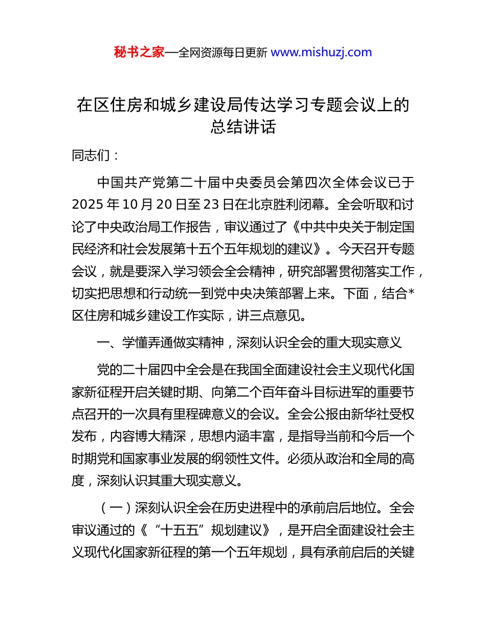 秘书之家—全网资源每日更新 www.mishuzj.com在区住房和城乡建设局传达学习专题会议上的总结讲话同志们:中国共产党第二十届中央委员会第四次全体会议已于2025 年 10 月 20 日至 23 日在北京胜利闭幕。全会听取和讨论了中央政治局工作报告,审议通过了《中共中央关于制定国民经济和社会发展第十五个五年规划的建议》。今天召开专题会议,就是要深入学习领会全会精神,研究部署贯彻落实工作,切实把思想和行动统一到党中央决策部署上来。下面,结合*区住房和城乡建设工作实际,讲三点意见。一、学懂弄通做实精神,深刻认识全会的重大现实意义党的二十届四中全会是在我国全面建设社会主义现代化国家新征程开启关键时期、向第二个百年奋斗目标进军的重要节点召开的一次具有里程碑意义的会议。全会公报由新华社受权发布,内容博大精深,思想内涵丰富,是指导当前和今后一个时期党和国家事业发展的纲领性文件。必须从政治和全局的高度,深刻认识其重大现实意义。(一)深刻认识全会在历史进程中的承前启后地位。全会审议通过的《“十五五”规划建议》,是开启全面建设社会主义现代化国家新征程的第一个五年规划,具有承前启后的关键秘书之家—全网资源每日更新 www.mishuzj.com作用。全会站在新的历史方位,深刻分析了我国发展面临的形势和任务,科学谋划了未来五年乃至更长时期国家发展的宏伟蓝图。这标志着我国现代化建设进入了新的阶段,对确保2035 年基本实现社会主义现代化的战略目标具有决定性意义。学习全会精神,就是要把握历史大势,坚定发展信心,将*区的发展置于国家现代化建设的大棋局中去谋划和推进。(二)深刻理解全会推进国家治理现代化的核心要义。本次全会继续聚焦全面深化改革,推进国家治理体系和治理能力现代化这一重大时代课题。从党的十九届四中全会首次系统部署,到本次全会的深化拓展,彰显了党中央对治国理政规律的深刻把握和长期战略定力。全会提出的一系列新思想、新观点、新论断,进一步明确了将我国制度优势转化为治理效能的实践路径。对于住房和城乡建设部门而言,推进治理现代化意味着要从传统的“管理”思维向现代的“治理”思维转变,更加注重系统治理、依法治理、综合治理、源头治理,提升城市工作的科学化、精细化、智能化水平。(三)深刻把握全会对基层治理工作的实践要求。国家治理的根基在基层,治理现代化的难点和重点也在基层。全会精神最终要落脚于基层的生动实践。作为城市建设和管理的具体执行部门,*区住房和城乡建设局的工作直接关系群众的切身利益,是展现“中国之治”优越性的重要窗口。全会精神为基层工作提供了根本遵循,要求必须坚持人民至上,把解决群众秘书之家—全网资源每日更新 www.mishuzj.com急难愁盼问题作为出发点和落脚点,通过一件件具体的民生工程、城市更新项目,让群众真切感受到治理现代化带来的实惠和变化。必须将全会精神内化于心、外化于行,转化为推动*区城乡建设的强大动力和实际成效。二、聚焦城乡建设重点,全力推动城市品质提升工程学习贯彻全会精神,关键在于落实。要把全会的战略部署与*区住房和城乡建设工作的具体实际紧密结合,以推动城市高质量发展为主题,以城市品质提升工程为总抓手,奋力开创工作新局面。(一)以城市更新行动为牵引,优化城市空间布局与功能全会强调全面深化改革,为城市更新工作提供了政策机遇和方向指引。要坚持“留、改、拆”并举,以保留利用提升为主,防止大拆大建。要聚焦*区中心城区功能疏解、老旧工业区转型、历史文脉传承等重点区域,系统谋划,成片推进。通过城市更新,不仅要改善城市面貌,更要植入新产业、新业态,完善公共服务设施,增强城市活力和竞争力。要探索建立可持续的城市更新模式,健全政策法规体系,吸引社会资本参与,形成政府引导、市场运作、公众参与的多方共建格局。这既是城市发展到新阶段的必然要求,也是推进城市治理现代化的具体实践。秘书之家—全网资源每日更新 www.mishuzj.com(二)以基础设施建设为支撑,筑牢城市安全运行底线。城市基础设施是城市运行的命脉,是城市品质的物质基础。要聚焦全会提出的提高风险防控与治理效能的...