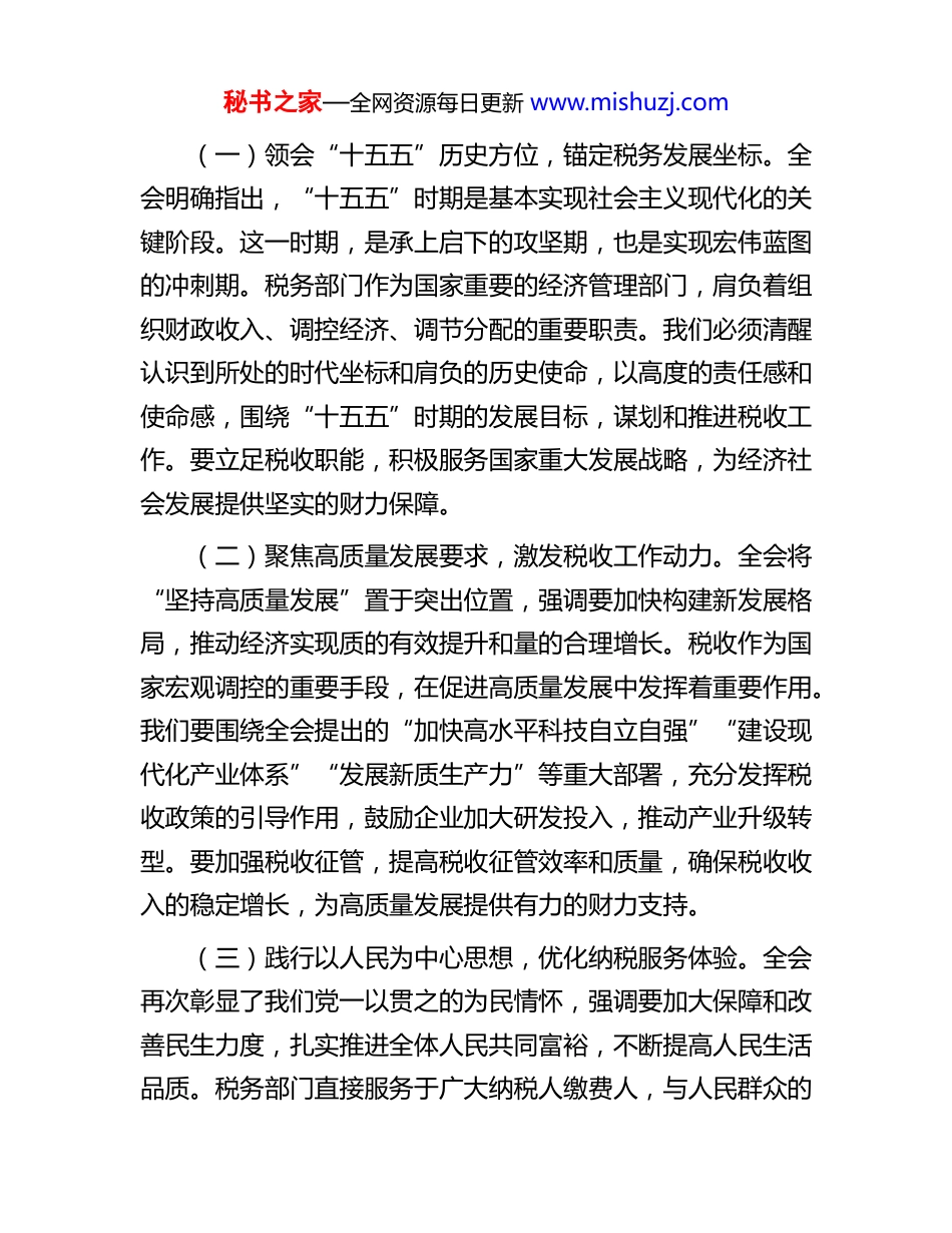 秘书之家—全网资源每日更新 www.mishuzj.com在税务局理论学习中心组专题传达学习会议上的总结讲话同志们:今天,我们召开这次理论学习中心组专题会议,核心任务就是传达学习刚刚闭幕的党的二十届四中全会精神,并研究部署我局的贯彻落实工作。刚才,*同志全面传达了全会公报的主要内容,几位同志也结合自身工作实际交流了初步的学习体会,大家的发言都很深刻、很有见地,展现出了对全会精神的深入思考和积极探索。下面,我结合税务部门的职能定位和工作实际,讲三点意见,作为本次会议的总结。一、提升政治站位,精准把握全会精神核心要义党的二十届四中全会,是在中华人民共和国成立 76 周年之际,在全面建设社会主义现代化国家、向第二个百年奋斗目标进军的关键节点召开的一次具有全局性、历史性意义的重要会议。全会审议通过的《中共中央关于制定国民经济和社会发展第十五个五年规划的建议》,为我国未来五年乃至更长时期的发展指明了前进方向,是指导我们奋进新征程、夺取新胜利的纲领性文件。税务系统全体党员干部必须站在政治和全局的高度,深刻领会全会精神的丰富内涵与实践要求,切实把思想和行动统一到党中央的决策部署上来。秘书之家—全网资源每日更新 www.mishuzj.com(一)领会“十五五”历史方位,锚定税务发展坐标。全会明确指出,“十五五”时期是基本实现社会主义现代化的关键阶段。这一时期,是承上启下的攻坚期,也是实现宏伟蓝图的冲刺期。税务部门作为国家重要的经济管理部门,肩负着组织财政收入、调控经济、调节分配的重要职责。我们必须清醒认识到所处的时代坐标和肩负的历史使命,以高度的责任感和使命感,围绕“十五五”时期的发展目标,谋划和推进税收工作。要立足税收职能,积极服务国家重大发展战略,为经济社会发展提供坚实的财力保障。(二)聚焦高质量发展要求,激发税收工作动力。全会将“坚持高质量发展”置于突出位置,强调要加快构建新发展格局,推动经济实现质的有效提升和量的合理增长。税收作为国家宏观调控的重要手段,在促进高质量发展中发挥着重要作用。我们要围绕全会提出的“加快高水平科技自立自强”“建设现代化产业体系”“发展新质生产力”等重大部署,充分发挥税收政策的引导作用,鼓励企业加大研发投入,推动产业升级转型。要加强税收征管,提高税收征管效率和质量,确保税收收入的稳定增长,为高质量发展提供有力的财力支持。(三)践行以人民为中心思想,优化纳税服务体验。全会再次彰显了我们党一以贯之的为民情怀,强调要加大保障和改善民生力度,扎实推进全体人民共同富裕,不断提高人民生活品质。税务部门直接服务于广大纳税人缴费人,与人民群众的秘书之家—全网资源每日更新 www.mishuzj.com利益息息相关。我们要将以人民为中心的发展思想贯穿于税收工作的全过程,不断优化纳税服务,提高办税缴费的便利化程度。要加强税收政策宣传解读,确保纳税人缴费人应享尽享税收优惠政策。要畅通纳税人缴费人诉求表达渠道,及时解决他们的痛点、难点、堵点问题,切实增强纳税人缴费人的获得感和满意度。(四)贯彻统筹发展安全原则,防范税收领域风险。安全是发展的前提,发展是安全的保障。全会强调要更好统筹发展和安全,推进国家安全体系和能力现代化。税务部门在经济社会发展中处于重要位置,面临着各种风险挑战。我们要增强忧患意识,坚持底线思维,加强税收风险防控。要加强对重点行业、重点企业的税收监管,防范税收流失风险。要加强税收数据安全管理,保障纳税人缴费人信息安全。要积极参与社会综合治理,维护税收秩序和经济安全。二、紧扣职责使命,全力推动税收工作提质增效学习贯彻全会精神,关键在于结合实际、推动工作。税务部门作为国家税收征管的职能部门,承担着组织税收收入、落实税收政策、优化纳税服务等重要职责。我们要把全会精神转化为做好税收工作的具体思路、务实举措和实际行动,在服务经济社会发展大局中展现新担当、新作为。秘书之家—全网资源每日更新 www.mishuzj.com(一)围绕组织收入中心,确保税收稳定增长。组织税收收入是税务部门的首要职责。我们要按照全会提出的经济发展目标,科学...