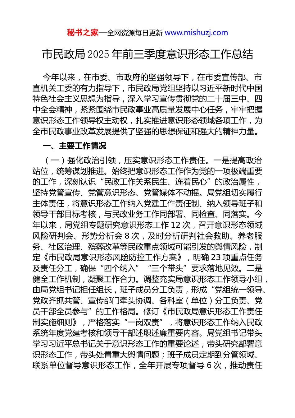 秘书之家—全网资源每日更新 www.mishuzj.com市民政局 2025 年前三季度意识形态工作总结今年以来,在市委、市政府的坚强领导下,在市委宣传部、市直机关工委的有力指导下,市民政局党组坚持以习近平新时代中国特色社会主义思想为指导,深入学习宣传贯彻党的二十届三中、四中全会精神,紧紧围绕市民政事业高质量发展中心任务,牢牢把握意识形态工作领导权主动权,扎实推进意识形态领域各项工作,为全市民政事业改革发展提供了坚强的思想保证和强大的精神力量。一、主要工作情况(一)强化政治引领,压实意识形态工作责任。一是提高政治站位,统筹谋划推进。始终把意识形态工作作为党的一项极端重要的工作,深刻认识“民政工作关系民生、连着民心”的政治属性,坚持党管宣传、党管意识形态、党管媒体不动摇。局党组切实履行主体责任,将意识形态工作纳入党建工作责任制、纳入领导班子和领导干部目标考核,与民政业务工作同部署、同检查、同落实。今年以来,局党组专题研究意识形态工作 12 次,召开意识形态领域风险研判会、形势分析会 8 次,及时分析研判社会救助、养老服务、社区治理、殡葬改革等民政重点领域可能引发的舆情风险,制定《市民政局意识形态风险防控工作方案》,明确 23 项重点任务及责任分工,确保“四个纳入”“三个带头”要求落地见效。二是健全工作机制,凝聚工作合力。调整充实局意识形态工作领导小组,由局党组书记担任组长,班子成员分工负责,形成“党组统一领导、党政齐抓共管、宣传部门牵头协调、各科室(单位)分工负责、党员干部全员参与”的工作格局。修订《市民政局意识形态工作责任制实施细则》,严格落实“一岗双责”,将意识形态工作纳入民政系统年度党建考核和领导干部述职述廉重要内容。局党组书记带头学习习近平总书记关于意识形态工作的重要论述,带头研究部署意识形态工作,带头处置重大舆情问题;班子成员定期到分管领域、联系单位督导意识形态工作,全年开展专项督导 6 次,推动责任秘书之家—全网资源每日更新 www.mishuzj.com层层传导。三是强化阵地管理,筑牢安全防线。严格规范局属各类宣传阵地管理,包括门户网站、“我市民政”微信公众号、微博、视频号,以及内部刊物、宣传栏、会议论坛等。建立新闻稿件“三审三校”制度,加强对民政政策解读、典型宣传、民生服务等内容的审核把关,全年发布各类信息 1500 余条,未发生意识形态安全问题。加强对局属社会组织、养老机构、儿童福利机构等宣传思想阵地的指导,开展意识形态工作培训 2 次,覆盖 200 余人次,确保各类阵地可管可控。(二)深化理论武装,推动党的创新理论入脑入心。一是深入学习宣传贯彻党的二十届四中全会精神。把学习宣传贯彻党的二十届四中全会精神作为首要政治任务,制定《市民政局学习贯彻党的二十届四中全会精神工作方案》,通过党组理论学习中心组学习、专题读书班、党支部“三会一课”、主题党日等形式,组织党员干部开展集中学习 15 次、专题研讨 6 次。局党组书记带头作专题党课报告,班子成员到分管领域开展宣讲 12 场。依托“学习强国”学习平台、“我市民政”线上学习专栏,推送全会精神解读文章、学习资料 200 余篇,组织开展“民政党员谈体会”征文活动,收集心得体会 120 余篇,引导党员干部深刻领会全会精神核心要义。二是扎实开展理论宣传普及活动。结合民政工作实际,组织“民政政策宣讲团”“银发宣讲队”深入街道社区、养老机构、福利院所,开展“党的声音进万家”主题宣讲活动 30 余场,重点宣传党的二十大以来民政领域改革发展成就,解读社会救助、养老服务、基层治理等惠民政策,覆盖群众 5000 余人次。利用“我们的节日”等节点,开展“传承红色基因·践行民政初心”主题教育活动,组织党员干部参观红色教育基地,重温入党誓词,筑牢理想信念根基。(三)守牢网络阵地,维护意识形态领域安全。一是健全网络舆情监测处置机制。构建“专人负责、全域监测、及时研判、快速处置”的网络舆情工作体系,安排专人 24 小时监测各大新闻网站社交媒体平台涉及我市民政的信息,重点关注社会救助、殡葬服务、儿童福利等敏...