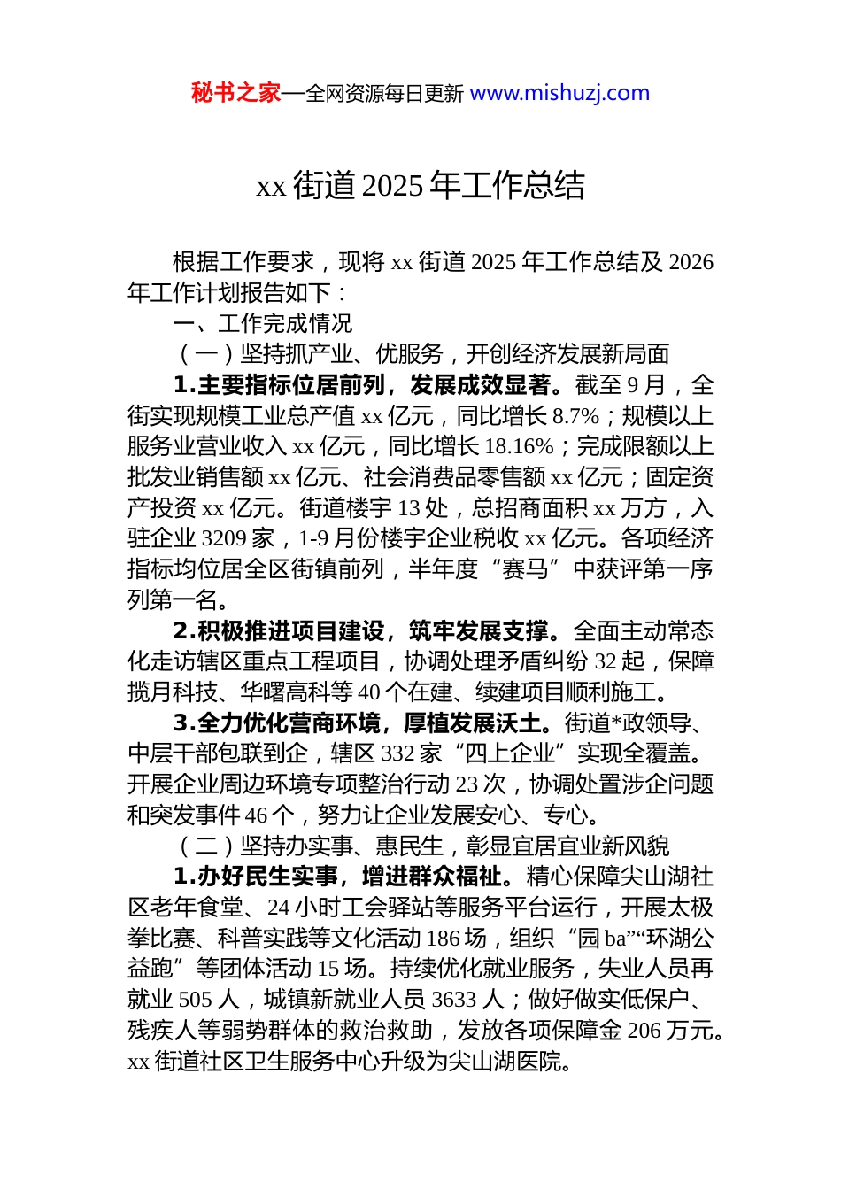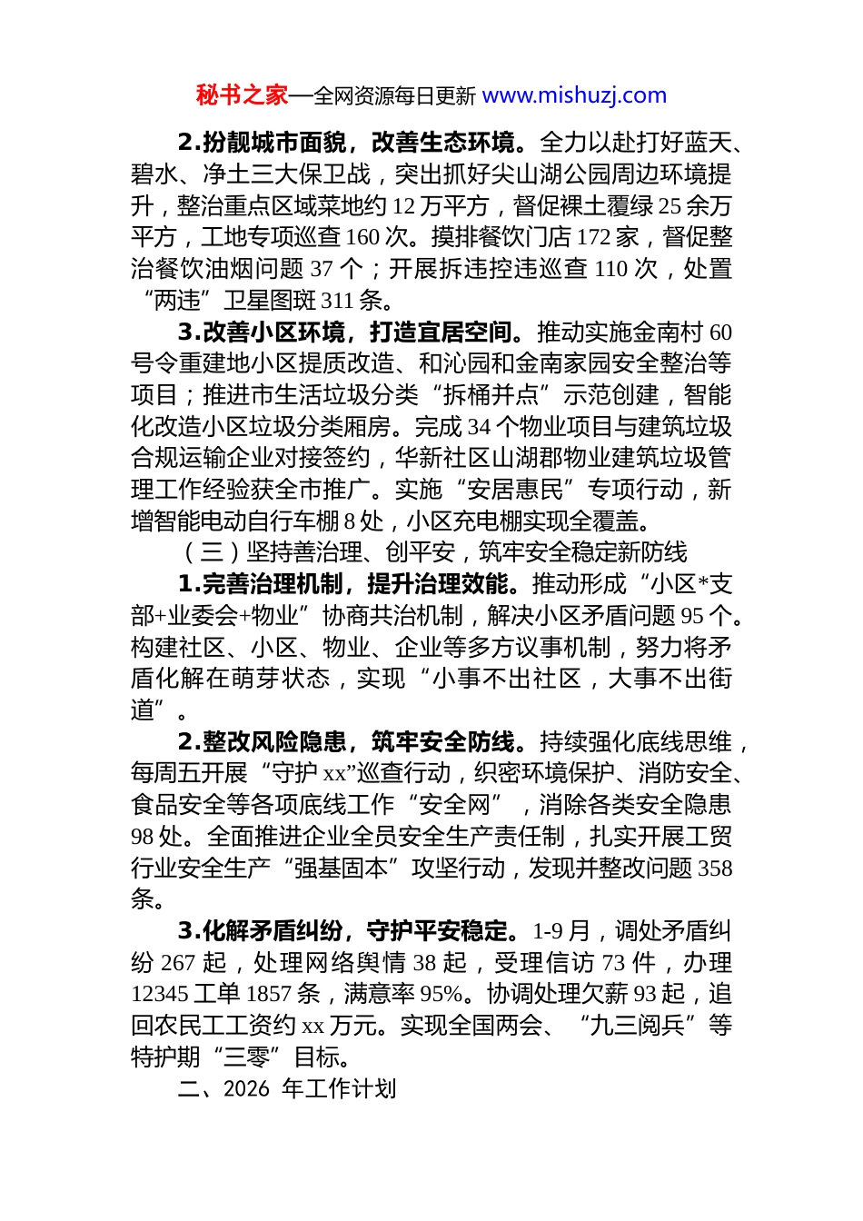 秘书之家—全网资源每日更新 www.mishuzj.comxx 街道 2025 年工作总结根据工作要求,现将 xx 街道 2025 年工作总结及 2026年工作计划报告如下:一、工作完成情况(一)坚持抓产业、优服务,开创经济发展新局面1.主要指标位居前列,发展成效显著。截至 9 月,全街实现规模工业总产值 xx 亿元,同比增长 8.7%;规模以上服务业营业收入 xx 亿元,同比增长 18.16%;完成限额以上批发业销售额 xx 亿元、社会消费品零售额 xx 亿元;固定资产投资 xx 亿元。街道楼宇 13 处,总招商面积 xx 万方,入驻企业 3209 家,1-9 月份楼宇企业税收 xx 亿元。各项经济指标均位居全区街镇前列,半年度“赛马”中获评第一序列第一名。2.积极推进项目建设,筑牢发展支撑。全面主动常态化走访辖区重点工程项目,协调处理矛盾纠纷 32 起,保障揽月科技、华曙高科等 40 个在建、续建项目顺利施工。3.全力优化营商环境,厚植发展沃土。街道*政领导、中层干部包联到企,辖区 332 家“四上企业”实现全覆盖。开展企业周边环境专项整治行动 23 次,协调处置涉企问题和突发事件 46 个,努力让企业发展安心、专心。(二)坚持办实事、惠民生,彰显宜居宜业新风貌1.办好民生实事,增进群众福祉。精心保障尖山湖社区老年食堂、24 小时工会驿站等服务平台运行,开展太极拳比赛、科普实践等文化活动 186 场,组织“园 ba”“环湖公益跑”等团体活动 15 场。持续优化就业服务,失业人员再就业 505 人,城镇新就业人员 3633 人;做好做实低保户、残疾人等弱势群体的救治救助,发放各项保障金 206 万元。xx 街道社区卫生服务中心升级为尖山湖医院。秘书之家—全网资源每日更新 www.mishuzj.com2.扮靓城市面貌,改善生态环境。全力以赴打好蓝天、碧水、净土三大保卫战,突出抓好尖山湖公园周边环境提升,整治重点区域菜地约 12 万平方,督促裸土覆绿 25 余万平方,工地专项巡查 160 次。摸排餐饮门店 172 家,督促整治餐饮油烟问题 37 个;开展拆违控违巡查 110 次,处置“两违”卫星图斑 311 条。3.改善小区环境,打造宜居空间。推动实施金南村 60号令重建地小区提质改造、和沁园和金南家园安全整治等项目;推进市生活垃圾分类“拆桶并点”示范创建,智能化改造小区垃圾分类厢房。完成 34 个物业项目与建筑垃圾合规运输企业对接签约,华新社区山湖郡物业建筑垃圾管理工作经验获全市推广。实施“安居惠民”专项行动,新增智能电动自行车棚 8 处,小区充电棚实现全覆盖。(三)坚持善治理、创平安,筑牢安全稳定新防线1.完善治理机制,提升治理效能。推动形成“小区*支部+业委会+物业”协商共治机制,解决小区矛盾问题 95 个。构建社区、小区、物业、企业等多方议事机制,努力将矛盾化解在萌芽状态,实现“小事不出社区,大事不出街道”。2.整改风险隐患,筑牢安全防线。持续强化底线思维,每周五开展“守护 xx”巡查行动,织密环境保护、消防安全、食品安全等各项底线工作“安全网”,消除各类安全隐患98 处。全面推进企业全员安全生产责任制,扎实开展工贸行业安全生产“强基固本”攻坚行动,发现并整改问题 358条。3.化解矛盾纠纷,守护平安稳定。1-9 月,调处矛盾纠纷 267 起,处理网络舆情 38 起,受理信访 73 件,办理12345 工单 1857 条,满意率 95%。协调处理欠薪 93 起,追回农民工工资约 xx 万元。实现全国两会、“九三阅兵”等特护期“三零”目标。二、2026 年工作计划秘书之家—全网资源每日更新 www.mishuzj.com(一)聚焦“一个核心”,推进*的建设1.深化理论武装。发挥街道工委*校主阵地作用,持续深入开展**************思想教育培训。2.夯实基层 dj。组织召开区域化 dj 联席会议,制定需求、资源、项目“三张清单”;保障新兴领域*组织“两个覆盖”有成效、出实绩。3.强化人才支撑。认真做好“湘江英才”申报宣传及初审工作;组织开展人才服务活动,营造辖区创新创业、成长成才氛围。四是推进清廉建设。巩固深化 dj 学习教育成果,锲而不舍落实中央八项规定精神,做好群众身边不正之风和腐败问题...