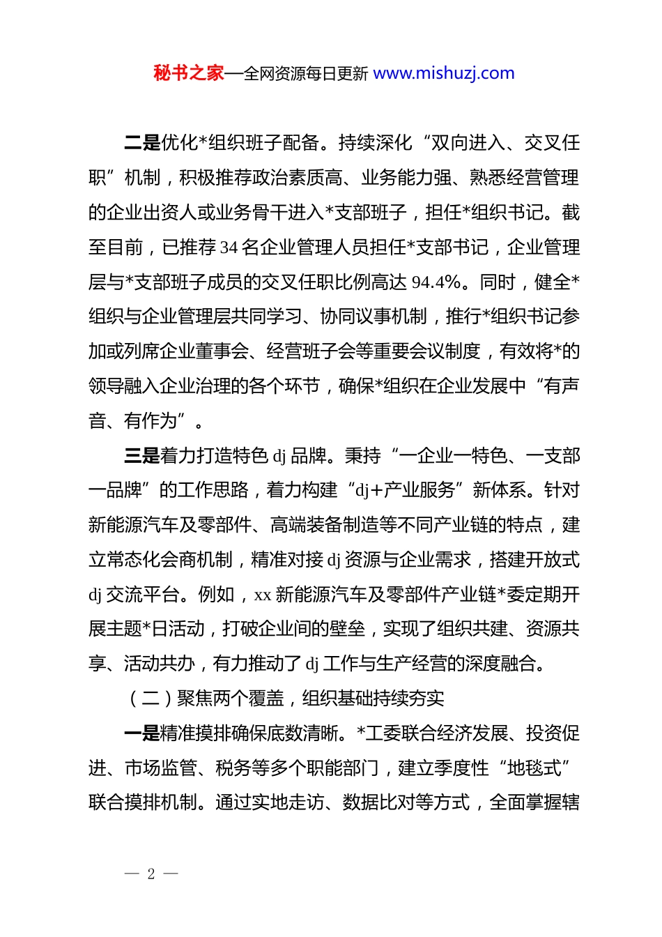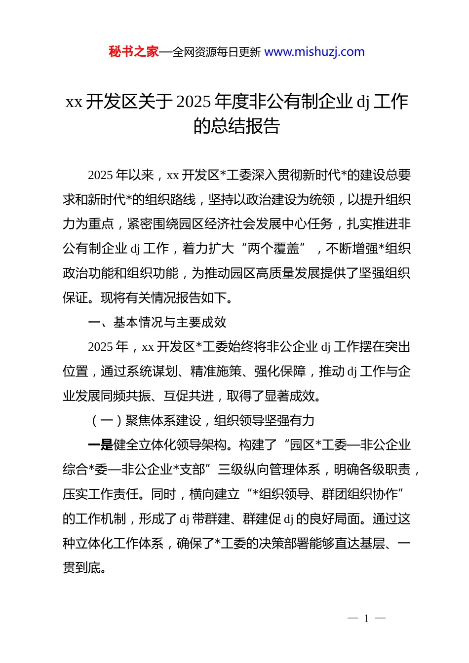 秘书之家—全网资源每日更新 www.mishuzj.comxx 开发区关于 2025 年度非公有制企业 dj 工作的总结报告2025 年以来,xx 开发区*工委深入贯彻新时代*的建设总要求和新时代*的组织路线,坚持以政治建设为统领,以提升组织力为重点,紧密围绕园区经济社会发展中心任务,扎实推进非公有制企业 dj 工作,着力扩大“两个覆盖”,不断增强*组织政治功能和组织功能,为推动园区高质量发展提供了坚强组织保证。现将有关情况报告如下。一、基本情况与主要成效2025 年,xx 开发区*工委始终将非公企业 dj 工作摆在突出位置,通过系统谋划、精准施策、强化保障,推动 dj 工作与企业发展同频共振、互促共进,取得了显著成效。(一)聚焦体系建设,组织领导坚强有力一是健全立体化领导架构。构建了“园区*工委—非公企业综合*委—非公企业*支部”三级纵向管理体系,明确各级职责,压实工作责任。同时,横向建立“*组织领导、群团组织协作”的工作机制,形成了 dj 带群建、群建促 dj 的良好局面。通过这种立体化工作体系,确保了*工委的决策部署能够直达基层、一贯到底。— 1 —秘书之家—全网资源每日更新 www.mishuzj.com二是优化*组织班子配备。持续深化“双向进入、交叉任职”机制,积极推荐政治素质高、业务能力强、熟悉经营管理的企业出资人或业务骨干进入*支部班子,担任*组织书记。截至目前,已推荐 34 名企业管理人员担任*支部书记,企业管理层与*支部班子成员的交叉任职比例高达 94.4%。同时,健全*组织与企业管理层共同学习、协同议事机制,推行*组织书记参加或列席企业董事会、经营班子会等重要会议制度,有效将*的领导融入企业治理的各个环节,确保*组织在企业发展中“有声音、有作为”。三是着力打造特色 dj 品牌。秉持“一企业一特色、一支部一品牌”的工作思路,着力构建“dj+产业服务”新体系。针对新能源汽车及零部件、高端装备制造等不同产业链的特点,建立常态化会商机制,精准对接 dj 资源与企业需求,搭建开放式dj 交流平台。例如,xx 新能源汽车及零部件产业链*委定期开展主题*日活动,打破企业间的壁垒,实现了组织共建、资源共享、活动共办,有力推动了 dj 工作与生产经营的深度融合。(二)聚焦两个覆盖,组织基础持续夯实一是精准摸排确保底数清晰。*工委联合经济发展、投资促进、市场监管、税务等多个职能部门,建立季度性“地毯式”联合摸排机制。通过实地走访、数据比对等方式,全面掌握辖— 2 —秘书之家—全网资源每日更新 www.mishuzj.com区内非公企业的经营状况、职工人数、*员数量及*组织组建情况,建立并动态更新“一企一策”管理台账。2025 年以来,共计摸排非公企业 189 家,其中符合“三有”组建条件的“三有”企业达 82 家,为精准推进组织覆盖奠定了坚实基础。二是灵活设确保组织应建尽建。根据摸排情况,按照“成熟一个、组建一个”的原则,采取多种灵活方式推进*组织建设。对*员人数达到 3 人以上的企业,指导其单独成立*支部;对*员不足 3 人或暂无*员的小微企业,按照地域相邻、行业相近的原则,组建联合*支部。今年以来,累计新组建联合*支部 12 个,覆盖企业 72 家。同时,对于新入驻的企业,dj 工作同步跟进,确保*的组织覆盖不留空白。三是深化指导确保工作有效覆盖。针对暂不具备建立*组织条件的企业,园区定期选派经验丰富的机关*员干部担任 dj 工作指导员,负责联系指导企业开展*的工作、培养发展*员,为后续建立*组织创造条件。今年已通过此方式帮助 2 家企业成功建立*组织。同时,充分发挥工会、共青团、妇联等群团组织的桥梁纽带作用,委派 18 名机关*员干部指导企业建立群团组织72 个,覆盖企业 110 家,将*的影响力和凝聚力延伸至更广泛的职工群体中。(三)聚焦服务保障,发展动能充分释放— 3 —秘书之家—全网资源每日更新 www.mishuzj.com一是健全制度化考核体系。制定并实施《非公企业 dj 工作绩效考核办法》,明确专职*务工作人员的配备标准、活动经费的管理使用要求,并将 dj 成效与企业评优评先、政策扶持等挂钩。通过定期通报考核情况、列出问题清单、督促...