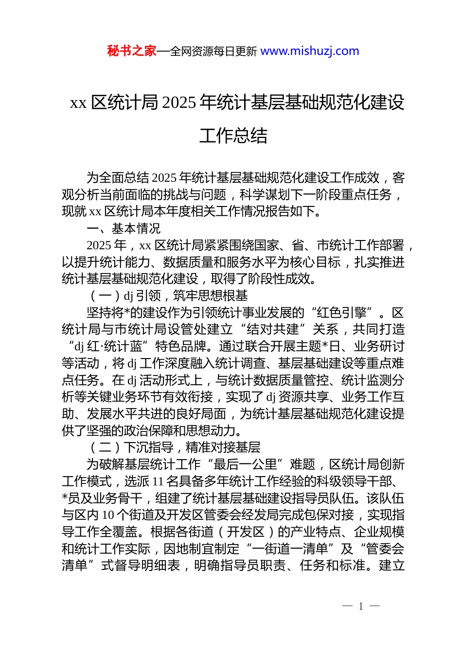 秘书之家—全网资源每日更新 www.mishuzj.comxx 区统计局 2025 年统计基层基础规范化建设工作总结为全面总结 2025 年统计基层基础规范化建设工作成效,客观分析当前面临的挑战与问题,科学谋划下一阶段重点任务,现就 xx 区统计局本年度相关工作情况报告如下。一、基本情况2025 年,xx 区统计局紧紧围绕国家、省、市统计工作部署,以提升统计能力、数据质量和服务水平为核心目标,扎实推进统计基层基础规范化建设,取得了阶段性成效。(一)dj 引领,筑牢思想根基坚持将*的建设作为引领统计事业发展的“红色引擎”。区统计局与市统计局设管处建立“结对共建”关系,共同打造“dj 红·统计蓝”特色品牌。通过联合开展主题*日、业务研讨等活动,将 dj 工作深度融入统计调查、基层基础建设等重点难点任务。在 dj 活动形式上,与统计数据质量管控、统计监测分析等关键业务环节有效衔接,实现了 dj 资源共享、业务工作互助、发展水平共进的良好局面,为统计基层基础规范化建设提供了坚强的政治保障和思想动力。(二)下沉指导,精准对接基层为破解基层统计工作“最后一公里”难题,区统计局创新工作模式,选派 11 名具备多年统计工作经验的科级领导干部、*员及业务骨干,组建了统计基层基础建设指导员队伍。该队伍与区内 10 个街道及开发区管委会经发局完成包保对接,实现指导工作全覆盖。根据各街道(开发区)的产业特点、企业规模和统计工作实际,因地制宜制定“一街道一清单”及“管委会清单”式督导明细表,明确指导员职责、任务和标准。建立— 1 —秘书之家—全网资源每日更新 www.mishuzj.com“月走访、月调研、月指导、月上报”工作机制,要求指导员深入一线,及时发现并解决基层统计工作中存在的具体问题,总结推广有效经验做法,确保规范化建设各项要求在基层落地生根、早出成效。截至 2025 年 10 月 22 日,指导员队伍累计开展下沉指导 220 余人次,形成专题调研报告 15 份,推动解决基层实际问题 80 余项。(三)制度筑基,规范工作流程着力构建覆盖统计工作全流程的制度体系,为规范化建设提供坚实保障。今年以来,区统计局系统梳理并出台《xx 区统计基层基础工作规范》《xx 区统计数据质量管理办法》《xx 区统计资料管理制度》等 10 余个规范性文件,对统计机构与人员职责、工作规范制定与落实、数据生产全流程管控、统计法治建设、保障措施等作出明确规定。通过制度体系的建立与完善,确保了基层统计工作有据可依、有章可循,有效规范了统计调查行为,夯实了数据质量根基。(四)工作成效量化评估通过上述举措,xx 区统计基层基础规范化建设取得显著进展。2025 年上半年,共完成常规统计项目 35 项,重点统计调查项目 8 项,经审核评估,统计数据质量合格率达到 97.5%。通过电话回访、问卷调查等方式,统计服务对象满意度为 94%。进入下半年,随着规范化建设的深入推进,各项工作指标持续向好。截至 10 月 22 日,下半年已完成常规统计项目 40 项,重点项目 10 项,统计数据质量合格率提升至 98.2%,统计服务满意度提升至 95.5%。二、存在问题在取得成绩的同时,对标新时代统计工作的新要求和高质量发展的新需要,当前统计基层基础规范化建设仍存在一些不容忽视的薄弱环节。(一)基层统计力量仍显薄弱— 2 —秘书之家—全网资源每日更新 www.mishuzj.com基层统计人员队伍建设是基础中的基础,但当前仍面临诸多挑战。一是人员配备不足与工作任务繁重的矛盾突出。部分街道(开发区)统计人员身兼数职,专职化程度不高,难以全身心投入日益复杂的统计工作。二是队伍稳定性不强。基层统计岗位流动性较大,新手多、老手少,工作经验难以有效积累和传承,影响了统计工作的连续性和数据质量的一致性。三是专业能力有待提升。部分基层统计人员对统计制度、指标理解不深不透,运用信息化手段开展工作的能力不足,难以适应统计现代化改革的新要求。(二)制度执行与协同机制有待完善虽然已建立起较为完善的制度体系,但在执行层面仍存在差距。一是部分基层单位对现有制度的理解和执行不够严格、不够到位,存在“上...