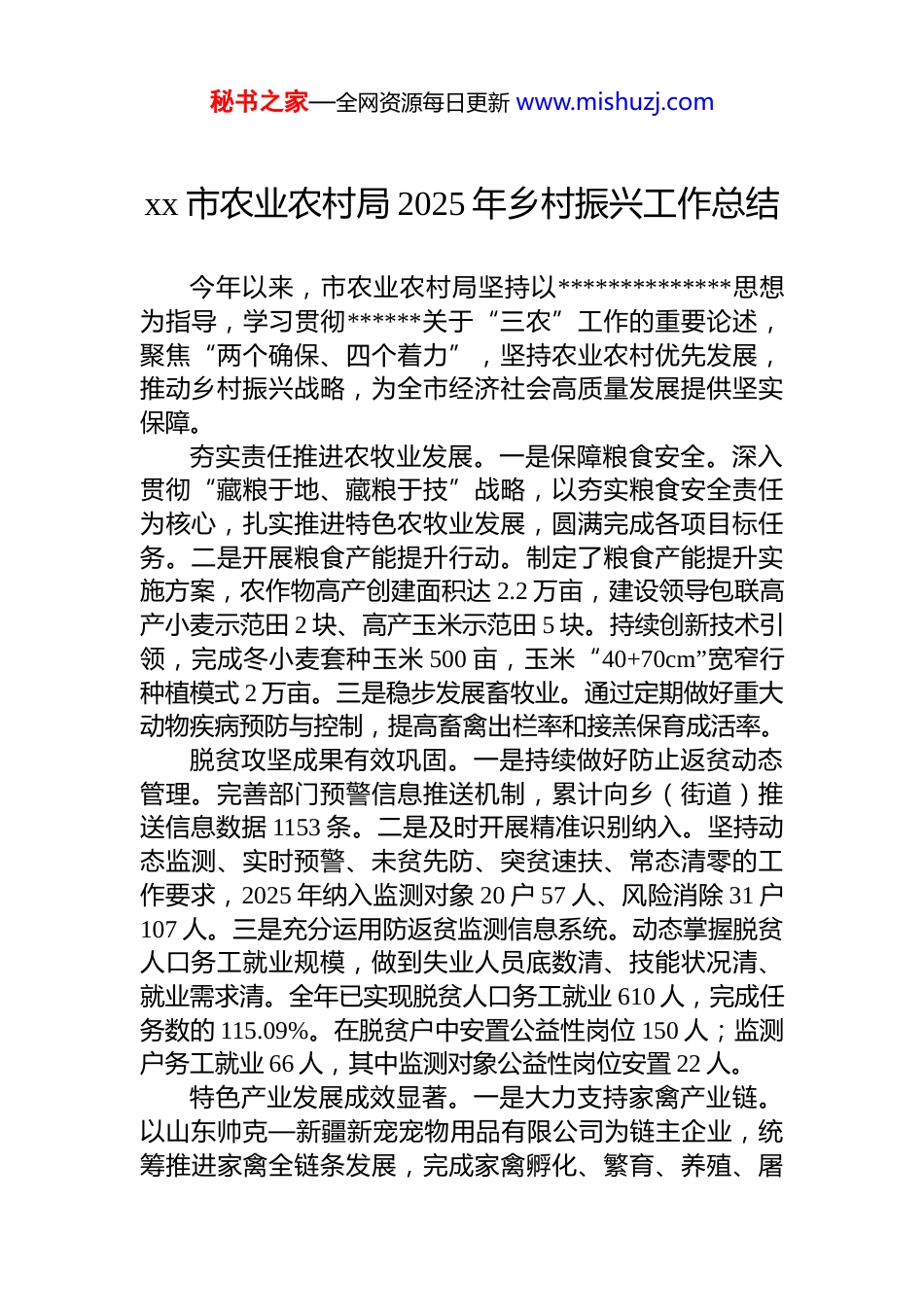 秘书之家—全网资源每日更新 www.mishuzj.comxx 市农业农村局 2025 年乡村振兴工作总结今年以来,市农业农村局坚持以**************思想为指导,学习贯彻******关于“三农”工作的重要论述,聚焦“两个确保、四个着力”,坚持农业农村优先发展,推动乡村振兴战略,为全市经济社会高质量发展提供坚实保障。夯实责任推进农牧业发展。一是保障粮食安全。深入贯彻“藏粮于地、藏粮于技”战略,以夯实粮食安全责任为核心,扎实推进特色农牧业发展,圆满完成各项目标任务。二是开展粮食产能提升行动。制定了粮食产能提升实施方案,农作物高产创建面积达 2.2 万亩,建设领导包联高产小麦示范田 2 块、高产玉米示范田 5 块。持续创新技术引领,完成冬小麦套种玉米 500 亩,玉米“40+70cm”宽窄行种植模式 2 万亩。三是稳步发展畜牧业。通过定期做好重大动物疾病预防与控制,提高畜禽出栏率和接羔保育成活率。脱贫攻坚成果有效巩固。一是持续做好防止返贫动态管理。完善部门预警信息推送机制,累计向乡(街道)推送信息数据 1153 条。二是及时开展精准识别纳入。坚持动态监测、实时预警、未贫先防、突贫速扶、常态清零的工作要求,2025 年纳入监测对象 20 户 57 人、风险消除 31 户107 人。三是充分运用防返贫监测信息系统。动态掌握脱贫人口务工就业规模,做到失业人员底数清、技能状况清、就业需求清。全年已实现脱贫人口务工就业 610 人,完成任务数的 115.09%。在脱贫户中安置公益性岗位 150 人;监测户务工就业 66 人,其中监测对象公益性岗位安置 22 人。特色产业发展成效显著。一是大力支持家禽产业链。以山东帅克—新疆新宠宠物用品有限公司为链主企业,统筹推进家禽全链条发展,完成家禽孵化、繁育、养殖、屠秘书之家—全网资源每日更新 www.mishuzj.com宰、加工、饲料加工等产业链条,已带动稳定就业 1113 人,人均增收 5 万元。二是发展特色花卉产业,形成了从花卉种植、运输、销售到技术培训、观光旅游等多元融合的全产业链,鲜切花产量达 60 万支,苗木出口 5 万株,产值达 xx万元,同比增长 400%,成为农业产值新的增长点。同时,采取“免费建设大棚、统一供苗、统一种植、统一收购”全链条帮扶举措,选取 10 户“样板户”利用闲置院落种植鲜切花,预计农均增收 6111 元。三是发展庭院蔬菜种植。大力谋划以庭院经济为主的为民增收产业体系,委托花之恋合作社以高于市场批发价的价格,统一收购村民庭院蔬菜,销往周边园区、工地及餐厅,425 户农户参与庭院蔬菜种植,收入 2000 元以上的农户达 11 户。四是加强品牌化创建。依托 xx 特色产业发展优势,按照“因地制宜、突出特色、统一规划、区域布局”的原则,深挖农村特色资源,推动乡村产业发展,不断整合资源,采取“企业+合作社+农户”“企业+村集体经济组织”等方式,指导协助农业经营主体完成自主品牌创建并取得良好成绩。成功申报“名特优新”农产品企业 1 家(xx 白羽鸡肉),认证“绿色食品”企业 1 家(xx 莫乎尔牧场)、绿色食品 4 个(莫乎尔农牧业投资有限公司红提葡萄、蟠桃、油桃、新梅)。截至目前,全市累计认证绿色食品 9 个、“名特优新”农产品5 个。推动人居环境持续改善。一是乡(街道)扎实开展村庄清洁系列行动,已累计清理农村生活垃圾 12987 吨、规范停放农机 39 起、清理残垣断壁(旧广告、横幅)57 处、发动农民群众投工 4753 人次、入户宣传 4524 人次,持续推进村庄绿化美化亮化。二是统筹推进厕所粪污和农村生活污水协同治理,完善农民参与和长效管护机制,加强农村黑臭水体动态排查和源头治理,农村生活污水治理管控率达61.53%%。三是 2025 年新改建农村卫生厕所 500 座,已完成 500 座。四是通过营造防治农业面源污染的社会氛围、加秘书之家—全网资源每日更新 www.mishuzj.com强农业资源循环利用、加大农业投入品的监管力度及招商引资能源与环境相关加工企业等措施,建成 1 个通过加工林果业废树枝、果壳或农作物秸秆加工成燃料及饲料的企业和 2 个通过家禽产业链前段排除的粪污转化成生物有机肥企业...