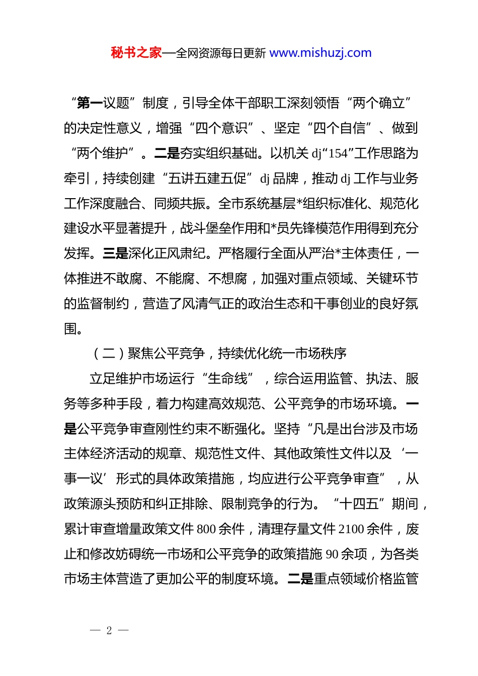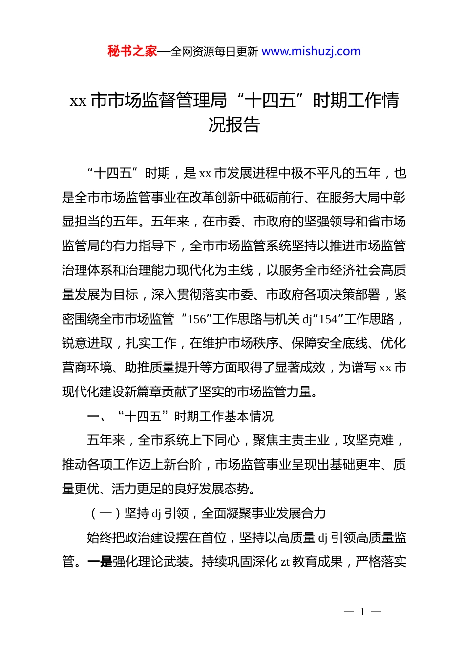 秘书之家—全网资源每日更新 www.mishuzj.comxx 市市场监督管理局“十四五”时期工作情况报告“十四五”时期,是 xx 市发展进程中极不平凡的五年,也是全市市场监管事业在改革创新中砥砺前行、在服务大局中彰显担当的五年。五年来,在市委、市政府的坚强领导和省市场监管局的有力指导下,全市市场监管系统坚持以推进市场监管治理体系和治理能力现代化为主线,以服务全市经济社会高质量发展为目标,深入贯彻落实市委、市政府各项决策部署,紧密围绕全市市场监管“156”工作思路与机关 dj“154”工作思路,锐意进取,扎实工作,在维护市场秩序、保障安全底线、优化营商环境、助推质量提升等方面取得了显著成效,为谱写 xx 市现代化建设新篇章贡献了坚实的市场监管力量。一、“十四五”时期工作基本情况五年来,全市系统上下同心,聚焦主责主业,攻坚克难,推动各项工作迈上新台阶,市场监管事业呈现出基础更牢、质量更优、活力更足的良好发展态势。(一)坚持 dj 引领,全面凝聚事业发展合力始终把政治建设摆在首位,坚持以高质量 dj 引领高质量监管。一是强化理论武装。持续巩固深化 zt 教育成果,严格落实— 1 —秘书之家—全网资源每日更新 www.mishuzj.com“第一议题”制度,引导全体干部职工深刻领悟“两个确立”的决定性意义,增强“四个意识”、坚定“四个自信”、做到“两个维护”。二是夯实组织基础。以机关 dj“154”工作思路为牵引,持续创建“五讲五建五促”dj 品牌,推动 dj 工作与业务工作深度融合、同频共振。全市系统基层*组织标准化、规范化建设水平显著提升,战斗堡垒作用和*员先锋模范作用得到充分发挥。三是深化正风肃纪。严格履行全面从严治*主体责任,一体推进不敢腐、不能腐、不想腐,加强对重点领域、关键环节的监督制约,营造了风清气正的政治生态和干事创业的良好氛围。(二)聚焦公平竞争,持续优化统一市场秩序立足维护市场运行“生命线”,综合运用监管、执法、服务等多种手段,着力构建高效规范、公平竞争的市场环境。一是公平竞争审查刚性约束不断强化。坚持“凡是出台涉及市场主体经济活动的规章、规范性文件、其他政策性文件以及‘一事一议’形式的具体政策措施,均应进行公平竞争审查”,从政策源头预防和纠正排除、限制竞争的行为。“十四五”期间,累计审查增量政策文件 800 余件,清理存量文件 2100 余件,废止和修改妨碍统一市场和公平竞争的政策措施 90 余项,为各类市场主体营造了更加公平的制度环境。二是重点领域价格监管— 2 —秘书之家—全网资源每日更新 www.mishuzj.com精准有效。围绕节假日等重要时段,聚焦教育、医疗、殡葬、停车收费等民生领域,组织开展价格专项整治和监督检查。通过召开提醒告诫会、发放提醒告诫函、签订价格承诺书等方式,引导经营者加强价格自律,累计纠正不正当价格行为 350 余起,全力确保了市场价格秩序稳定。三是消费维权服务效能显著提升。持续畅通 12315 投诉举报渠道,优化办理流程,压缩处理时限,投诉举报按时办结率达 99%以上。“十四五”期间,全市共接收处理消费者投诉举报 21.5 万件,为消费者挽回经济损失约 1.2 亿元。深入实施优化消费环境三年行动,规范化建设消费维权服务站 450 个,将维权触角延伸至社区、商场和企业,有效便捷了消费维权“最后一公里”。四是综合执法震慑作用充分彰显。聚焦关系群众切身利益的突出问题,统筹推进反不正当竞争、打击侵权假冒、整治虚假违法广告、网络市场监管等多个专项执法行动,累计查办各类违法案件 1.8 万件,罚没款 2.5 亿元。在全省市场监管系统第二届执法稽查专业技能大比武中,我市代表队荣获团体二等奖。2024 年,侵权假冒伪劣商品全国统一销毁行动主会场活动在我市成功举办,有力震慑了违法犯罪行为,展示了 xx 市打击侵权假冒的坚定决心和工作成效。(三)严守安全底线,全力保障民生福祉安康— 3 —秘书之家—全网资源每日更新 www.mishuzj.com始终坚持人民至上、生命至上,以“四个最严”要求为根本遵循,坚决筑牢食品、药品、特种设备和重要工业产品质量安全防线,人民群众的获得感、幸...