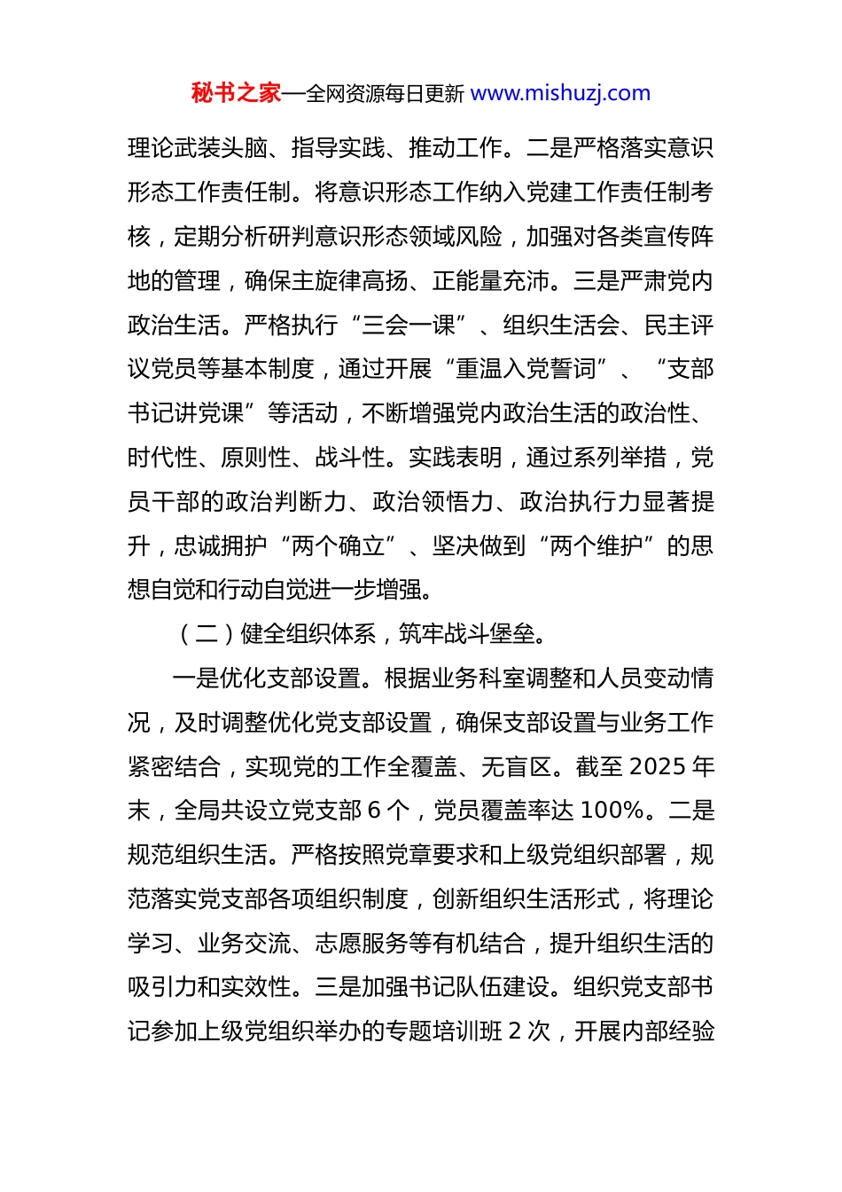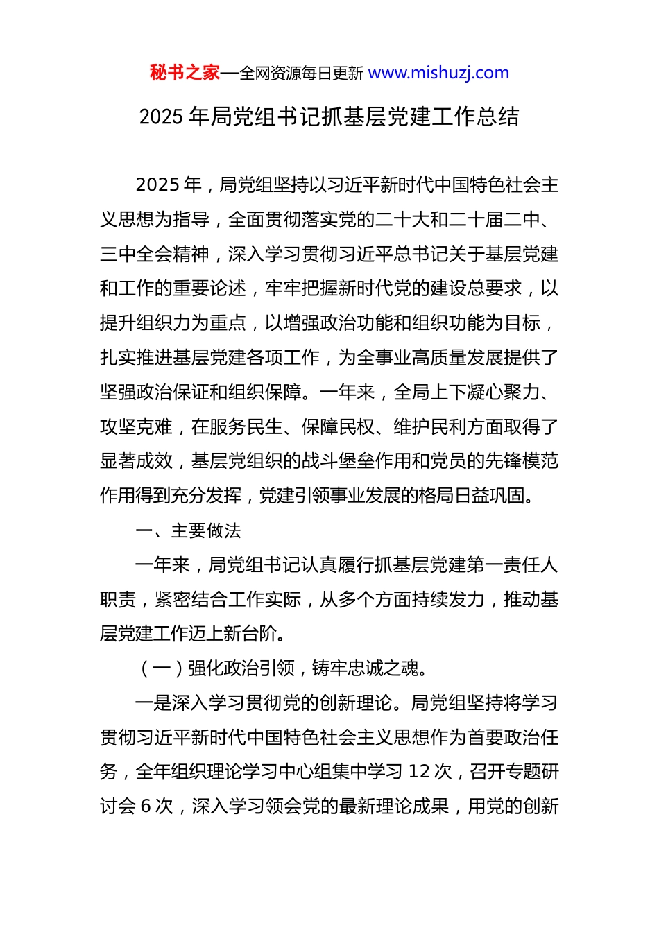秘书之家—全网资源每日更新 www.mishuzj.com2025 年局党组书记抓基层党建工作总结 2025 年,局党组坚持以习近平新时代中国特色社会主义思想为指导,全面贯彻落实党的二十大和二十届二中、三中全会精神,深入学习贯彻习近平总书记关于基层党建和工作的重要论述,牢牢把握新时代党的建设总要求,以提升组织力为重点,以增强政治功能和组织功能为目标,扎实推进基层党建各项工作,为全事业高质量发展提供了坚强政治保证和组织保障。一年来,全局上下凝心聚力、攻坚克难,在服务民生、保障民权、维护民利方面取得了显著成效,基层党组织的战斗堡垒作用和党员的先锋模范作用得到充分发挥,党建引领事业发展的格局日益巩固。一、主要做法一年来,局党组书记认真履行抓基层党建第一责任人职责,紧密结合工作实际,从多个方面持续发力,推动基层党建工作迈上新台阶。(一)强化政治引领,铸牢忠诚之魂。一是深入学习贯彻党的创新理论。局党组坚持将学习贯彻习近平新时代中国特色社会主义思想作为首要政治任务,全年组织理论学习中心组集中学习 12 次,召开专题研讨会 6 次,深入学习领会党的最新理论成果,用党的创新秘书之家—全网资源每日更新 www.mishuzj.com理论武装头脑、指导实践、推动工作。二是严格落实意识形态工作责任制。将意识形态工作纳入党建工作责任制考核,定期分析研判意识形态领域风险,加强对各类宣传阵地的管理,确保主旋律高扬、正能量充沛。三是严肃党内政治生活。严格执行“三会一课”、组织生活会、民主评议党员等基本制度,通过开展“重温入党誓词”、“支部书记讲党课”等活动,不断增强党内政治生活的政治性、时代性、原则性、战斗性。实践表明,通过系列举措,党员干部的政治判断力、政治领悟力、政治执行力显著提升,忠诚拥护“两个确立”、坚决做到“两个维护”的思想自觉和行动自觉进一步增强。(二)健全组织体系,筑牢战斗堡垒。一是优化支部设置。根据业务科室调整和人员变动情况,及时调整优化党支部设置,确保支部设置与业务工作紧密结合,实现党的工作全覆盖、无盲区。截至 2025 年末,全局共设立党支部 6 个,党员覆盖率达 100%。二是规范组织生活。严格按照党章要求和上级党组织部署,规范落实党支部各项组织制度,创新组织生活形式,将理论学习、业务交流、志愿服务等有机结合,提升组织生活的吸引力和实效性。三是加强书记队伍建设。组织党支部书记参加上级党组织举办的专题培训班 2 次,开展内部经验秘书之家—全网资源每日更新 www.mishuzj.com交流会 3 次,着力提升支部书记的政治理论水平、组织协调能力和党务工作技能,确保支部书记“懂党务、善管理、会服务”。据统计,各支部书记履职能力平均提升15%,有效激活了基层党建的“神经末梢”。(三)深化党建业务融合,赋能事业发展。一是探索“党建+服务”模式。以党建为引领,推动服务项目化、品牌化。例如,在养老服务领域,推行“支部结对社区、党员联系老人”机制,组建党员志愿服务队 3支,常态化开展助老服务,帮助解决老年人实际困难 200余项。二推动重点民生项目落地。围绕委政府中心工作和群众关切,将党建工作融入社会救助、儿童福利、基层治理等重点业务。在推进智慧养老平台建设中,成立党员攻坚小组,倒排工期、挂图作战,确保平台如期上线,惠及全 3 万余名老年人。三是激发干部担当作为。通过设立“党员先锋岗”、“党员责任区”,引导党员干部在急难险重任务中冲锋在前,在服务群众一线展现作为。在应对突发自然灾害时,局党员干部第一时间响应,投身救灾安置工作,以实际行动诠释了为民情怀。(四)锻造过硬队伍,发挥先锋作用。一是加强党员教育管理。坚持严管与厚爱相结合,定期组织党员进行党性分析,开展批评与自我批评,引导党秘书之家—全网资源每日更新 www.mishuzj.com员牢记身份、永葆本色。创新教育形式,利用红色教育基地、廉政教育基地等开展现场教学,增强教育的感染力。二是开展主题实践活动。结合“党员政治生日”、“我为群众办实事”等活动,引导党员立足岗位、履职尽责。全年共为群众办实事好事 150 余件,得到了服务对象的一...
