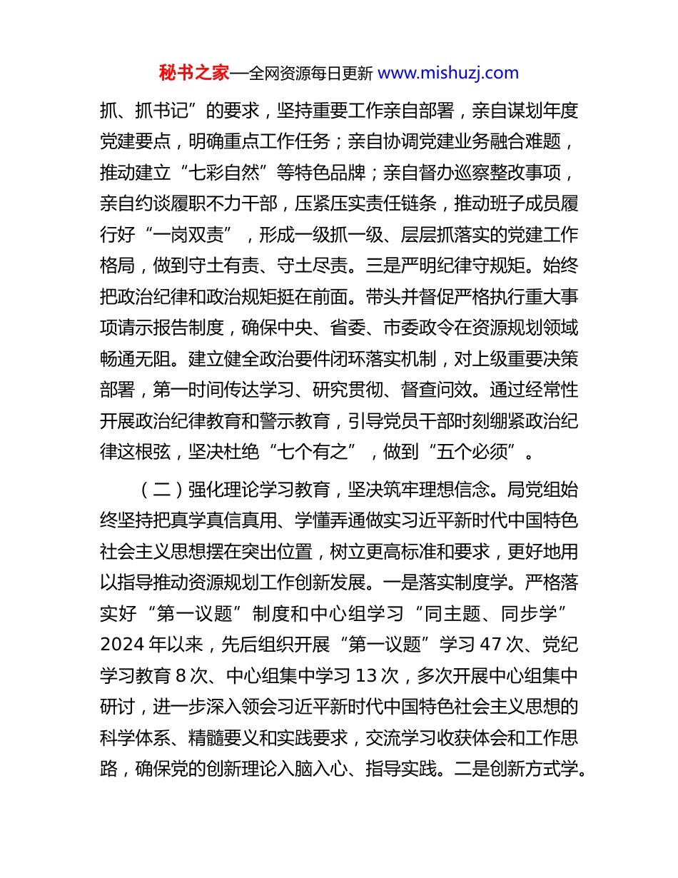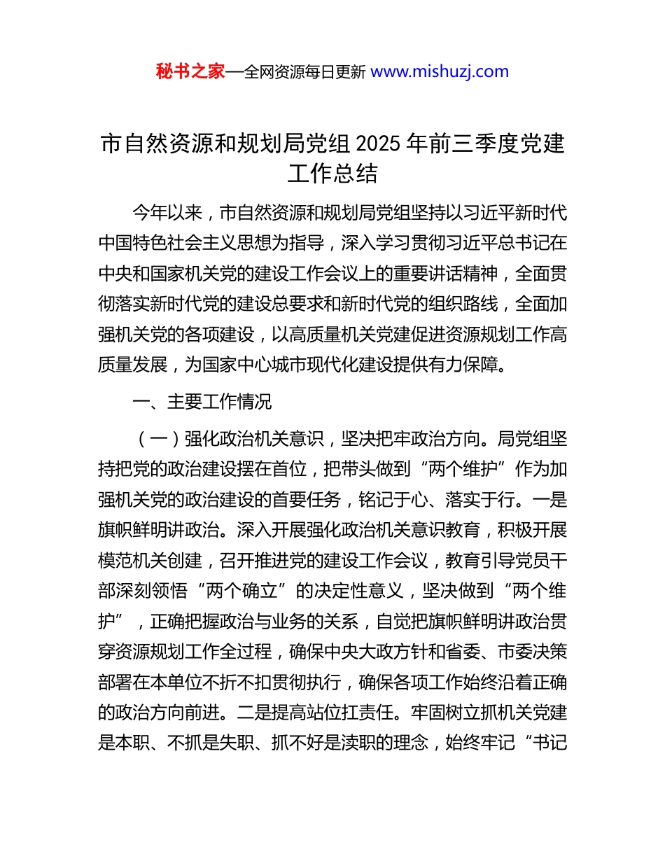秘书之家—全网资源每日更新 www.mishuzj.com市自然资源和规划局党组 2025 年前三季度党建工作总结今年以来,市自然资源和规划局党组坚持以习近平新时代中国特色社会主义思想为指导,深入学习贯彻习近平总书记在中央和国家机关党的建设工作会议上的重要讲话精神,全面贯彻落实新时代党的建设总要求和新时代党的组织路线,全面加强机关党的各项建设,以高质量机关党建促进资源规划工作高质量发展,为国家中心城市现代化建设提供有力保障。一、主要工作情况(一)强化政治机关意识,坚决把牢政治方向。局党组坚持把党的政治建设摆在首位,把带头做到“两个维护”作为加强机关党的政治建设的首要任务,铭记于心、落实于行。一是旗帜鲜明讲政治。深入开展强化政治机关意识教育,积极开展模范机关创建,召开推进党的建设工作会议,教育引导党员干部深刻领悟“两个确立”的决定性意义,坚决做到“两个维护”,正确把握政治与业务的关系,自觉把旗帜鲜明讲政治贯穿资源规划工作全过程,确保中央大政方针和省委、市委决策部署在本单位不折不扣贯彻执行,确保各项工作始终沿着正确的政治方向前进。二是提高站位扛责任。牢固树立抓机关党建是本职、不抓是失职、抓不好是渎职的理念,始终牢记“书记秘书之家—全网资源每日更新 www.mishuzj.com抓、抓书记”的要求,坚持重要工作亲自部署,亲自谋划年度党建要点,明确重点工作任务;亲自协调党建业务融合难题,推动建立“七彩自然”等特色品牌;亲自督办巡察整改事项,亲自约谈履职不力干部,压紧压实责任链条,推动班子成员履行好“一岗双责”,形成一级抓一级、层层抓落实的党建工作格局,做到守土有责、守土尽责。三是严明纪律守规矩。始终把政治纪律和政治规矩挺在前面。带头并督促严格执行重大事项请示报告制度,确保中央、省委、市委政令在资源规划领域畅通无阻。建立健全政治要件闭环落实机制,对上级重要决策部署,第一时间传达学习、研究贯彻、督查问效。通过经常性开展政治纪律教育和警示教育,引导党员干部时刻绷紧政治纪律这根弦,坚决杜绝“七个有之”,做到“五个必须”。(二)强化理论学习教育,坚决筑牢理想信念。局党组始终坚持把真学真信真用、学懂弄通做实习近平新时代中国特色社会主义思想摆在突出位置,树立更高标准和要求,更好地用以指导推动资源规划工作创新发展。一是落实制度学。严格落实好“第一议题”制度和中心组学习“同主题、同步学”2024 年以来,先后组织开展“第一议题”学习 47 次、党纪学习教育 8 次、中心组集中学习 13 次,多次开展中心组集中研讨,进一步深入领会习近平新时代中国特色社会主义思想的科学体系、精髓要义和实践要求,交流学习收获体会和工作思路,确保党的创新理论入脑入心、指导实践。二是创新方式学。秘书之家—全网资源每日更新 www.mishuzj.com采取“走出去”“请进来”相结合的方式加强理论学习教育,共组织外出到何家冲干部学院、红旗渠干部学院开展培训 4批次,培训干部 278 人次;开办“机关大讲堂”,邀请专家教授来局辅导授课 9 次;组织开展“人人讲党课”活动,县处级以上党员领导干部定期讲党课 38 次,各级党组织书记交叉讲党课 56 次。三是联系实际学。2024 年 11 月,《习近平关于自然资源工作论述摘编》出版发行后,局党组立即联系购买 200 余册作为案头卷、手边书,并将学习宣传贯彻《论述摘编》列入党员干部 2025 年度教育培训内容和支部学习计划,全体党员干部带着问题深学,交流讨论研学,围绕耕地“非粮化”、存量土地处置等难题,开展“学论述、话担当”专题研讨,推动学用结合,将学习成果转化为解决耕地保护、空间规划、生态修复等重点工作的具体举措。(三)强化基层组织建设,建强支部战斗堡垒。局党组坚持把增强基层党组织凝聚力,作为一项基础工程、长期工程常抓不懈。一是建强支部班子队伍。坚持把选优配强党支部书记作为重中之重,注重把政治强、业务精、作风好、群众认可的党员业务骨干充实到班子中,先后调整完善基层党组织 21 个。建立支部书记定期培训和述职评议制度,大力推进党支部标准化规范化建设,目前 57 个...